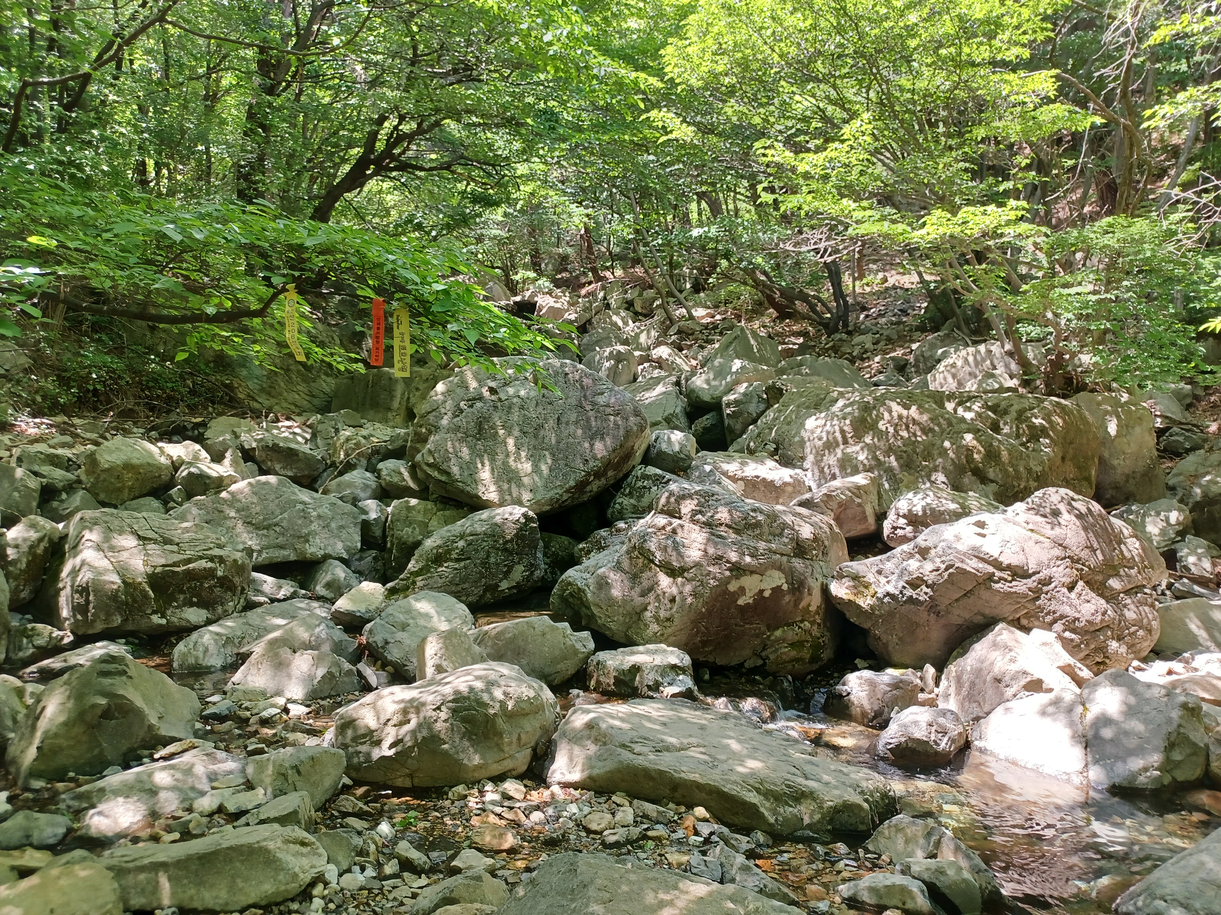 계류를 건너고, 이정목의 방향에 표기되지 않은 뒤편으로 빠져든다.