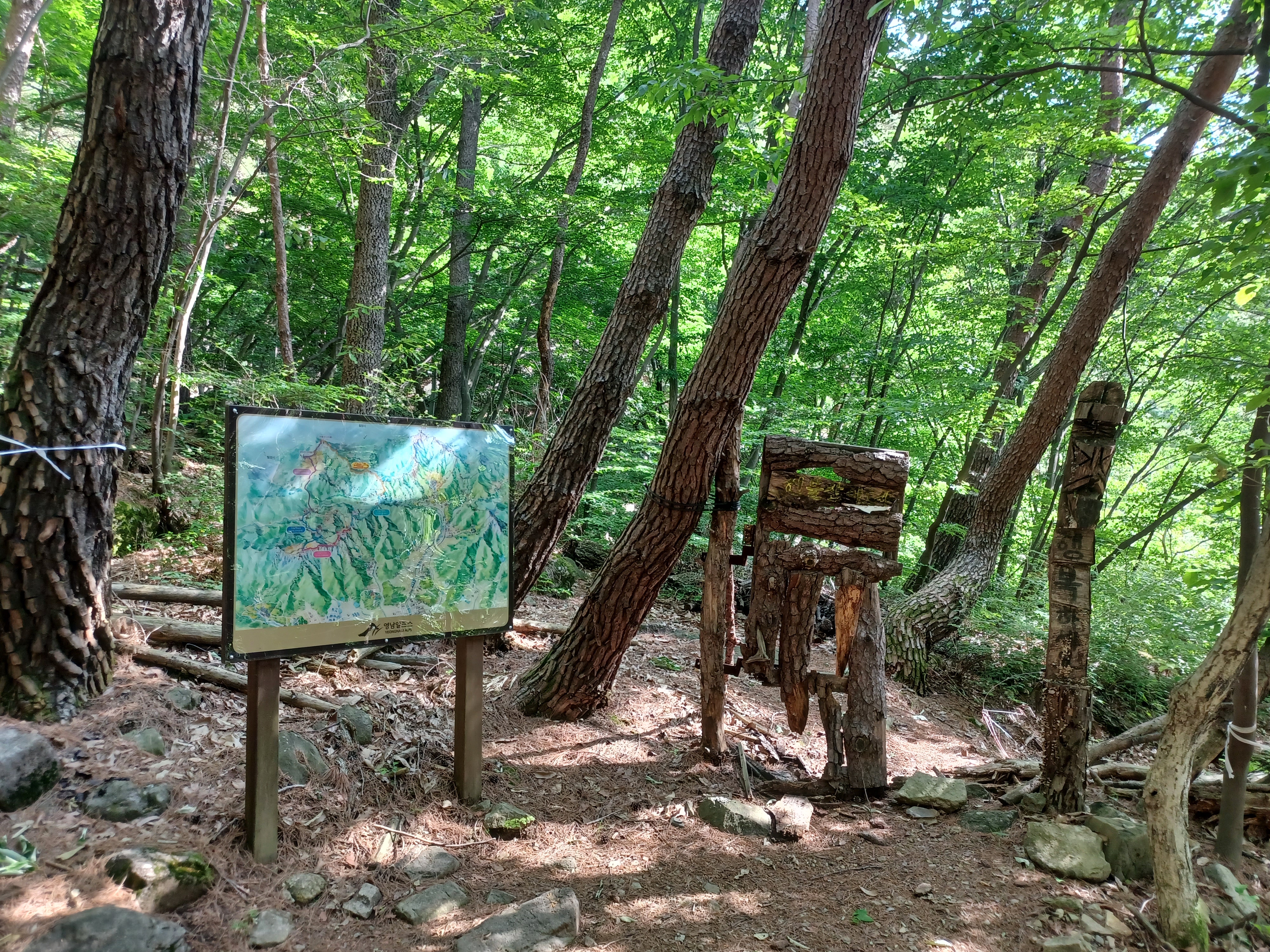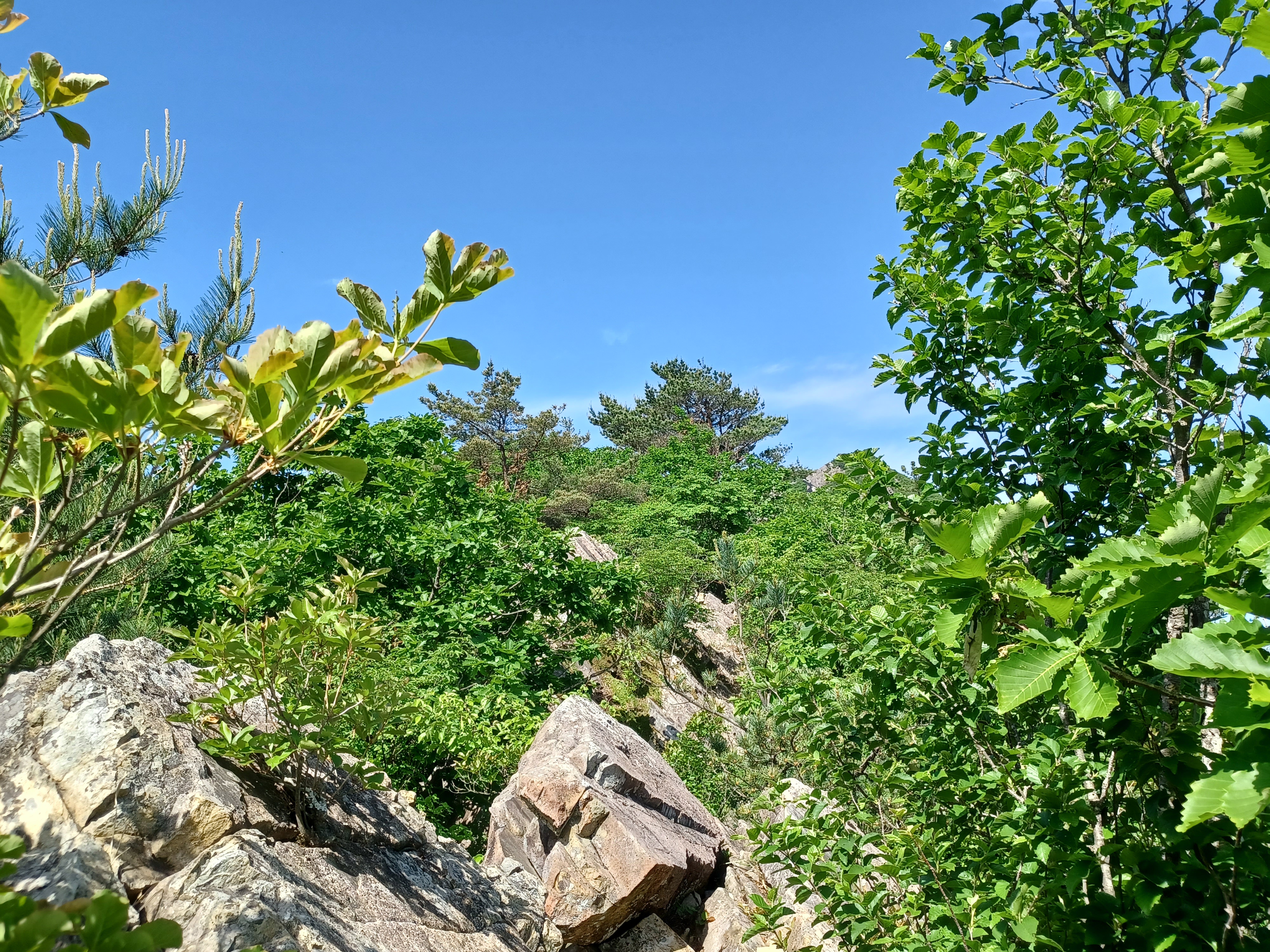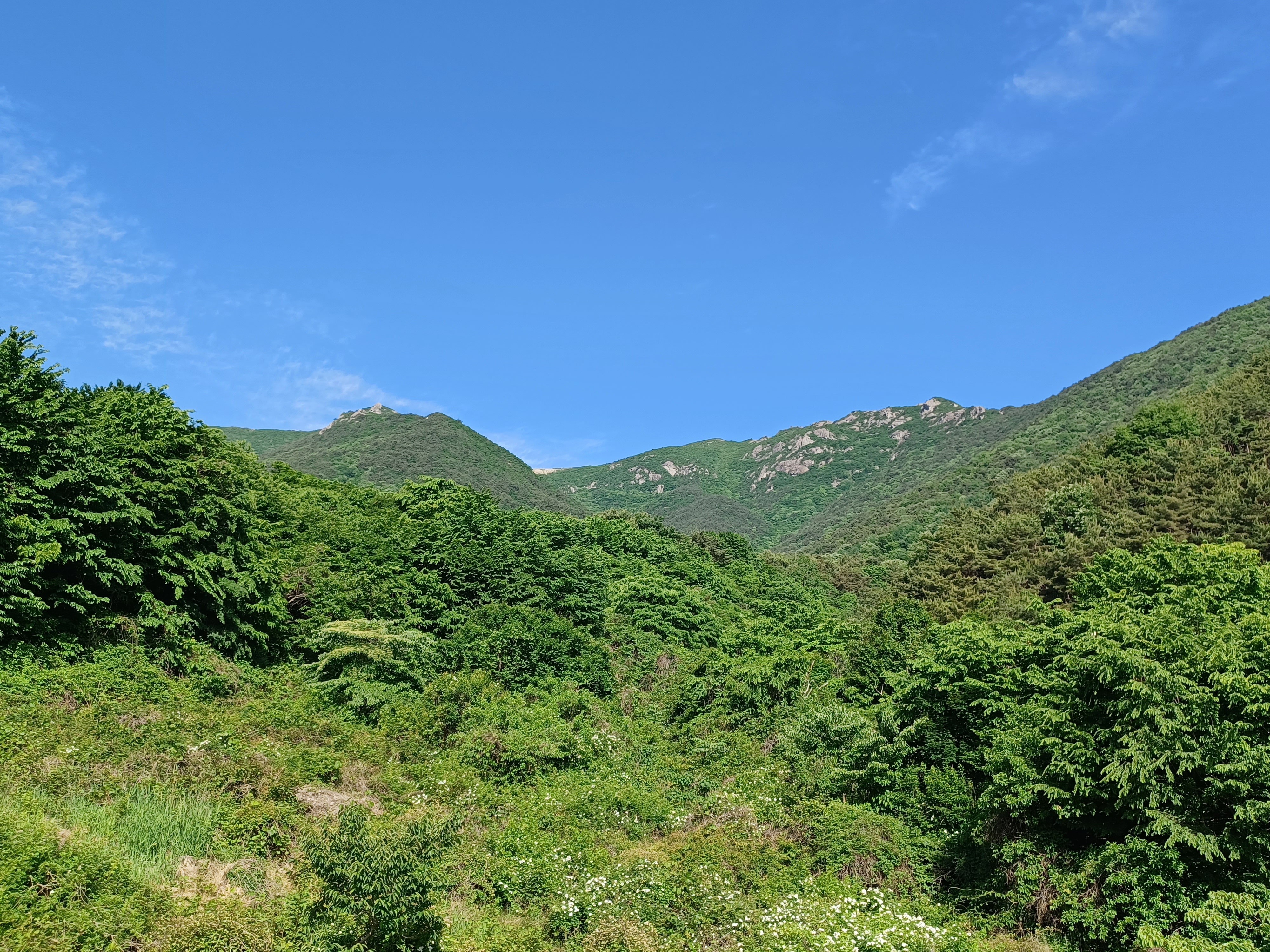 계류를 건너고, 이후 볼거리 즐길거리 없는 된비알을 30분남짓 치고 오르면 자수정나라에서 오르는 능선으로 합류한다.