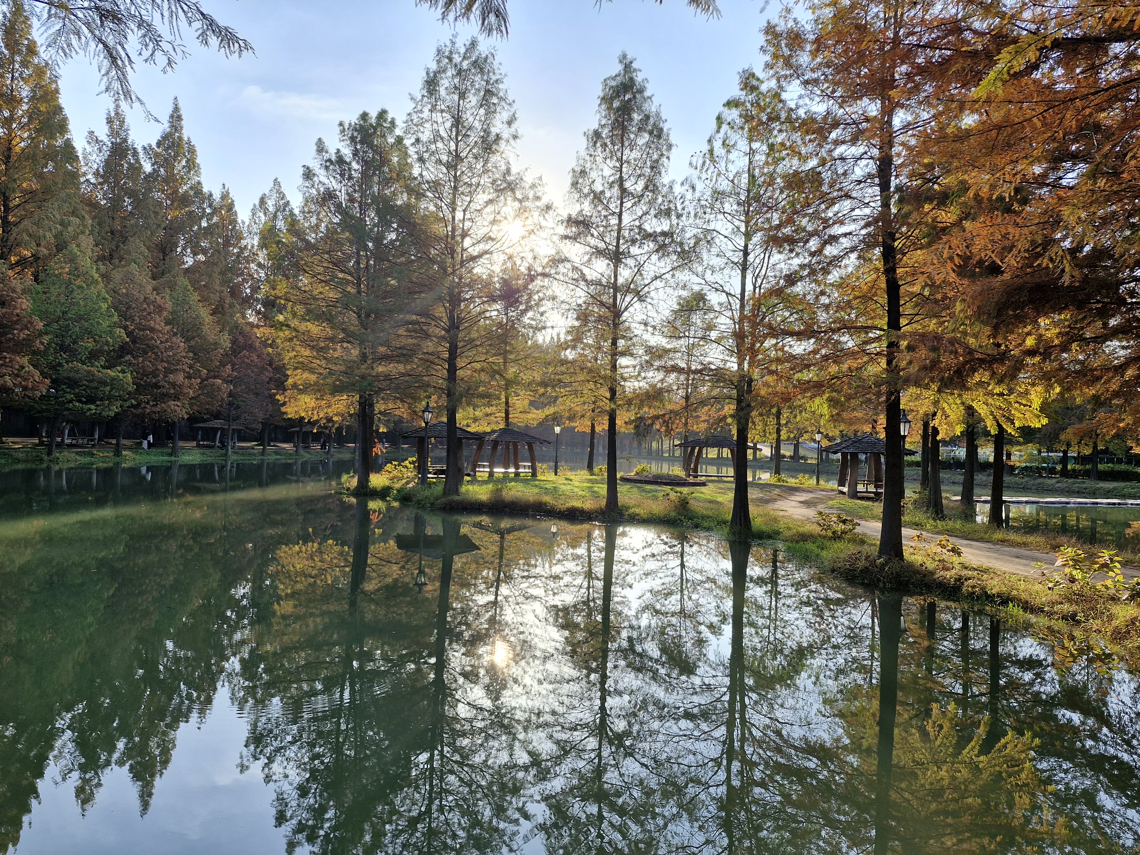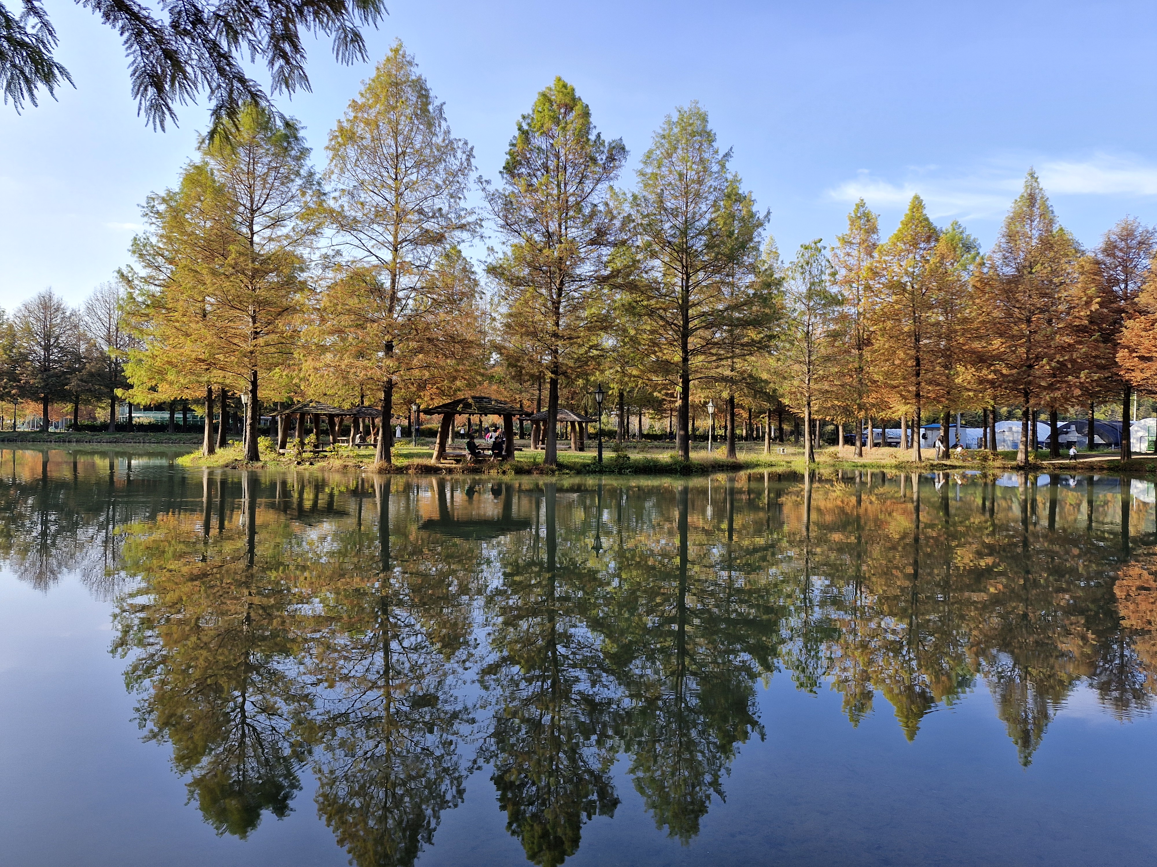 잔잔한 수변에 비치는 메타세쿼이아 반영들이 너무 멋지다.