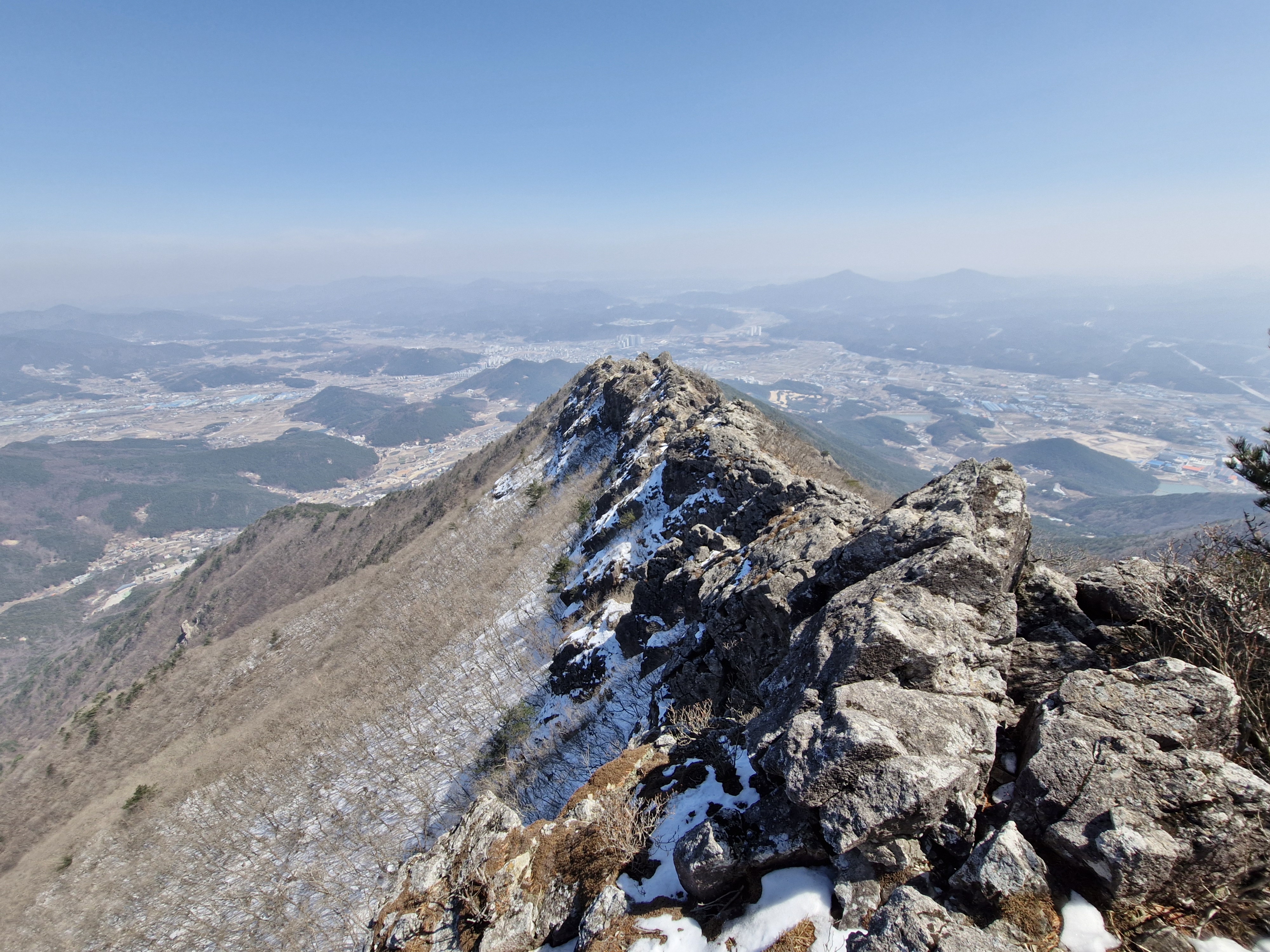 첫 번째 조망바위에 오르니 칼바위 아래쪽은 잔설이 선명하게 보인다.