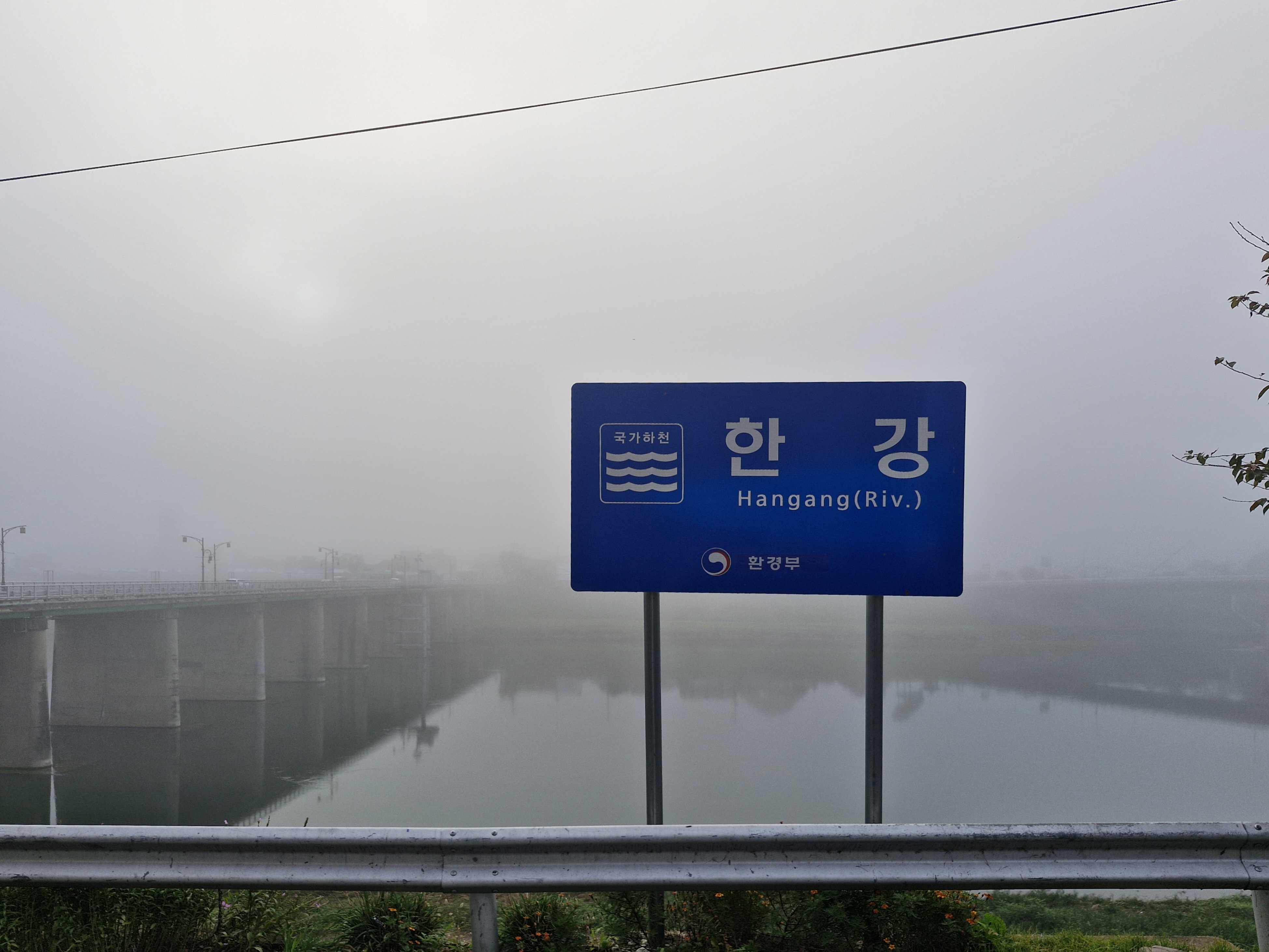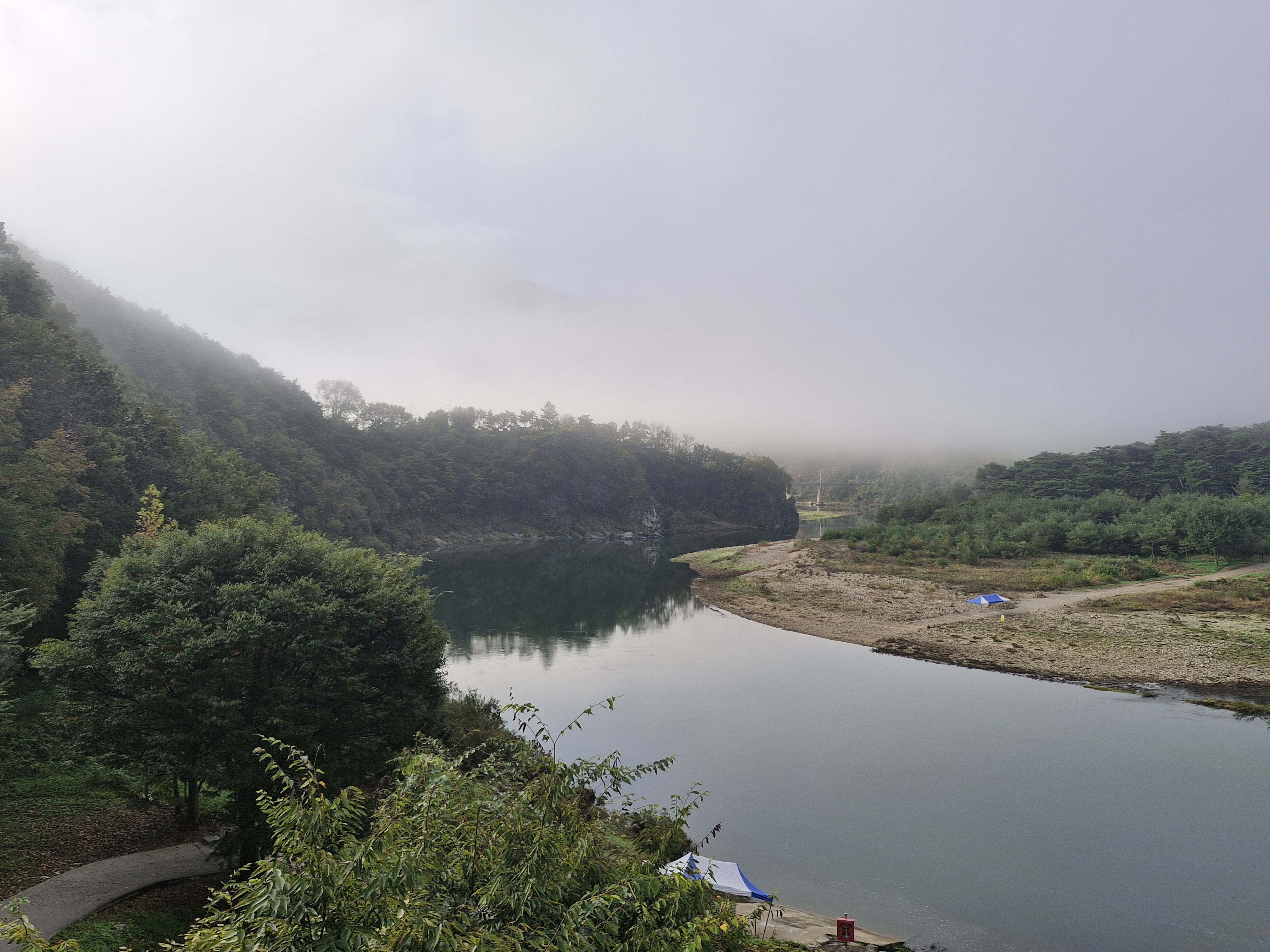 숙소에서 본 영월대교와 시가지는 안개로 자욱하다.