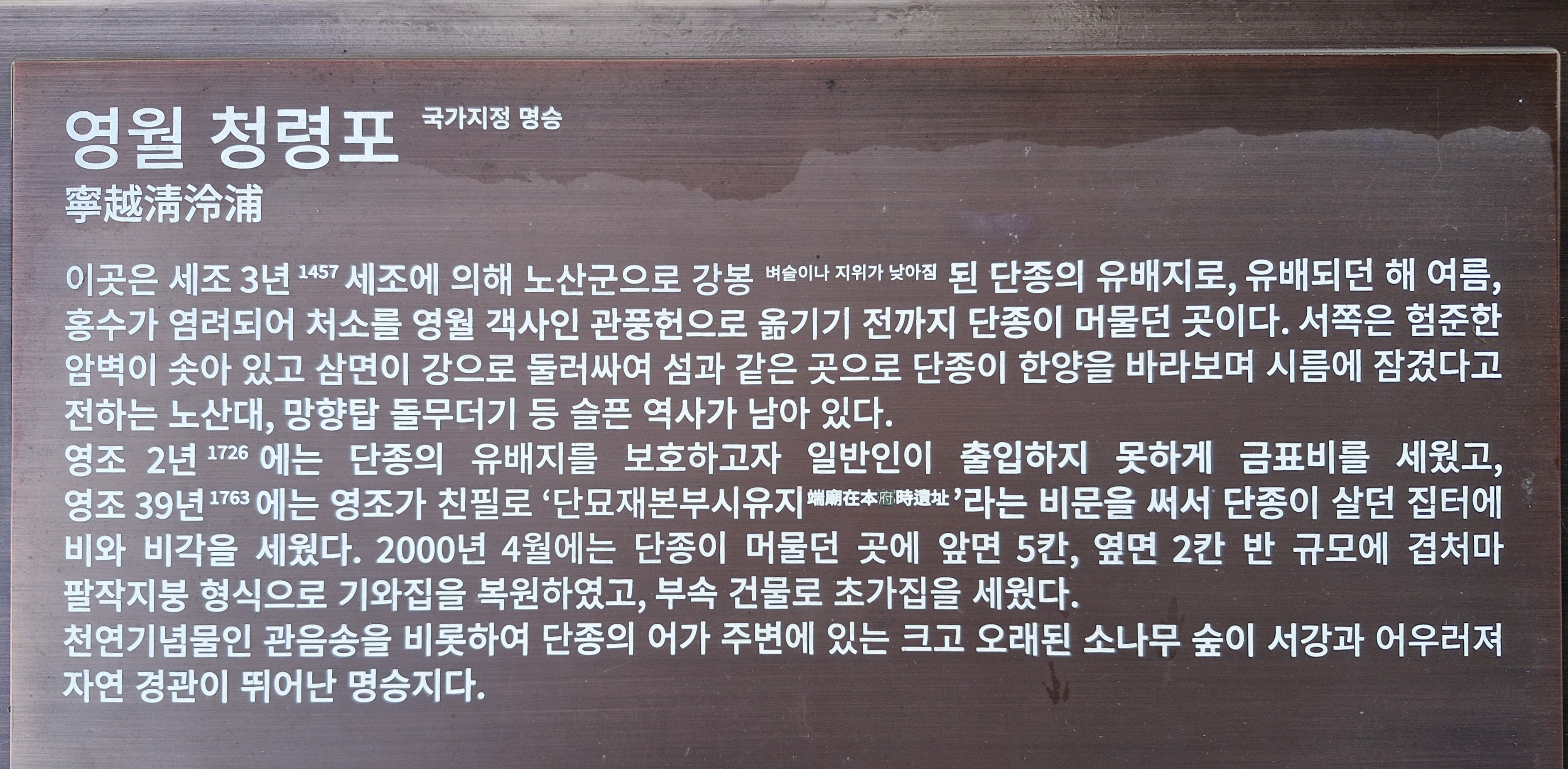 이곳은 1457년(세조 3) 세조(世祖)에 의해 노산군(魯山君)으로 강봉 된 단종의 유배지로, 그 해 여름 홍수로 서강이 범람하여 처소를 영월 객사인 관풍헌(觀風軒)으로 옮기기 전까지 단종이 머물던 곳이라고...