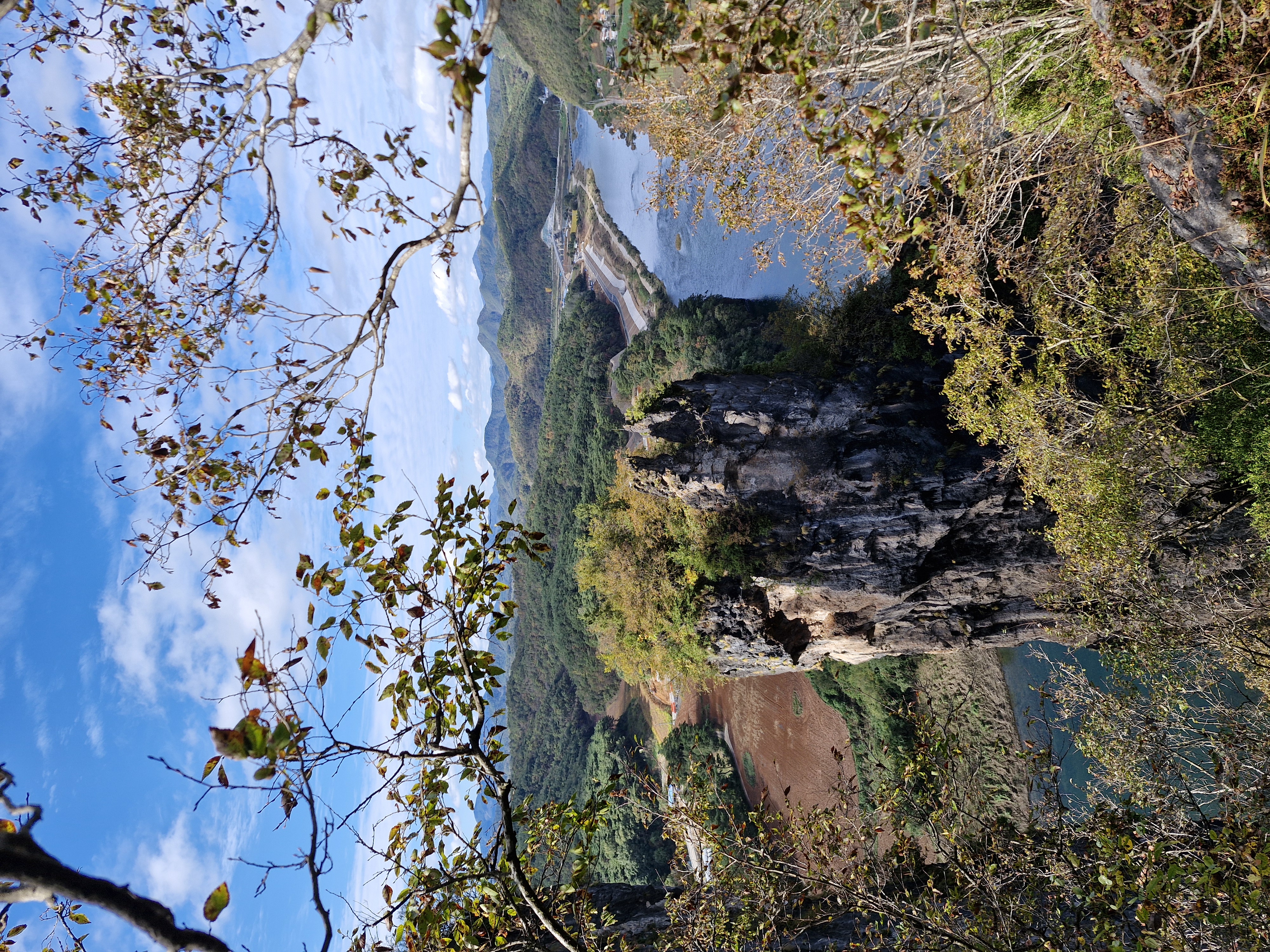 나무숲 사이로 위쪽에서 보는 다른 방향의 선돌을 조망하고...