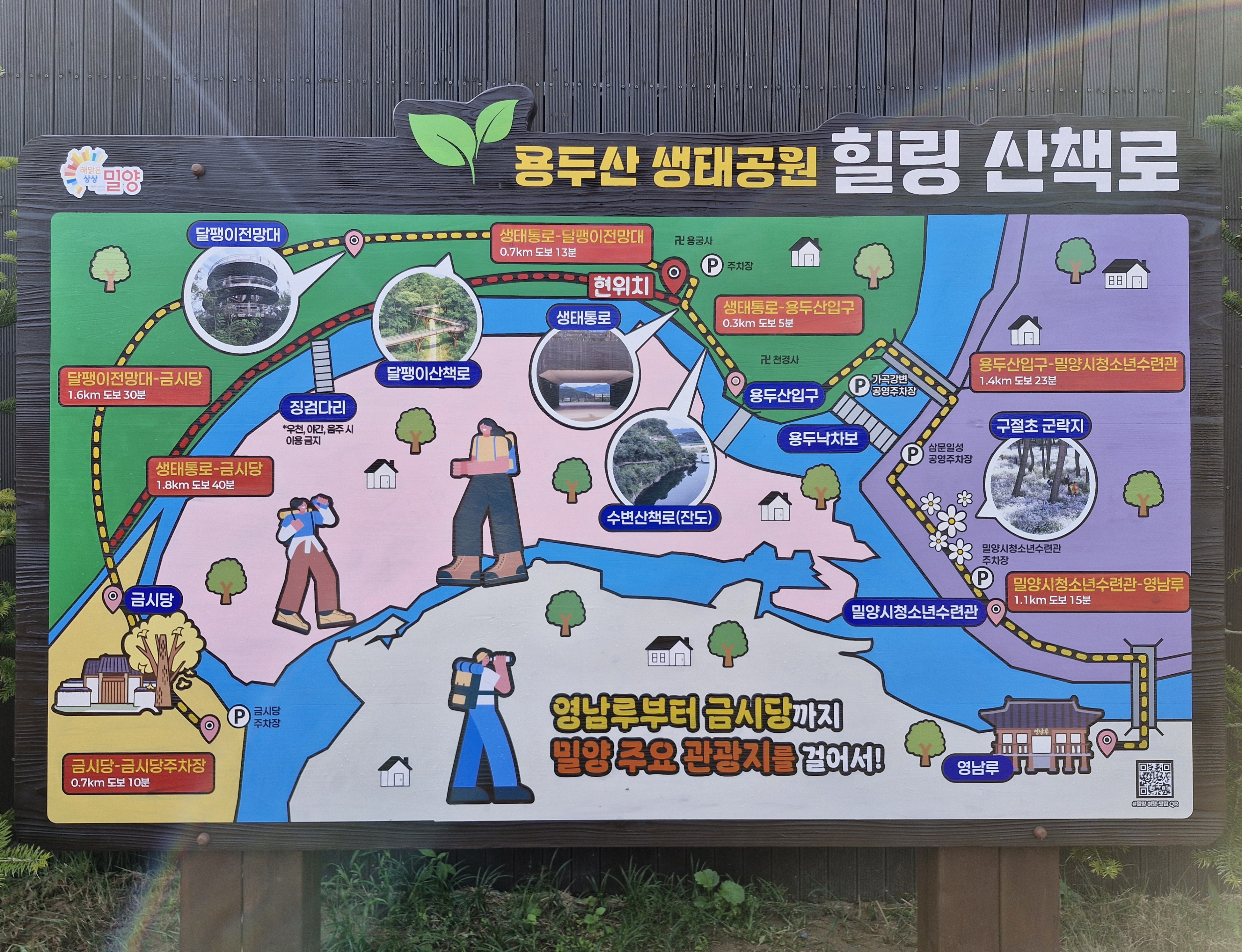 영남루에서 구절초 군락지와 소나무 숲을 지나 절벽에 매달린 아찔한 잔도를 걷고, 달팽이 전망대를 지나 500년 된 고택 금시당까지 5km 코스의 ‘용두산생태공원 힐링 산책길’이라고 안내되어 있다.