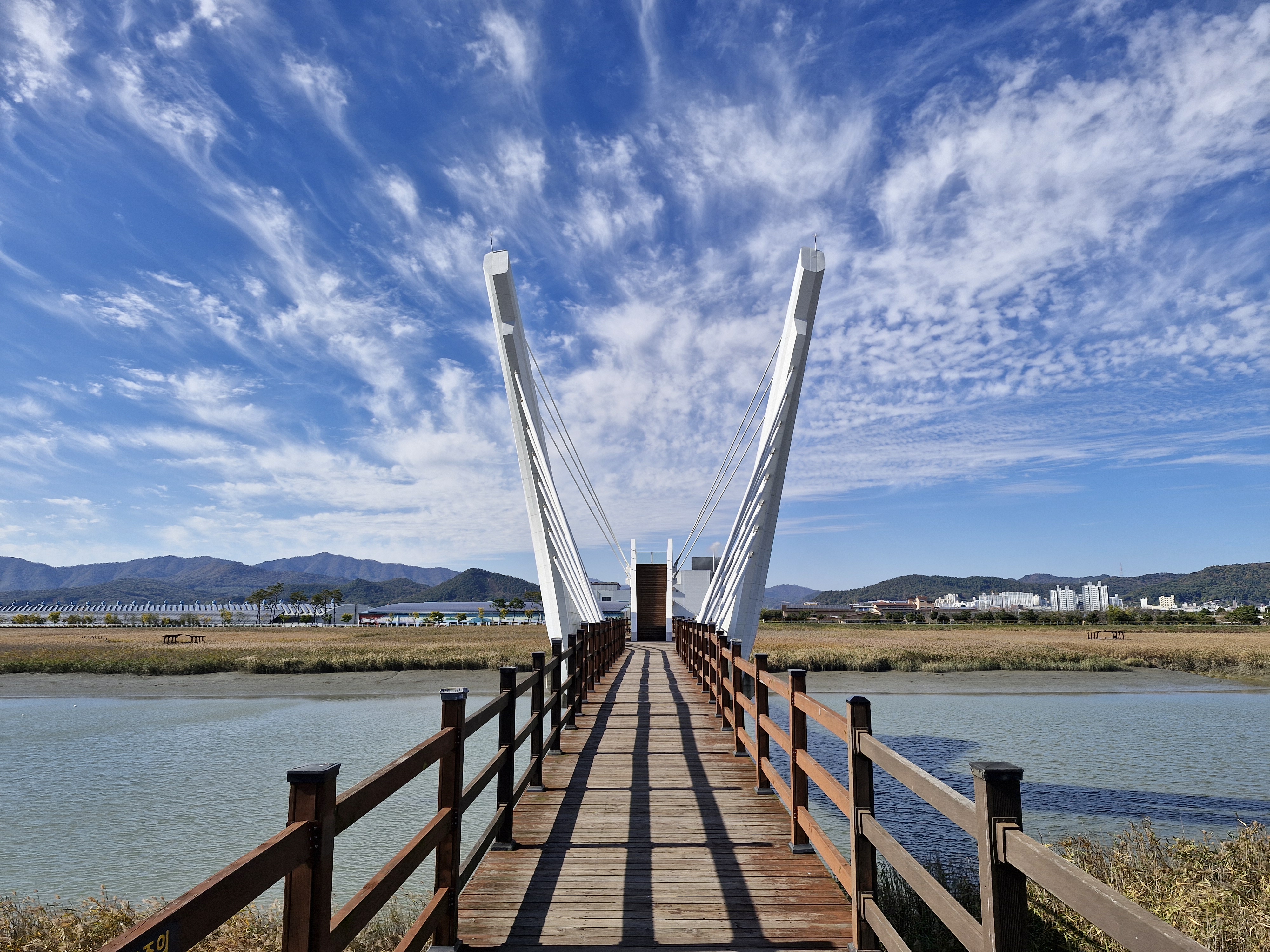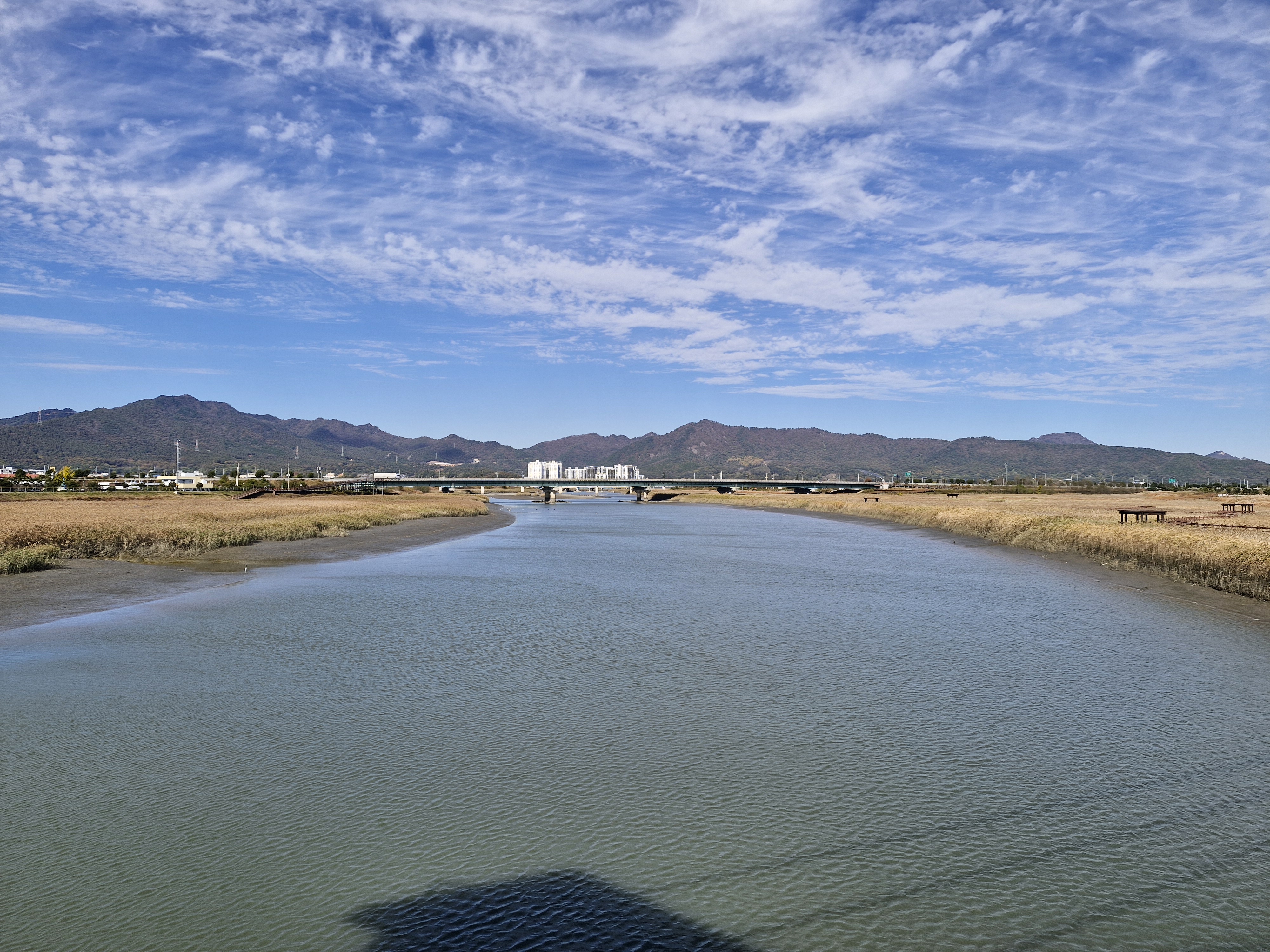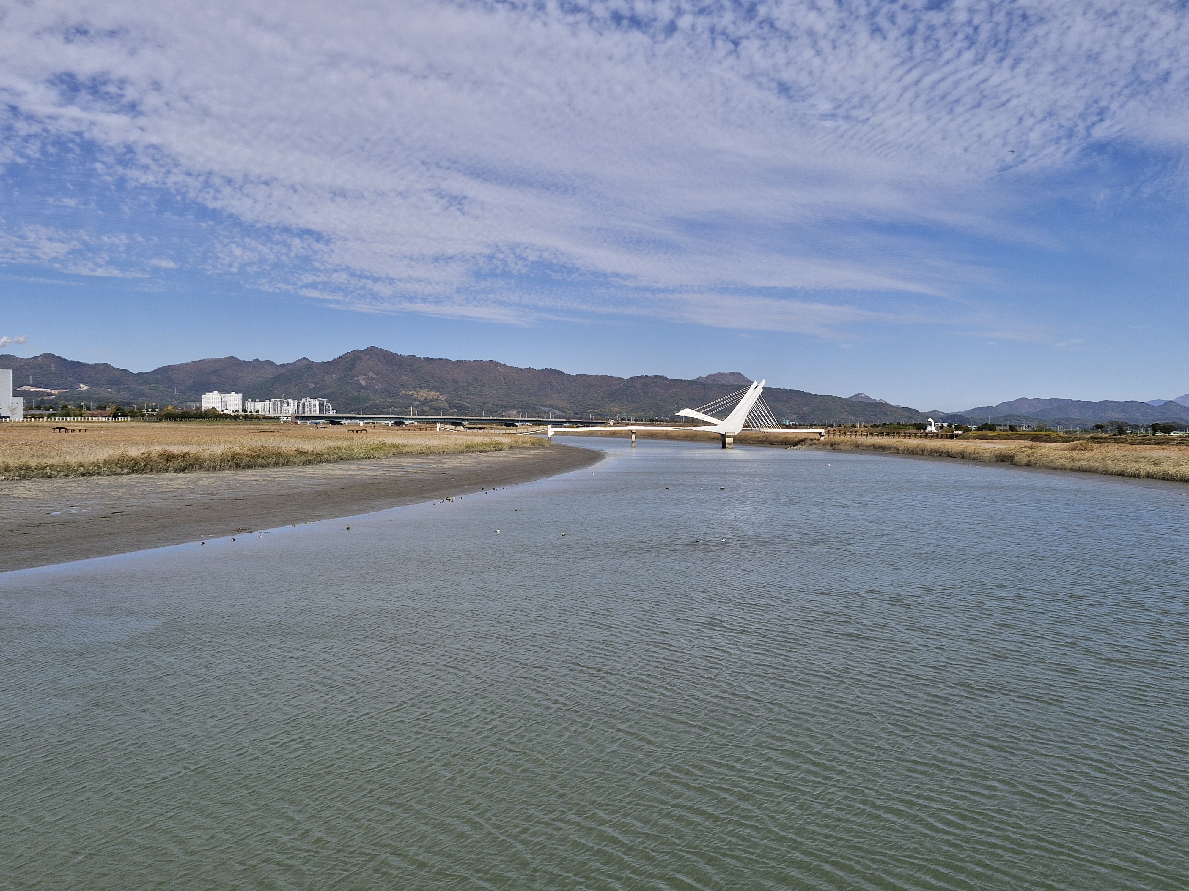 망호 출렁다리 위에서 강진만 상류 쪽인 생태공원 방향과 하류 쪽인 고금도 방향을 번갈아 보고...