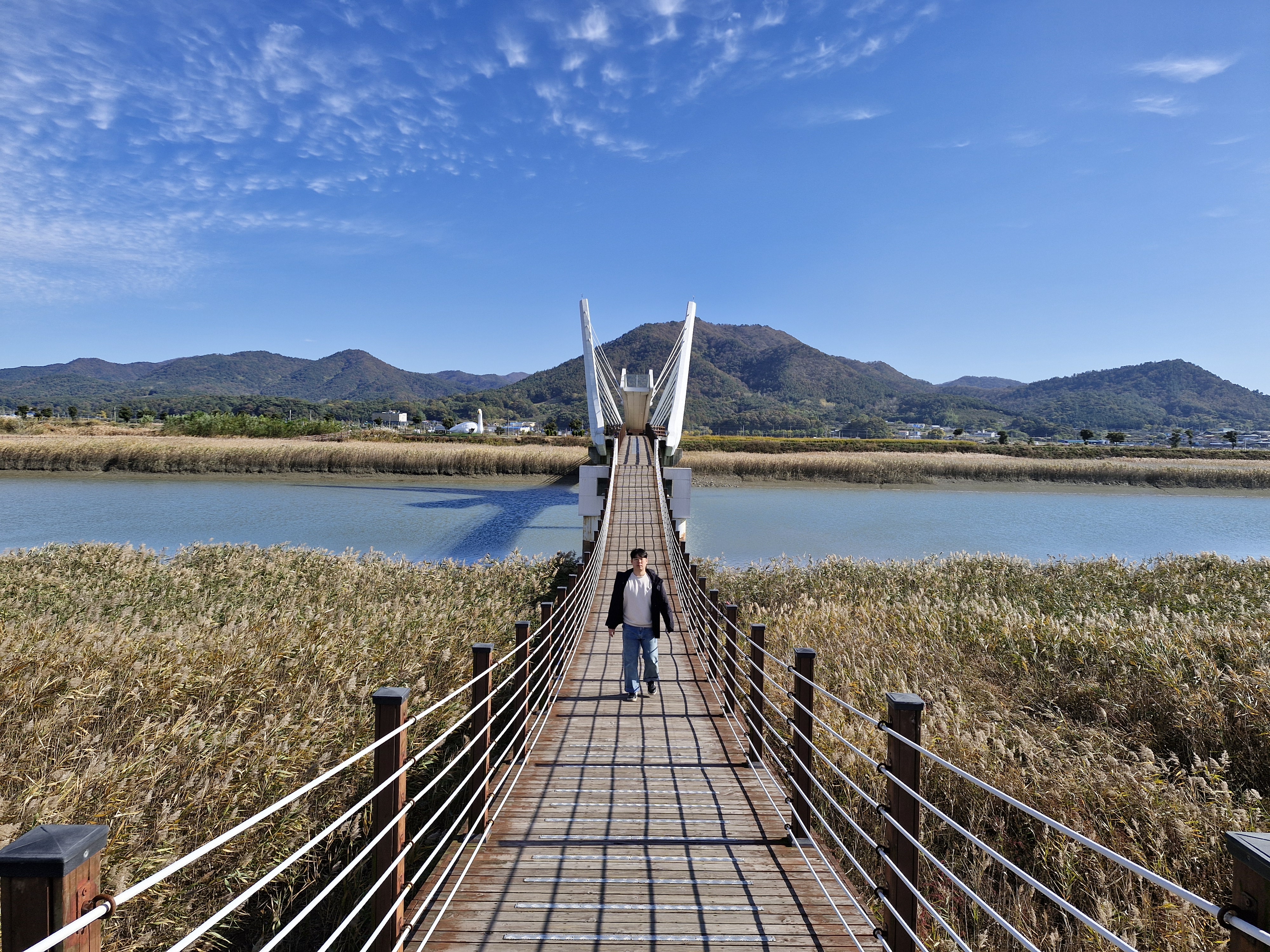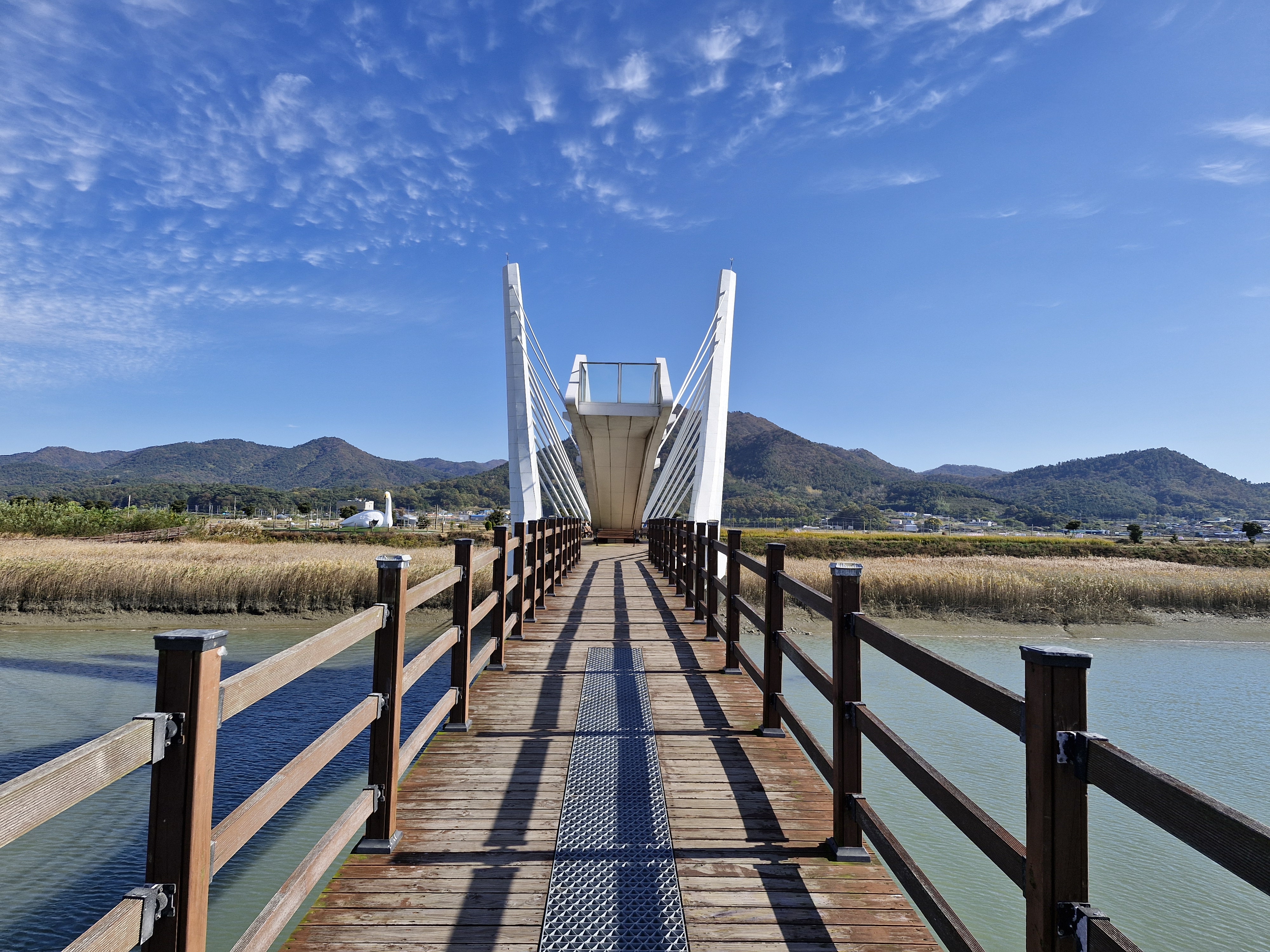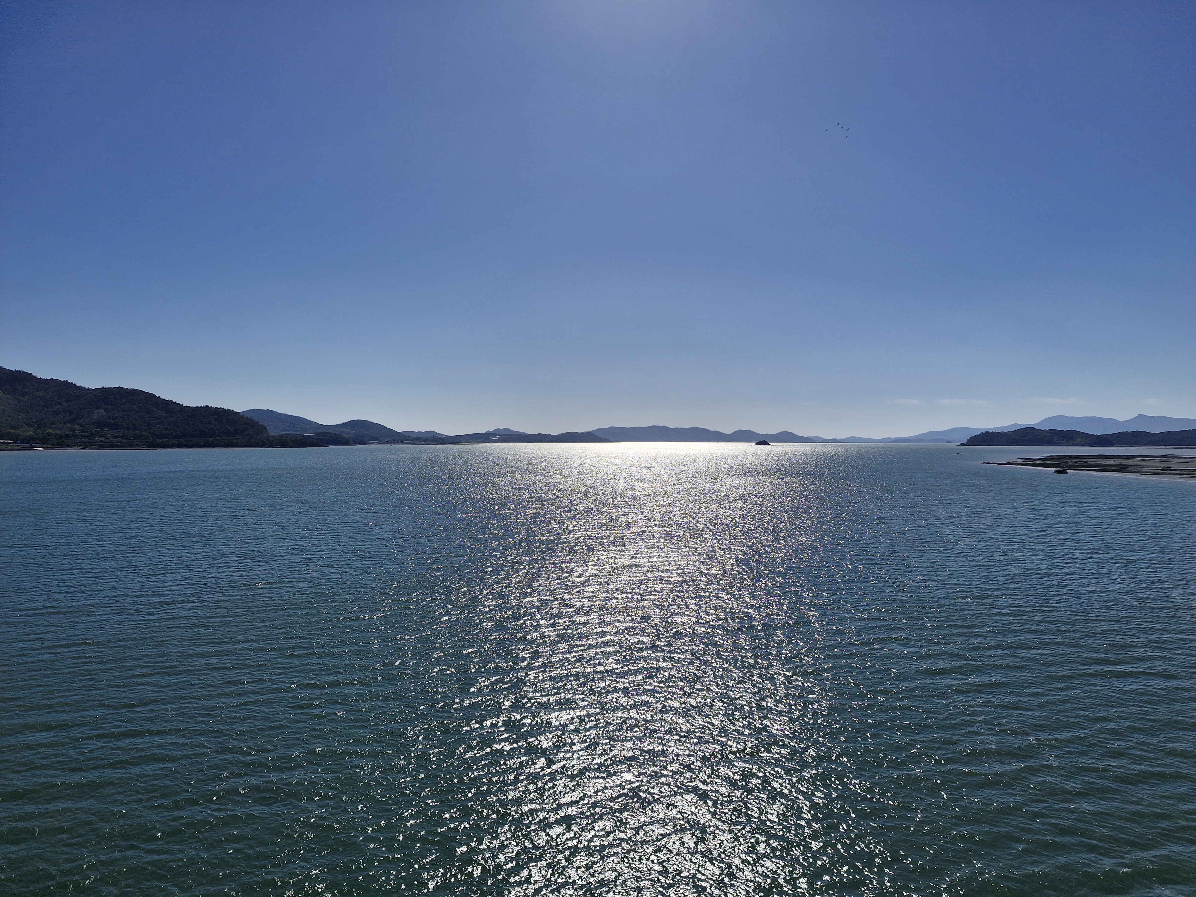 망호 출렁다리 위에서 강진만 상류 쪽인 생태공원 방향과 하류 쪽인 고금도 방향을 번갈아 보고...