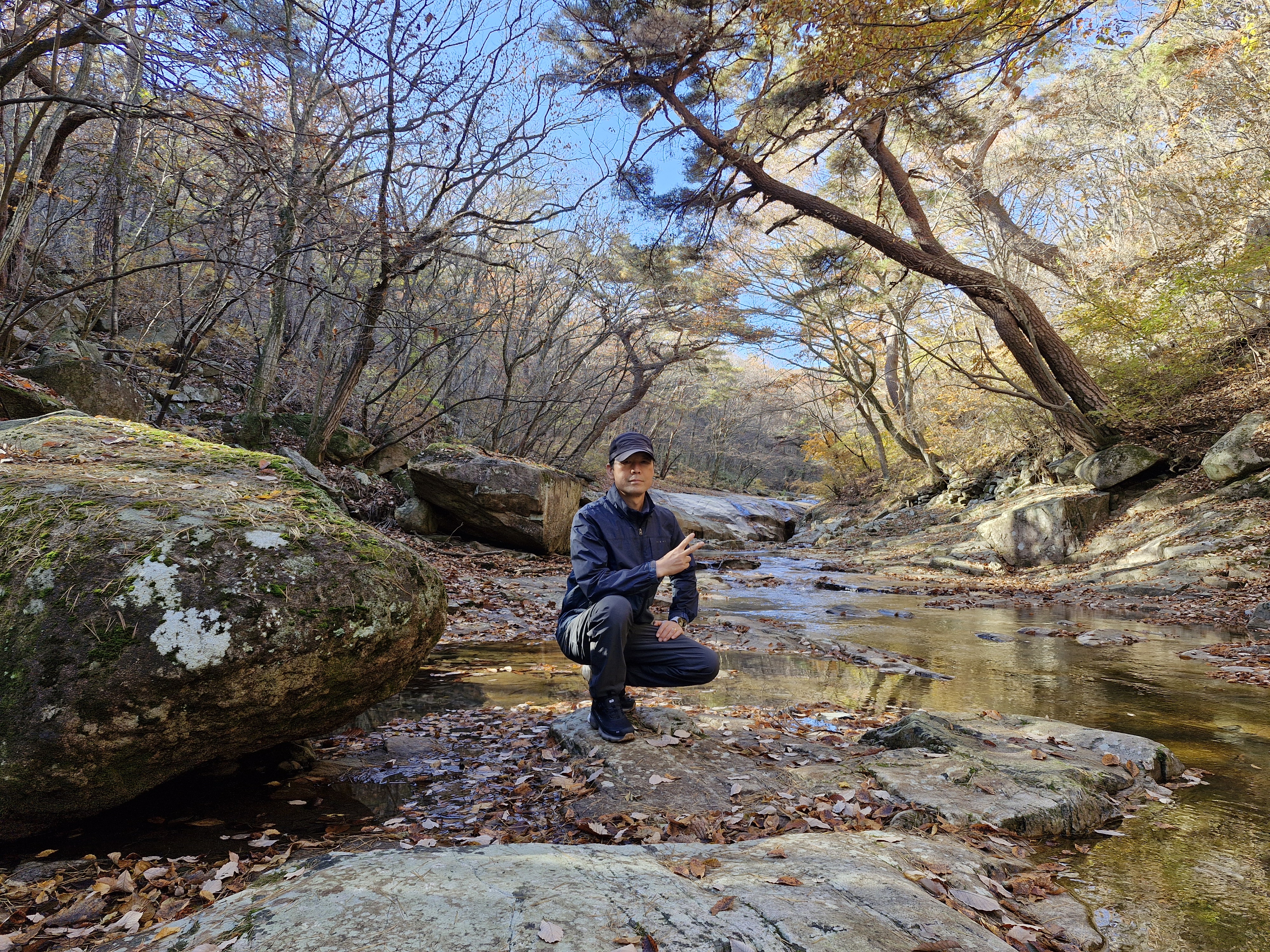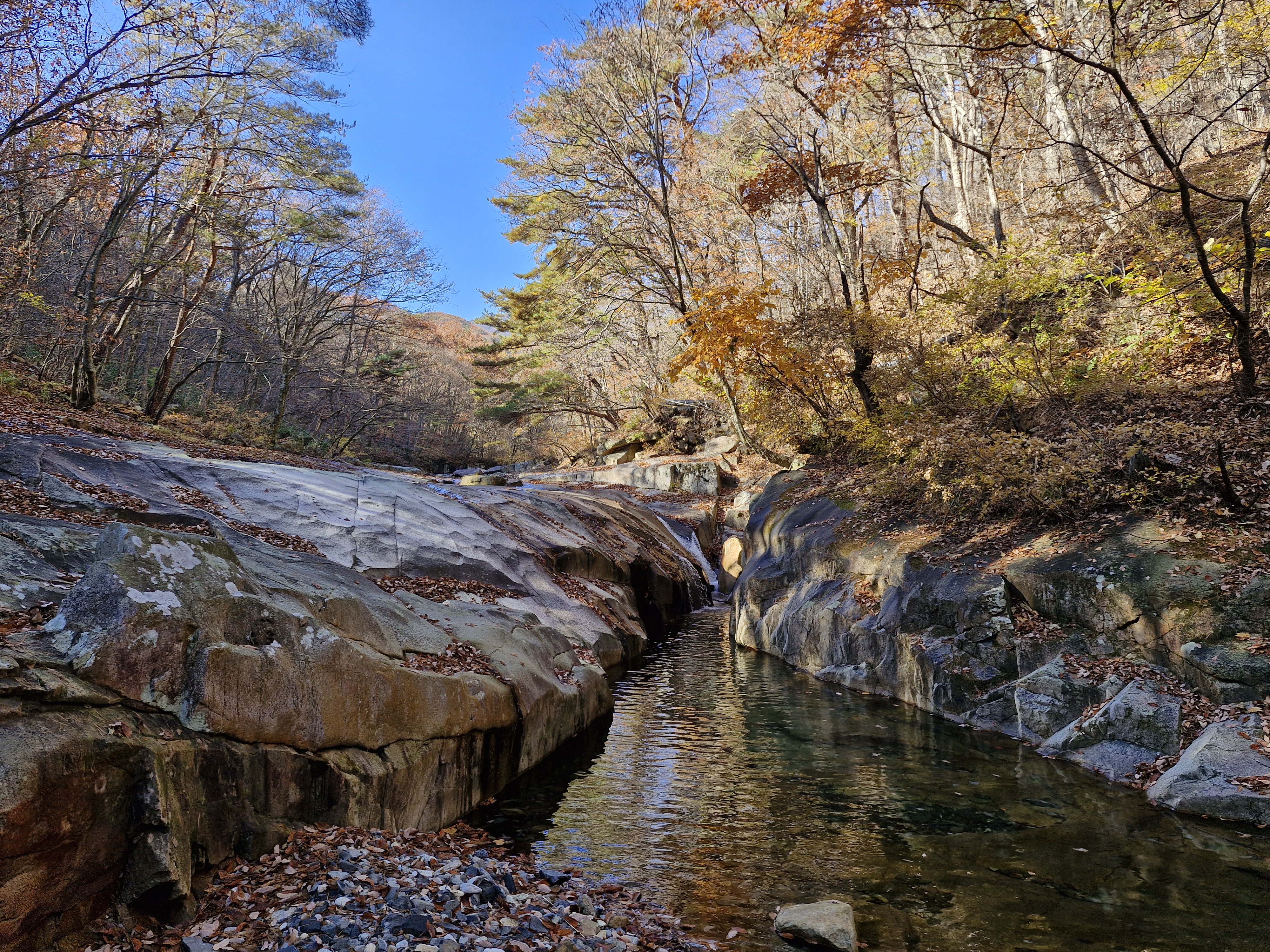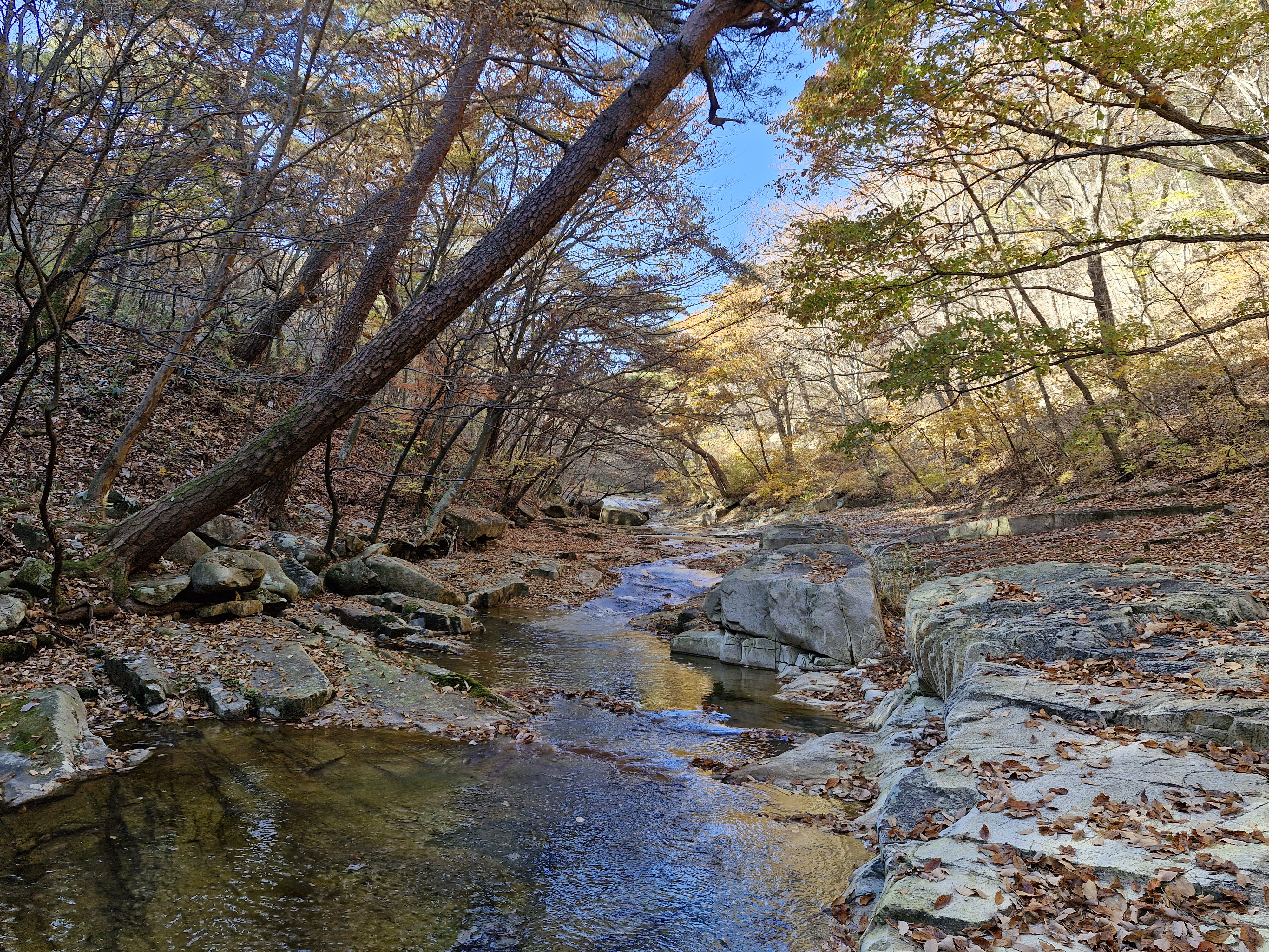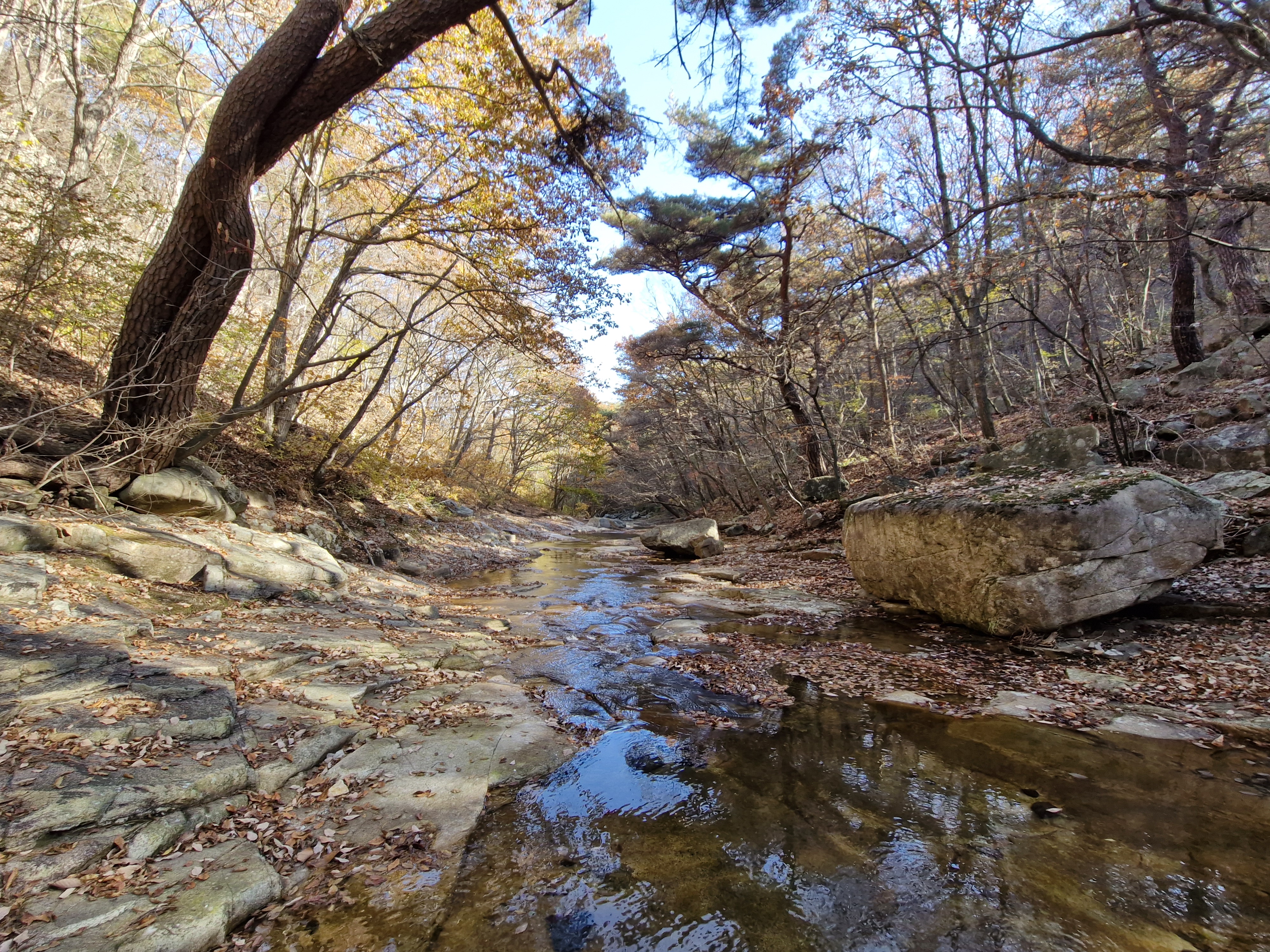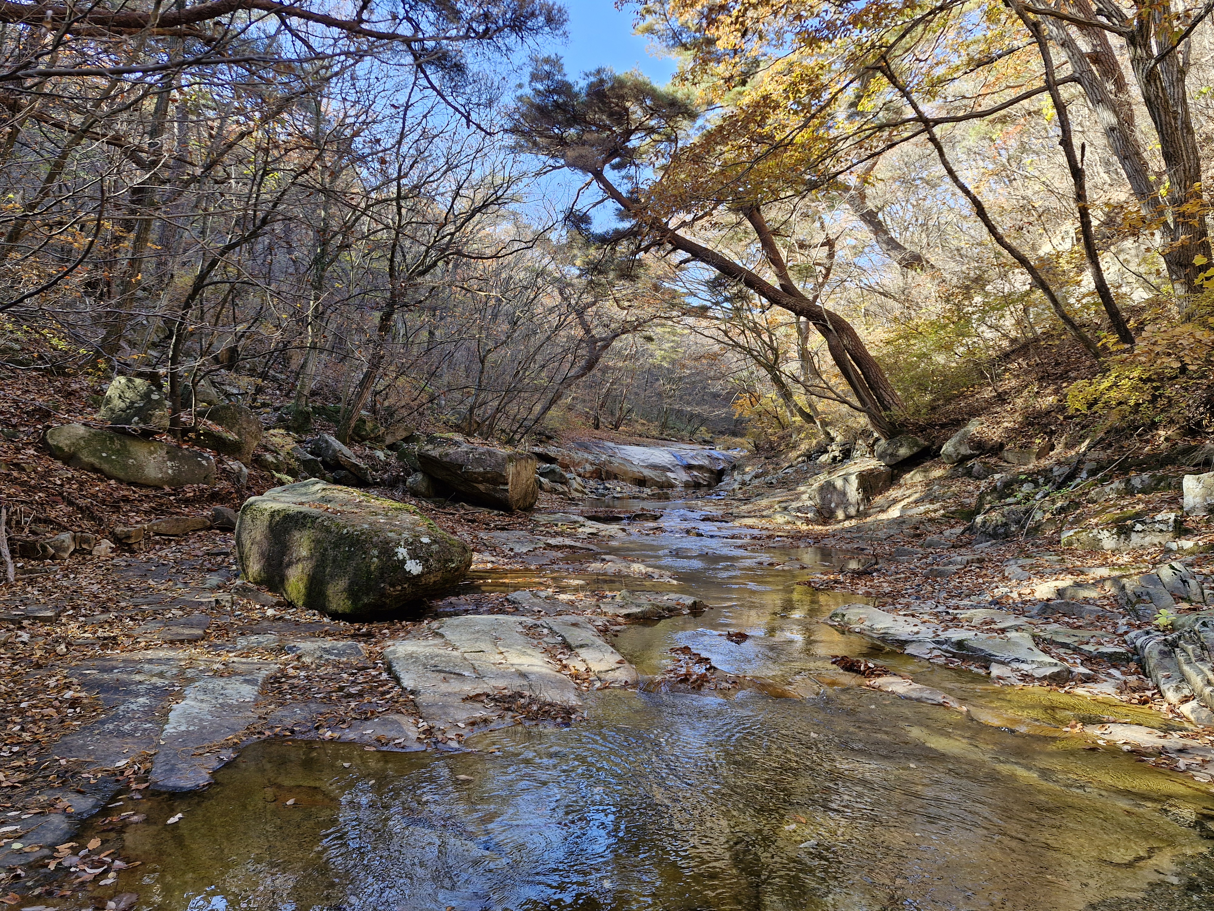 계곡 가득 떨어진 낙엽이 단풍은 지났음을 보여준다.