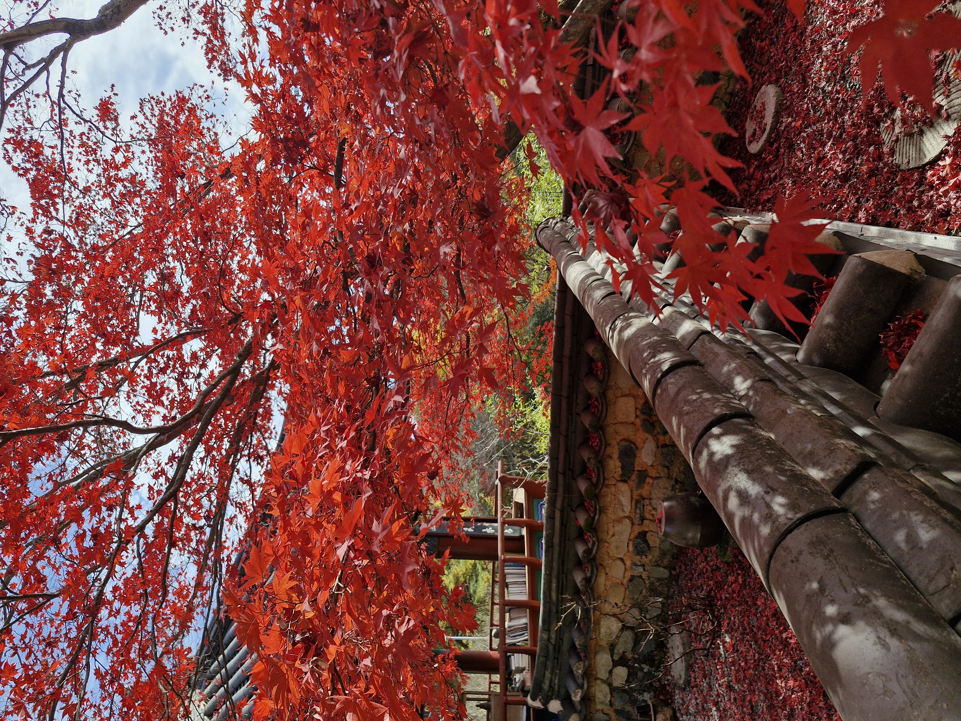 사명암에는 단풍나무가 많은 건 아니지만 좌 우측으로 심어진 두 그루의 단풍이 유독 짙은 핏빛을 띠고 담장과 어우러지는 아름다움이 장관이다.