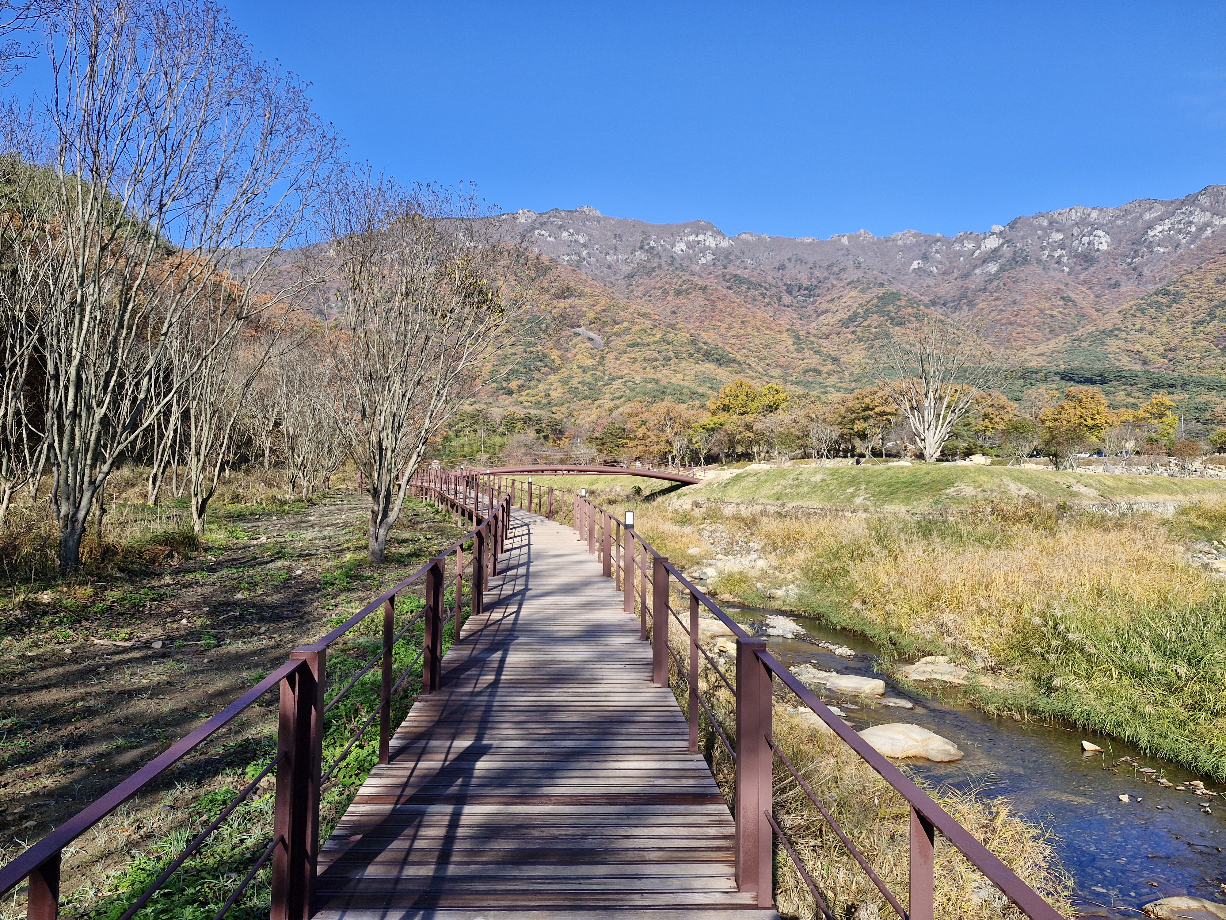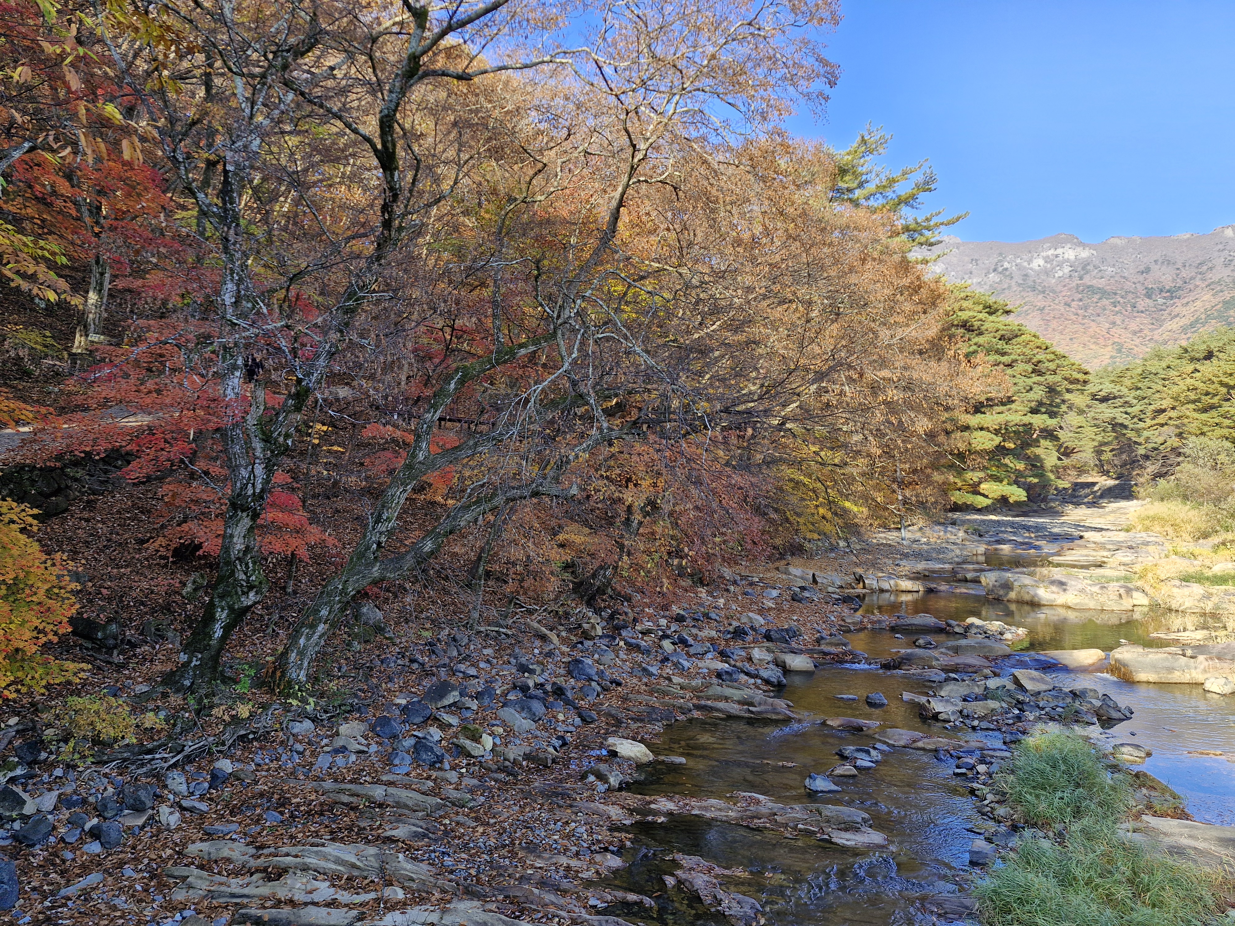 걸음 시작의 계곡 건너 단풍이 이쁘다.