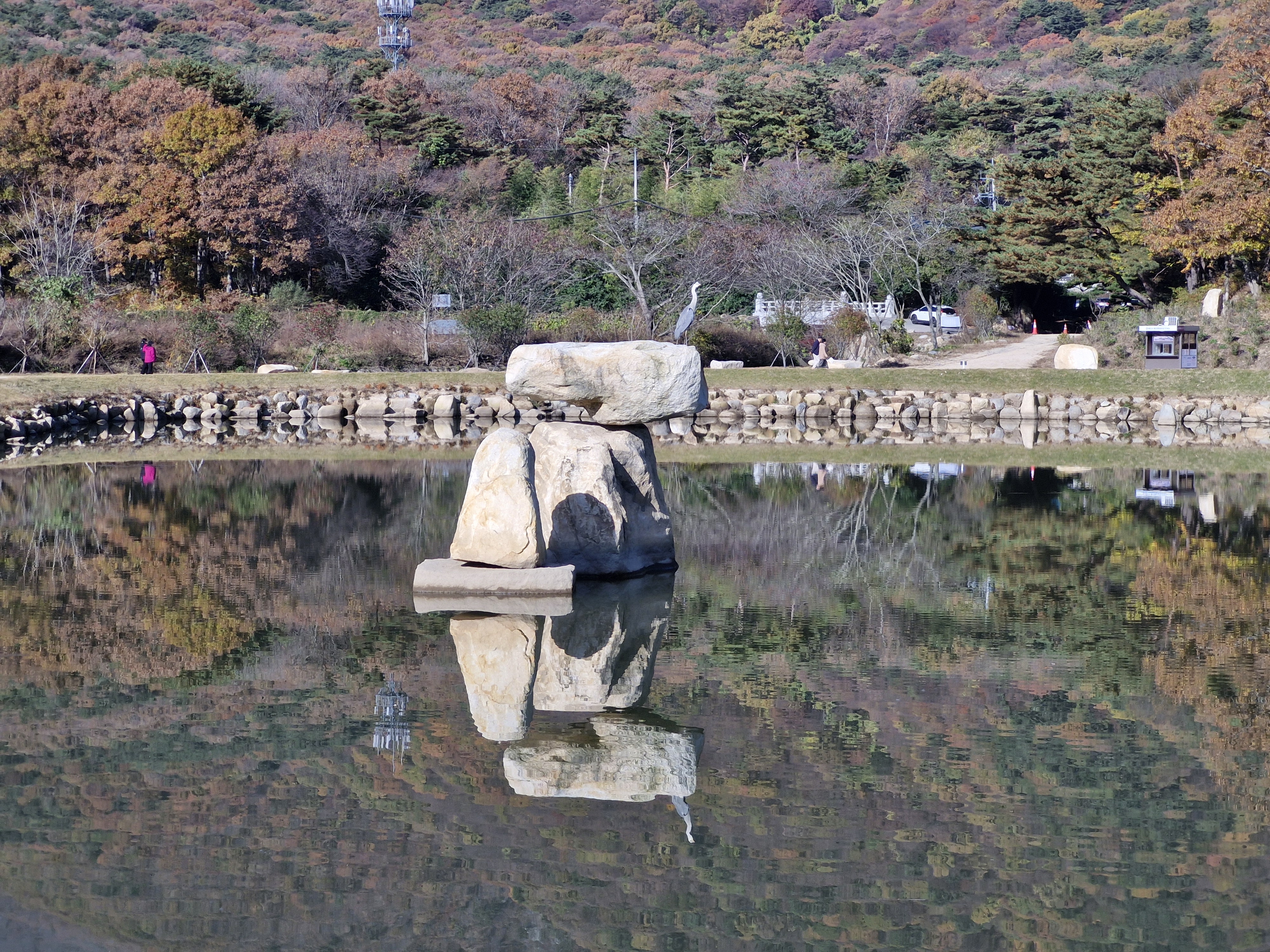 보경호 가운데 바위에 왜가리 한 마리가 망중한을 즐기고...