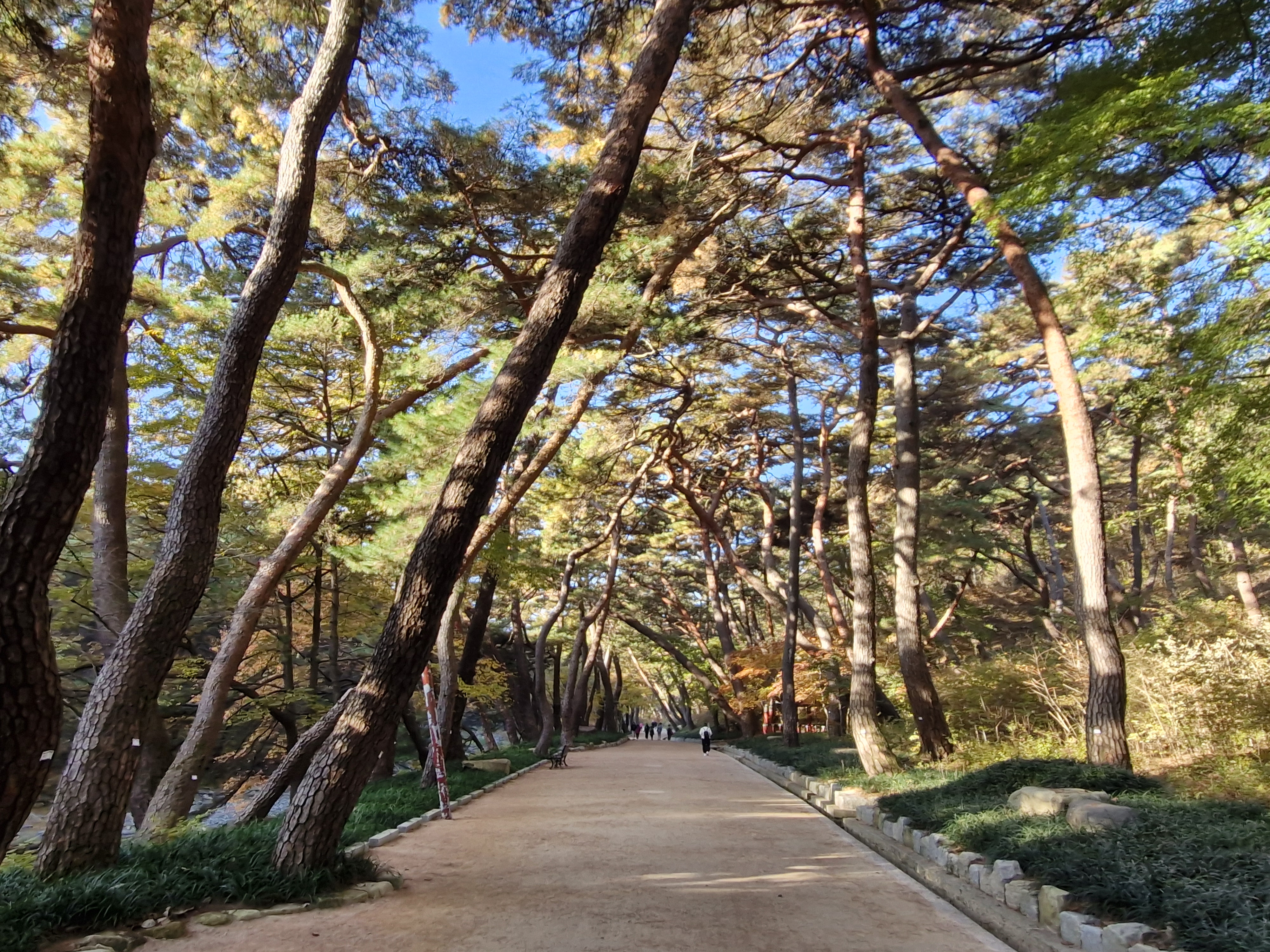 통도사 입구 산문 매표소를 지나면 무풍교 오른쪽에서 청류교 직전까지 아름드리 소나무가 도열을 하고 있는 무풍한송로가 이어진다.