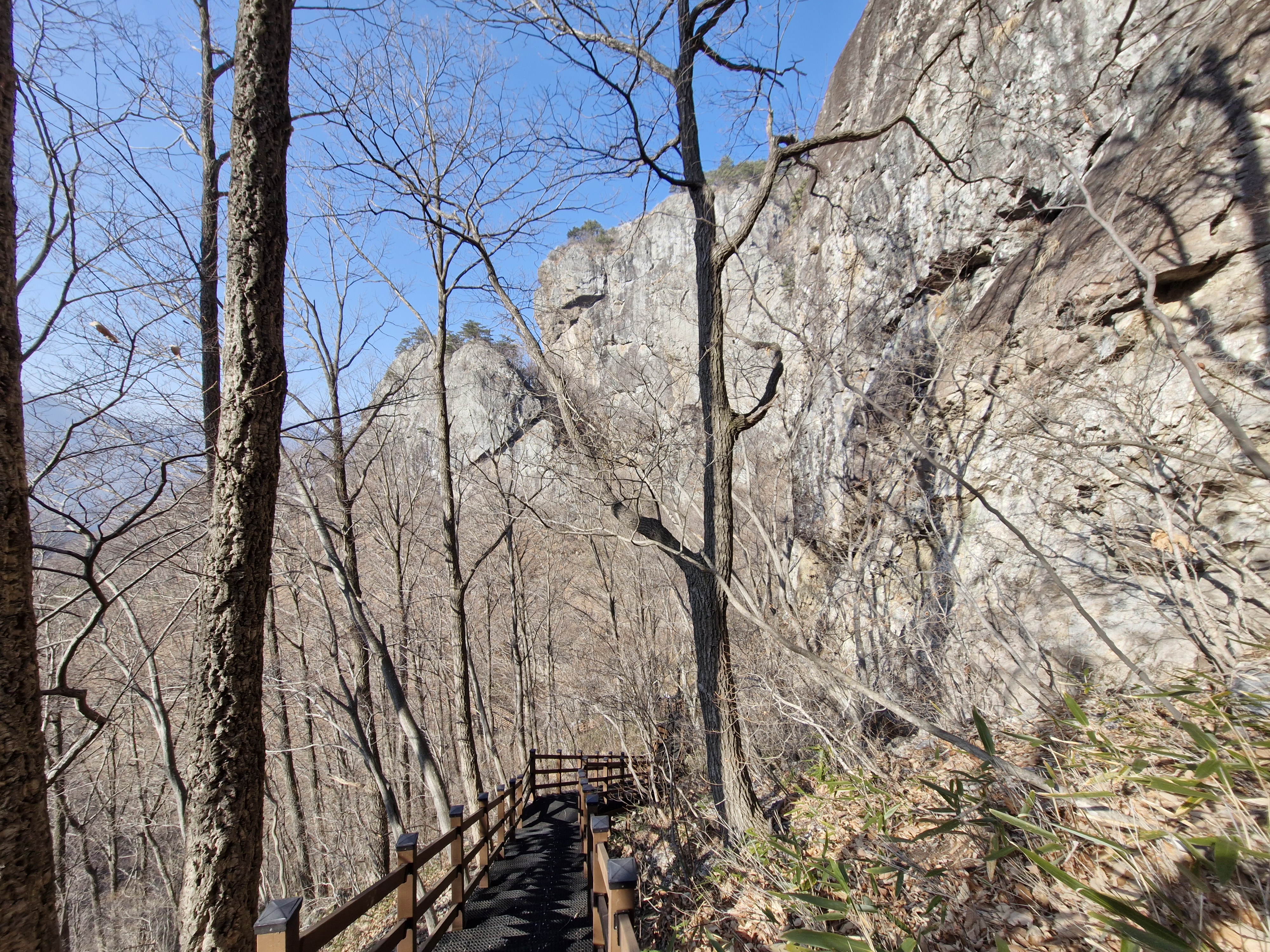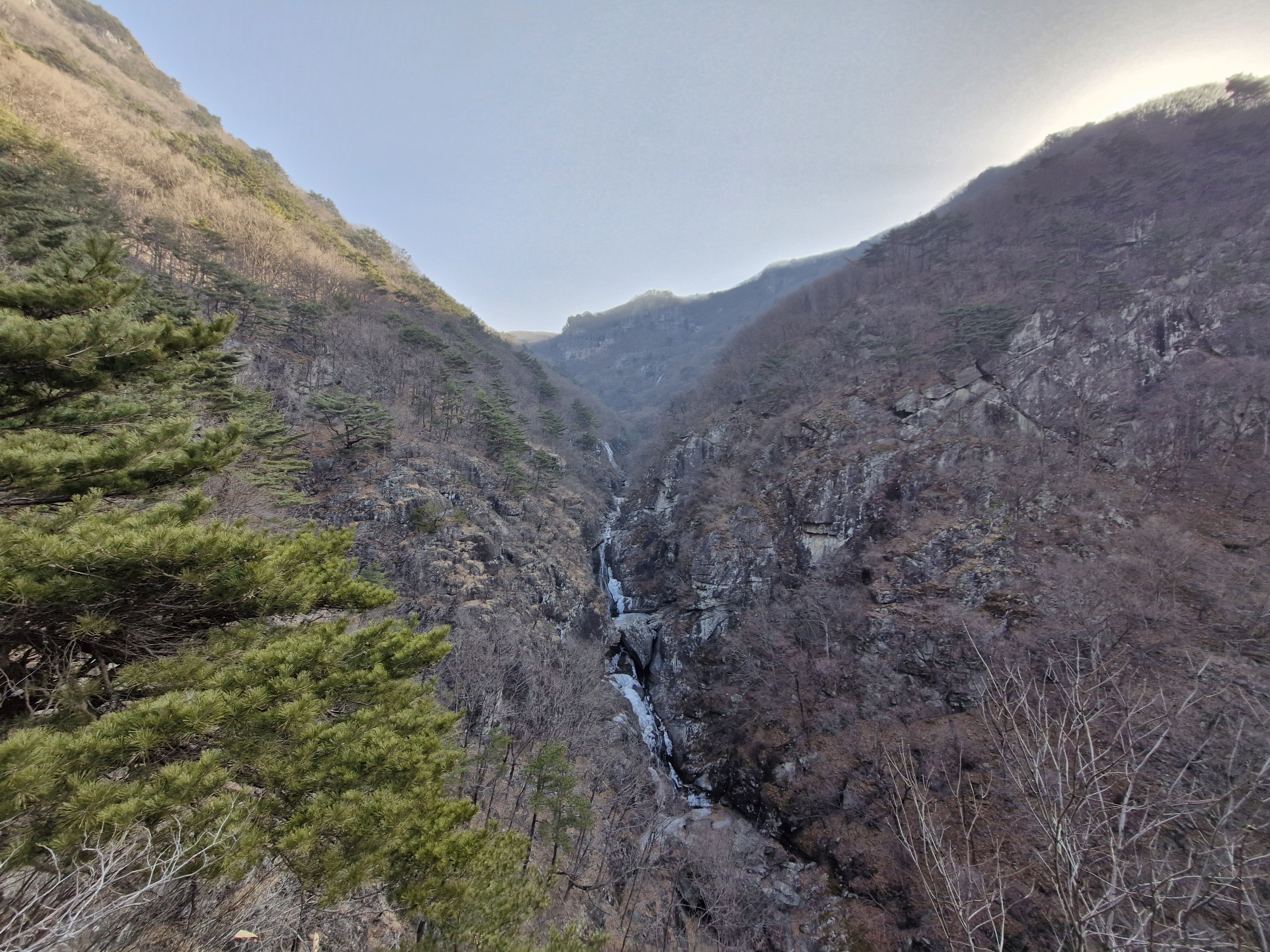 절개지 암벽 옆을 따라 걸으면 건너편에는 문수봉과 관음봉 사이에서 흘러내리는 구룡폭포가 살짝 보이고...