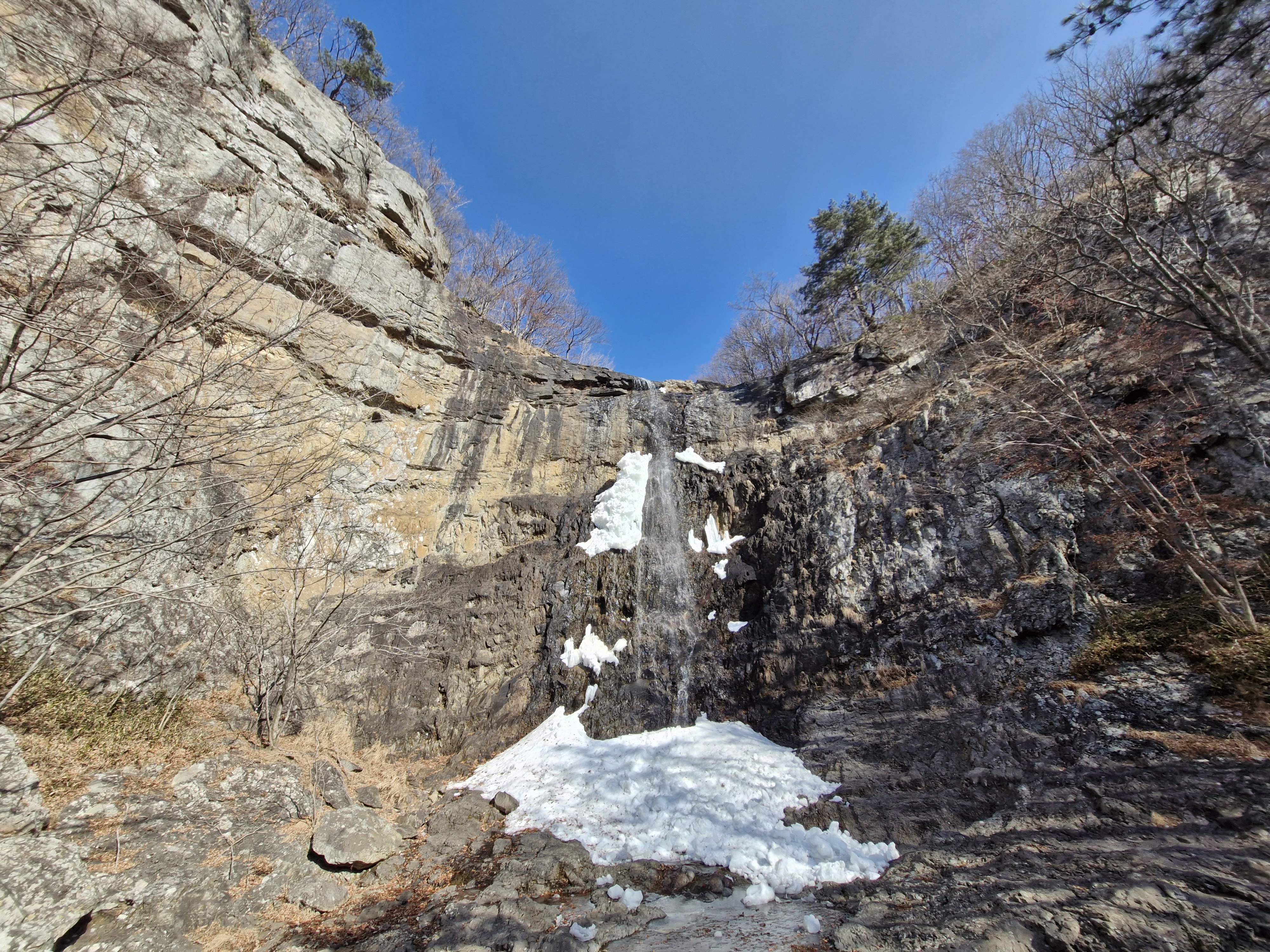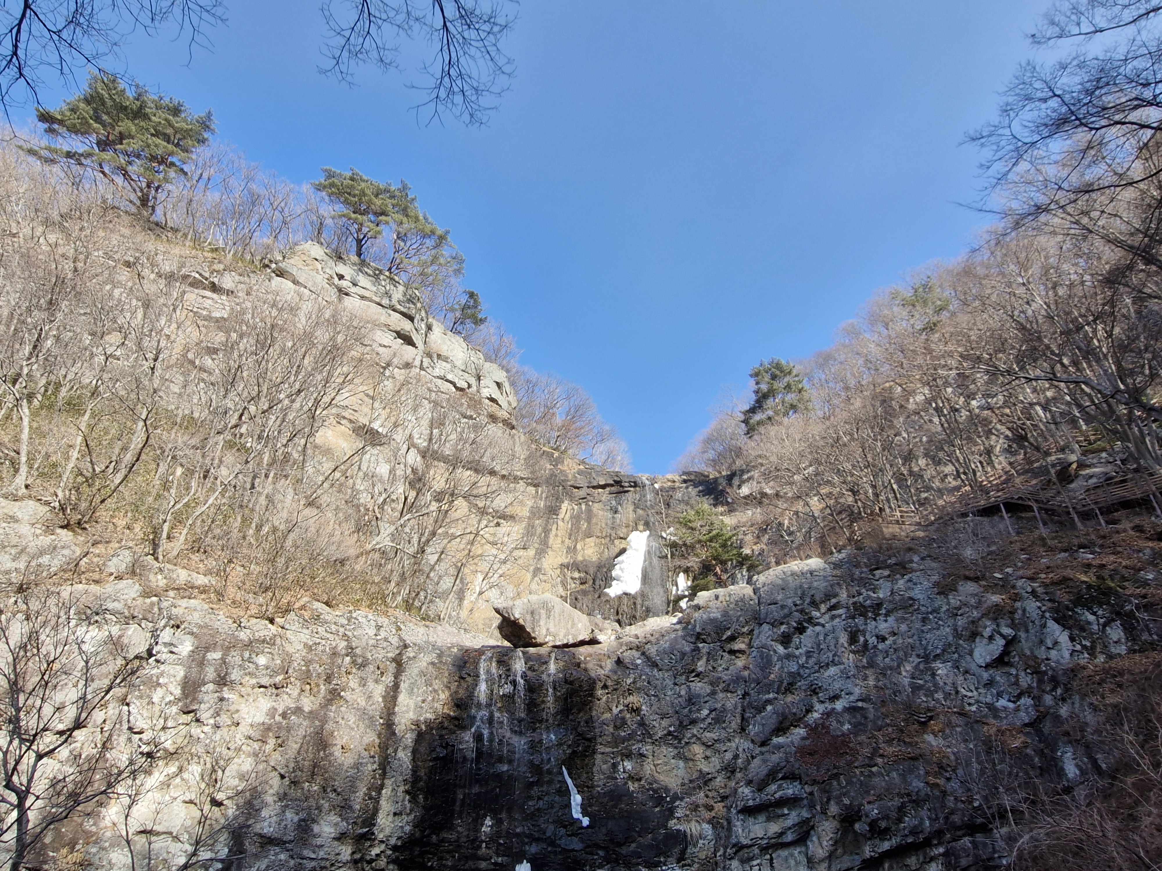 학암폭포는 종일 햇살이 들지 않아서 겨울이면 빙벽을 즐기는 마니아들이 즐겨 찾는 곳이지만 며칠째 기온이 높아 빙벽을 즐길 얼음이 안 되는 줄 알았다.