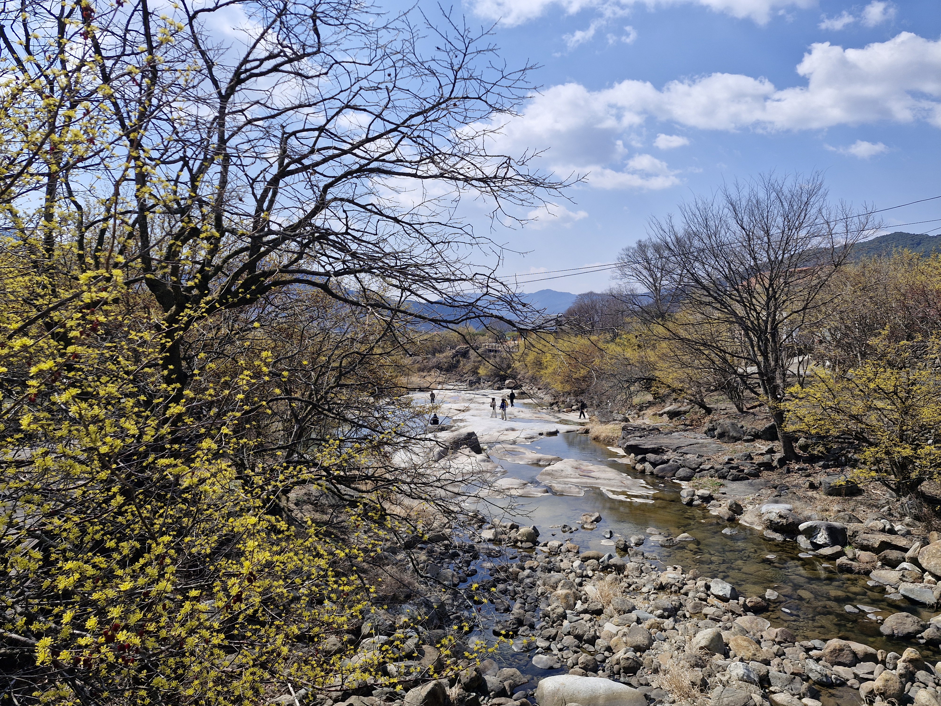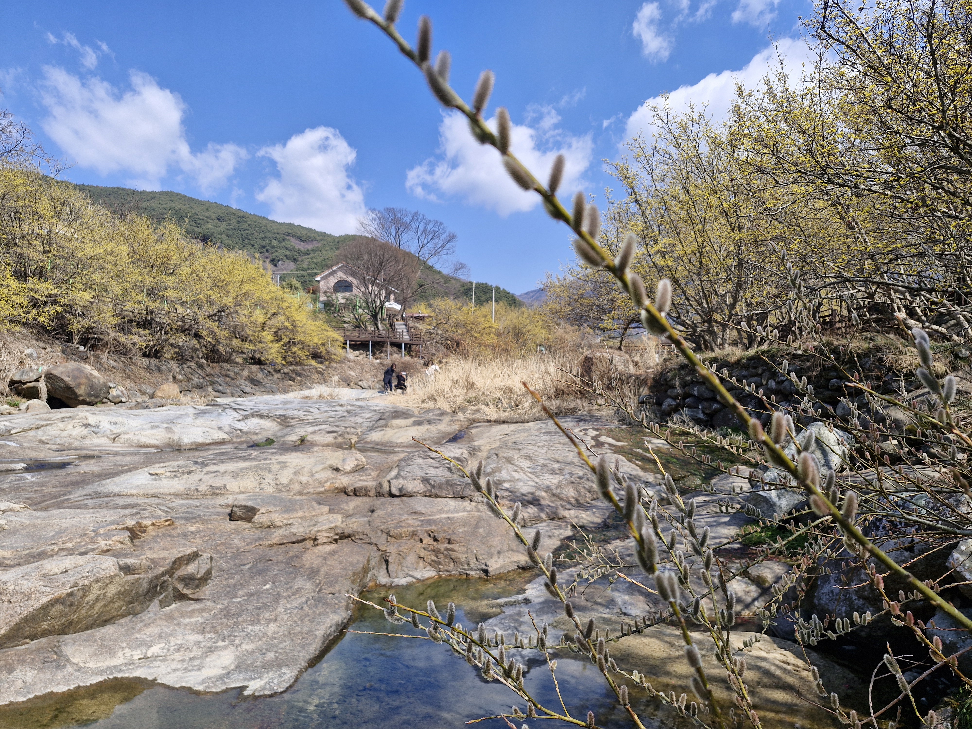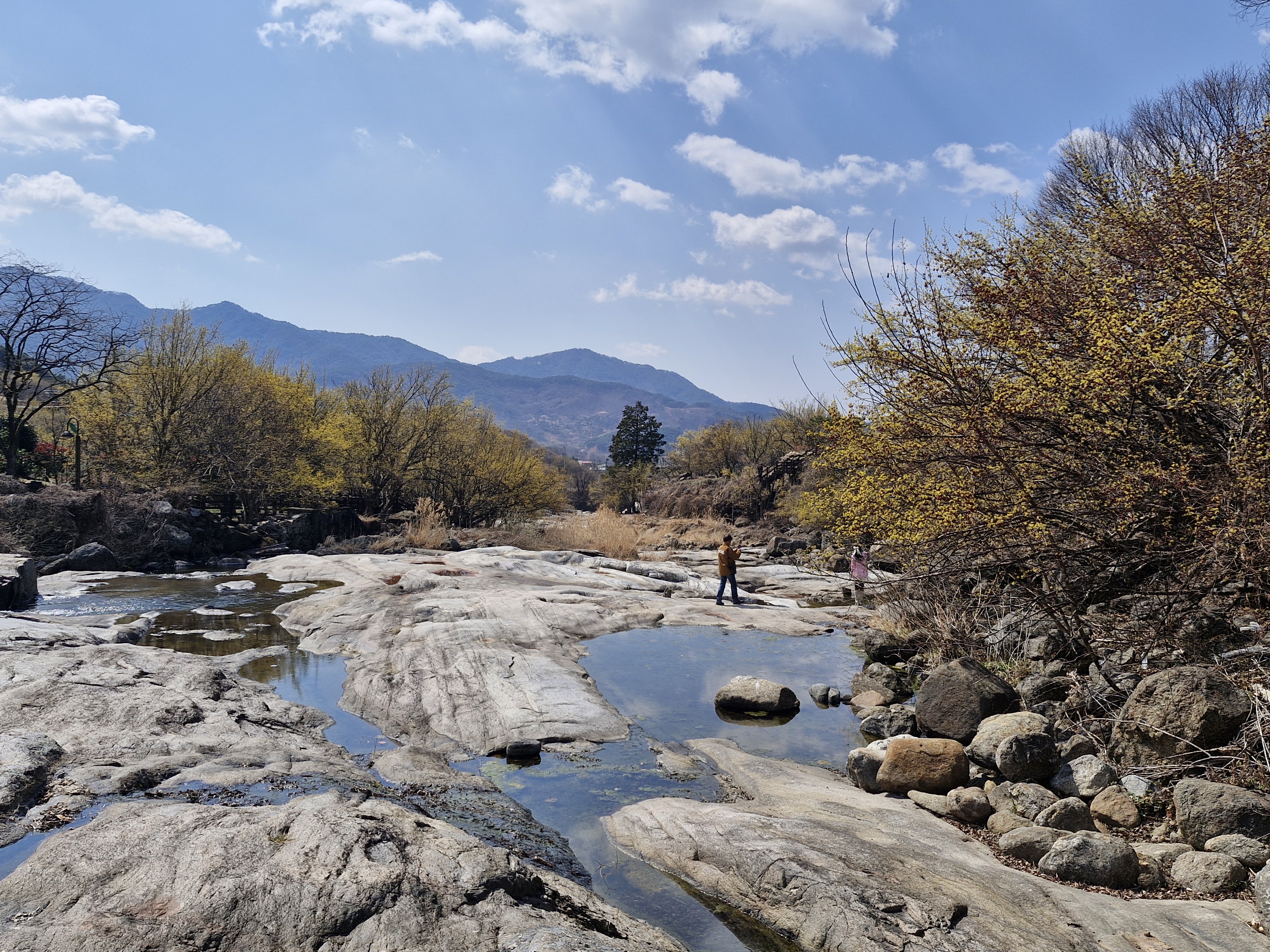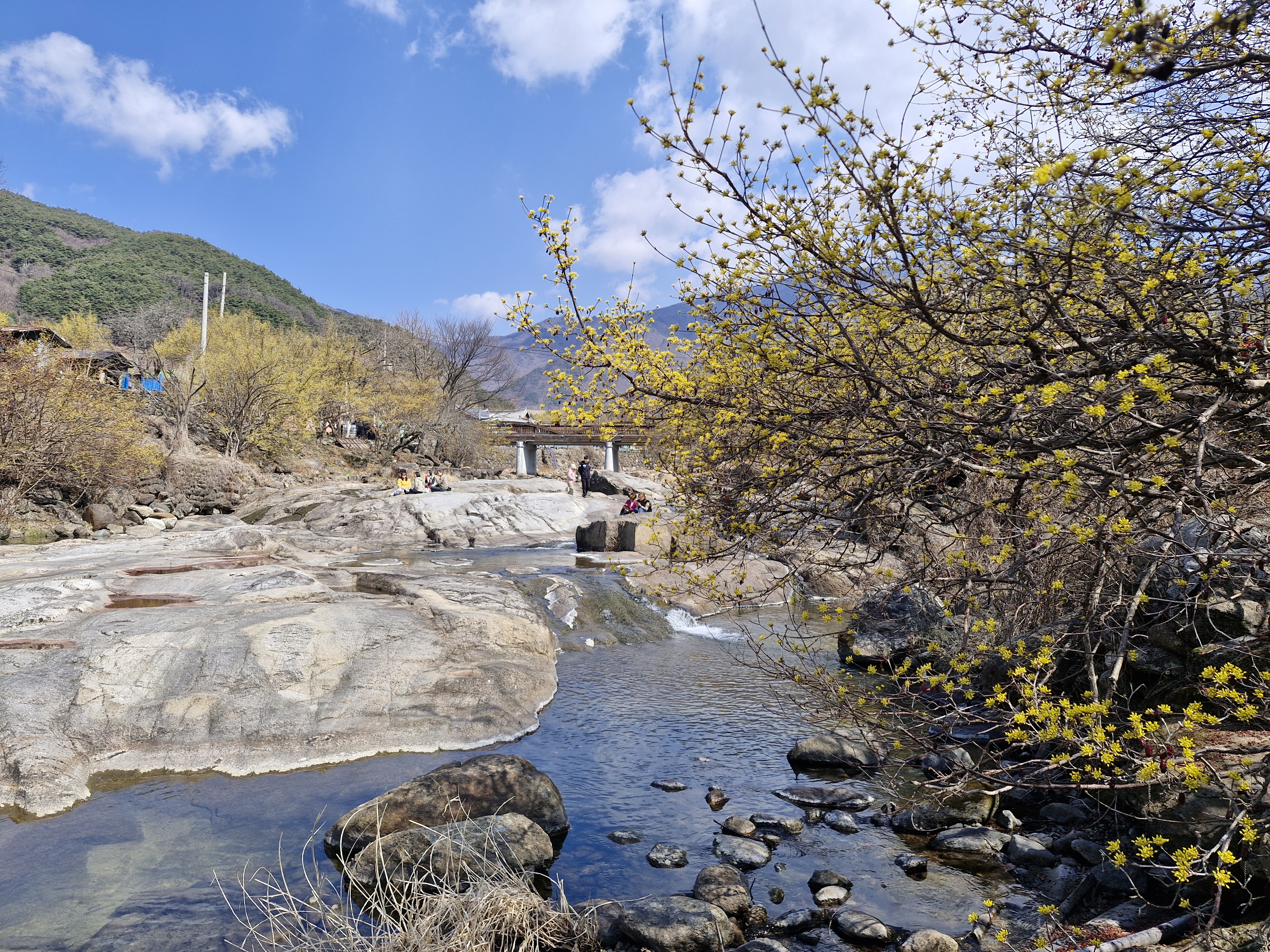 화강암의 너럭바위와 어우러지는 산수유꽃을 즐길 수 있는 서시천으로 내려선다.