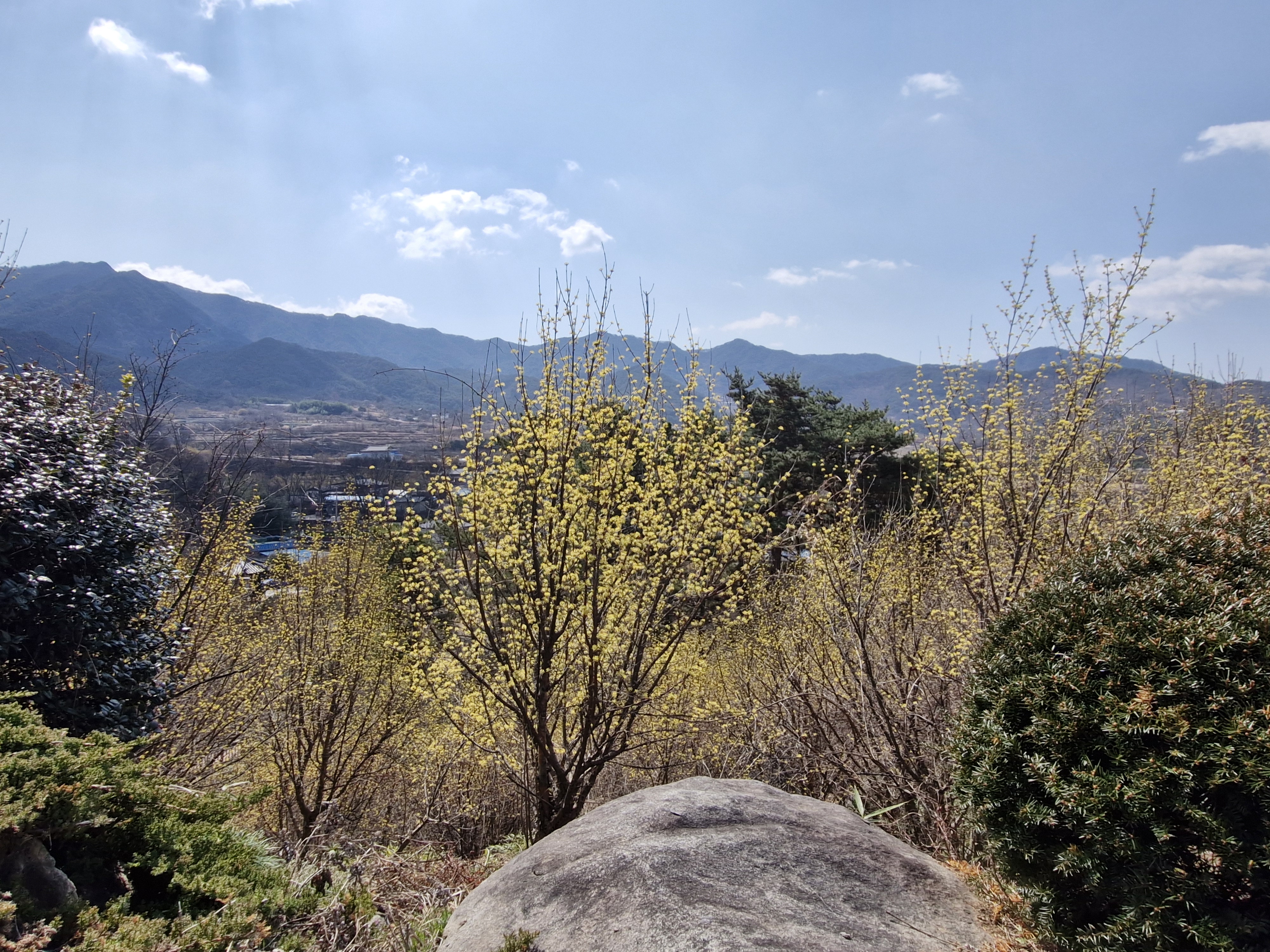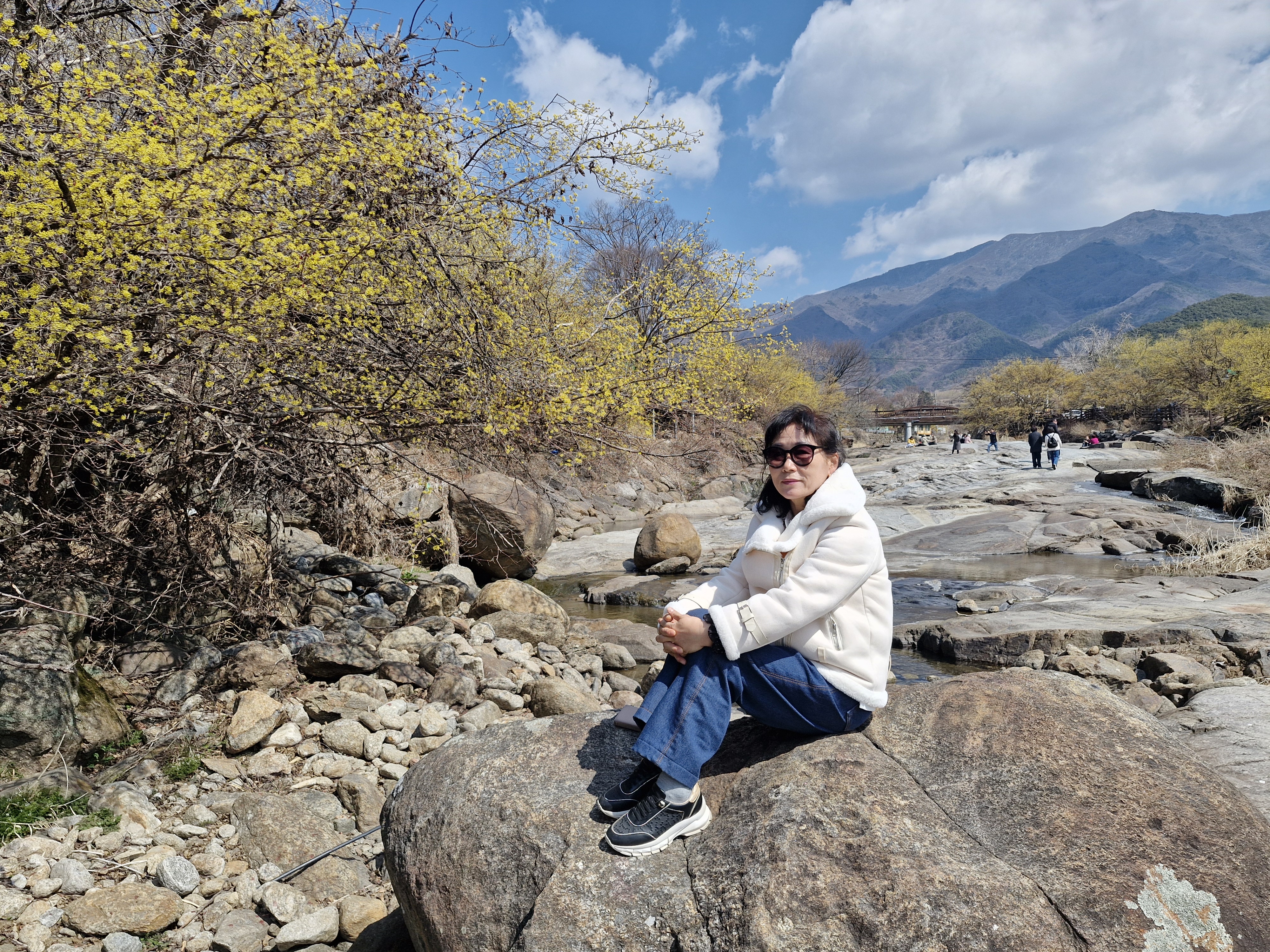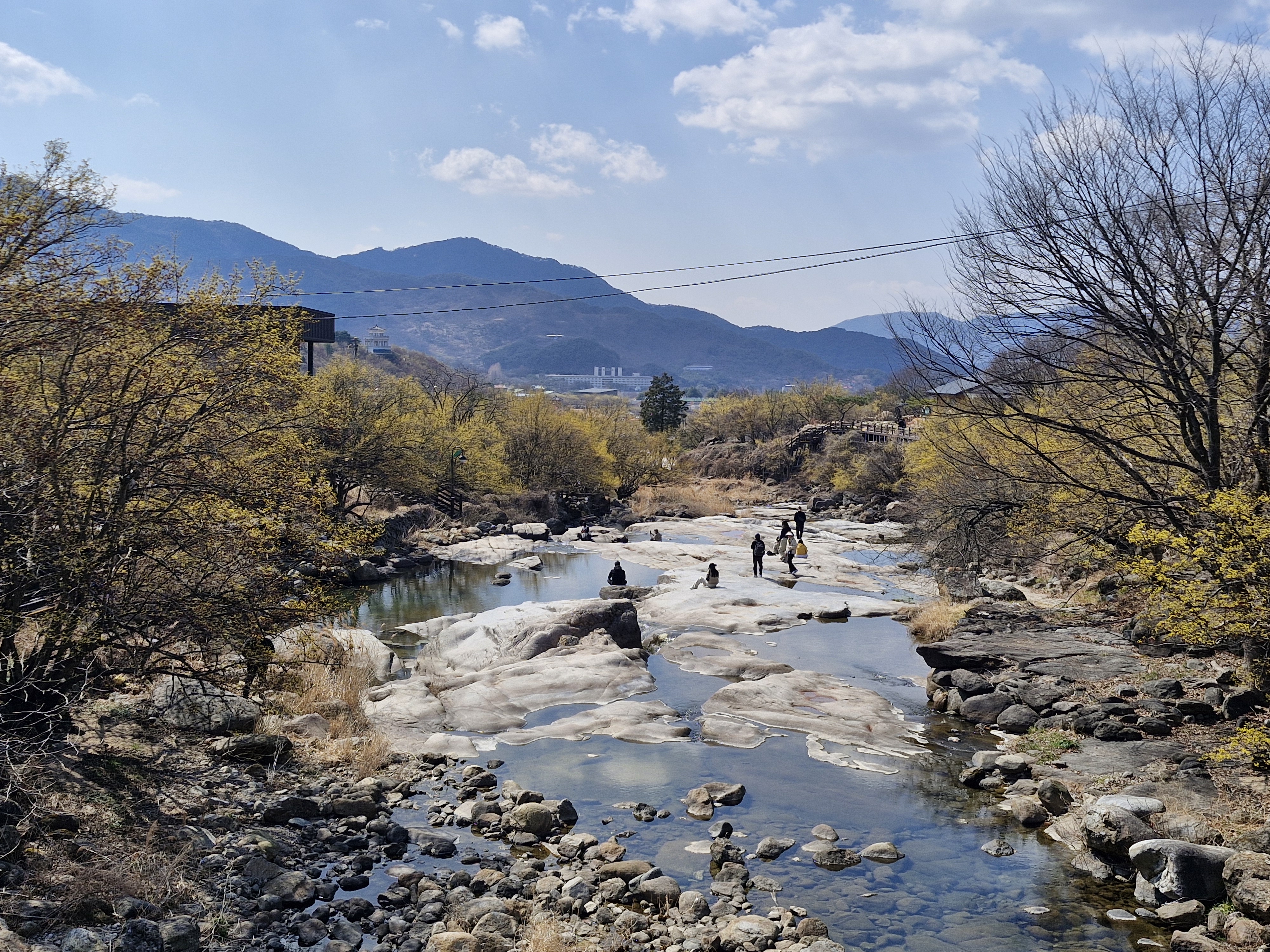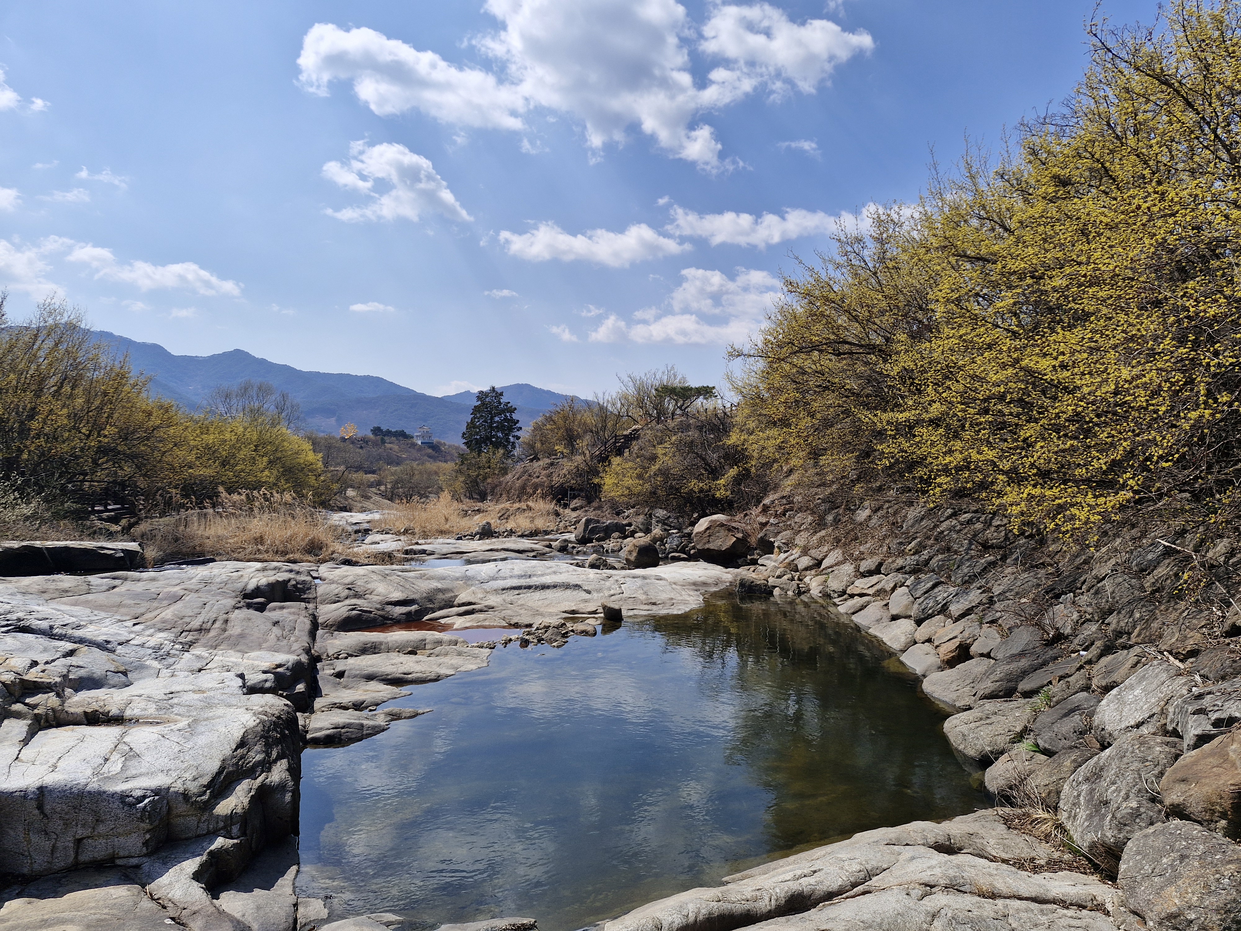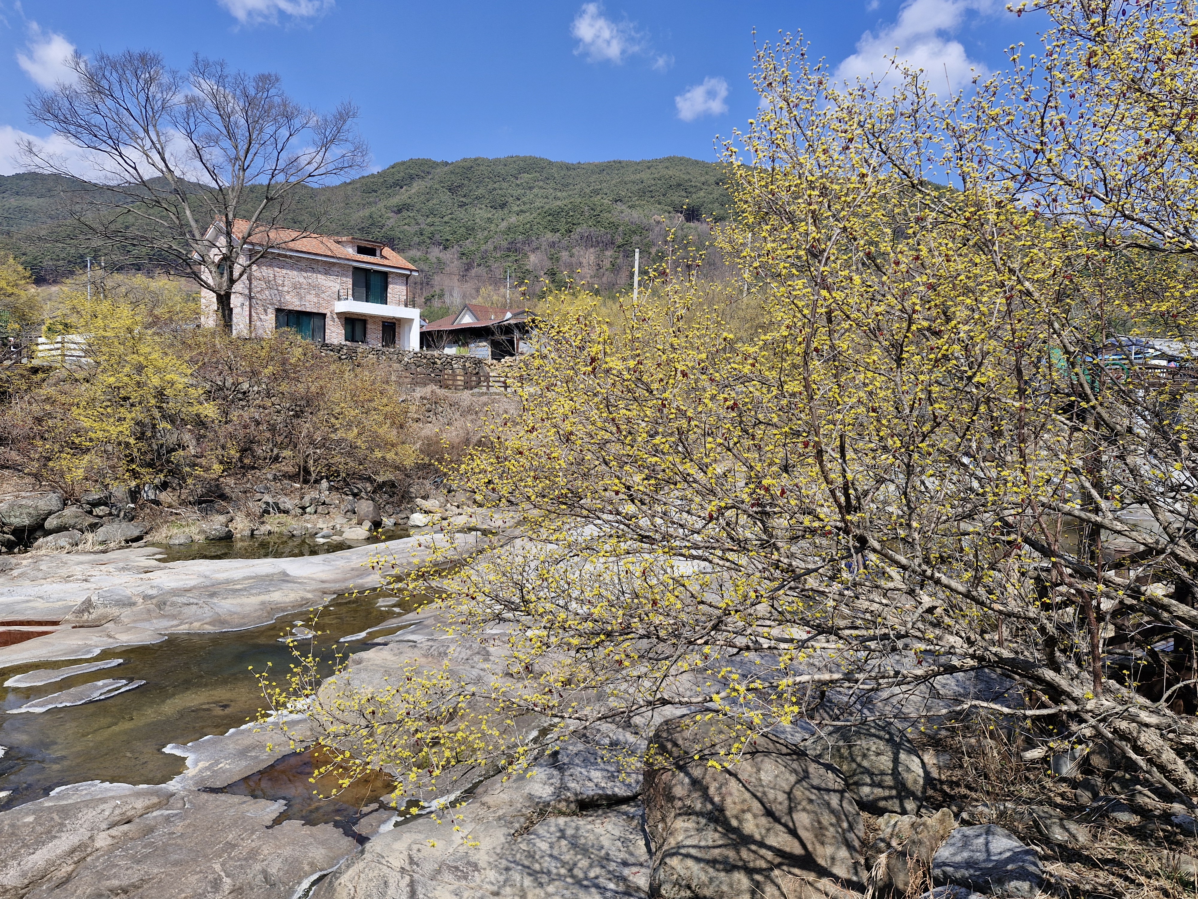 화강암의 너럭바위와 어우러지는 산수유꽃을 즐길 수 있는 서시천으로 내려선다.