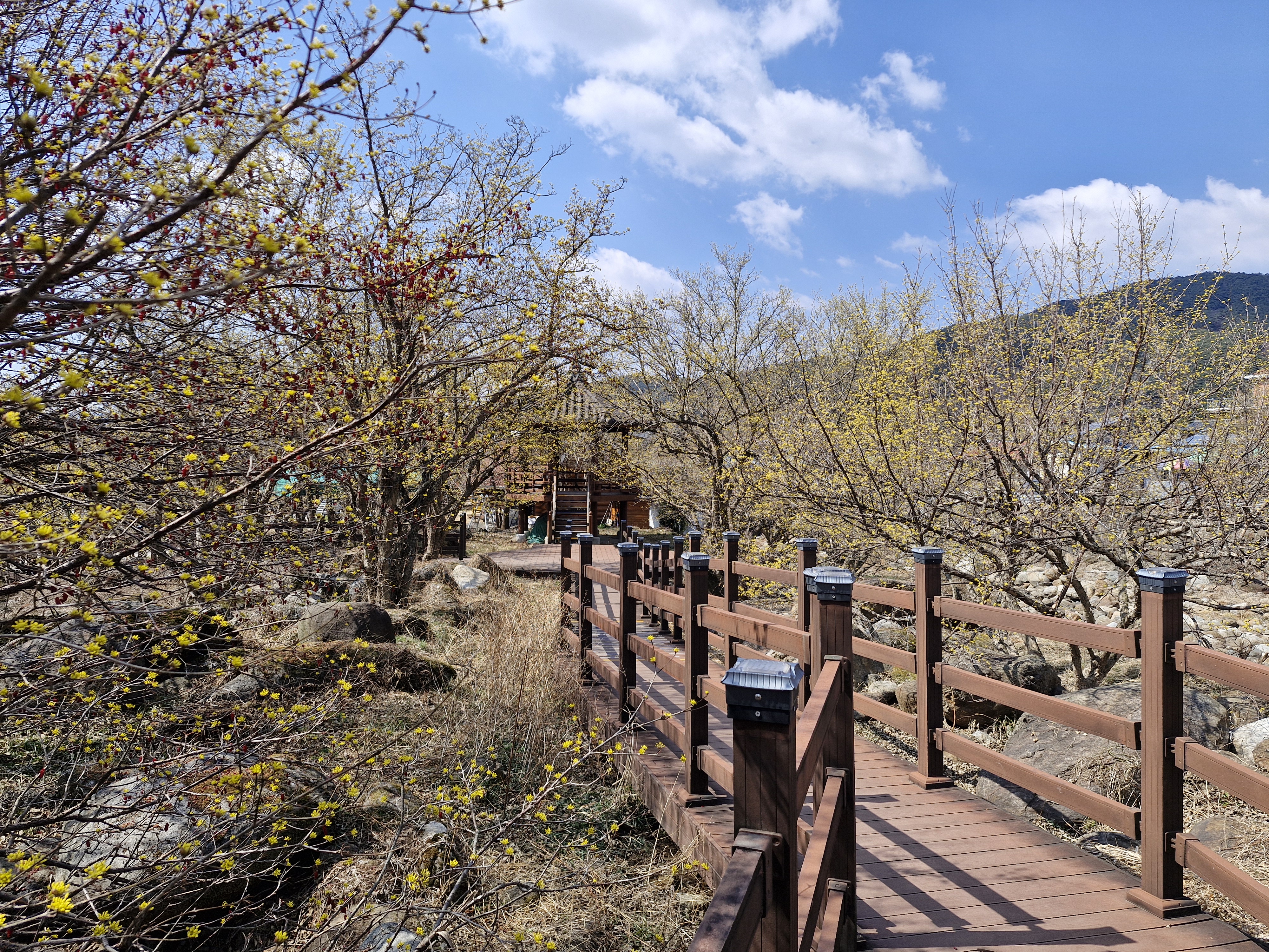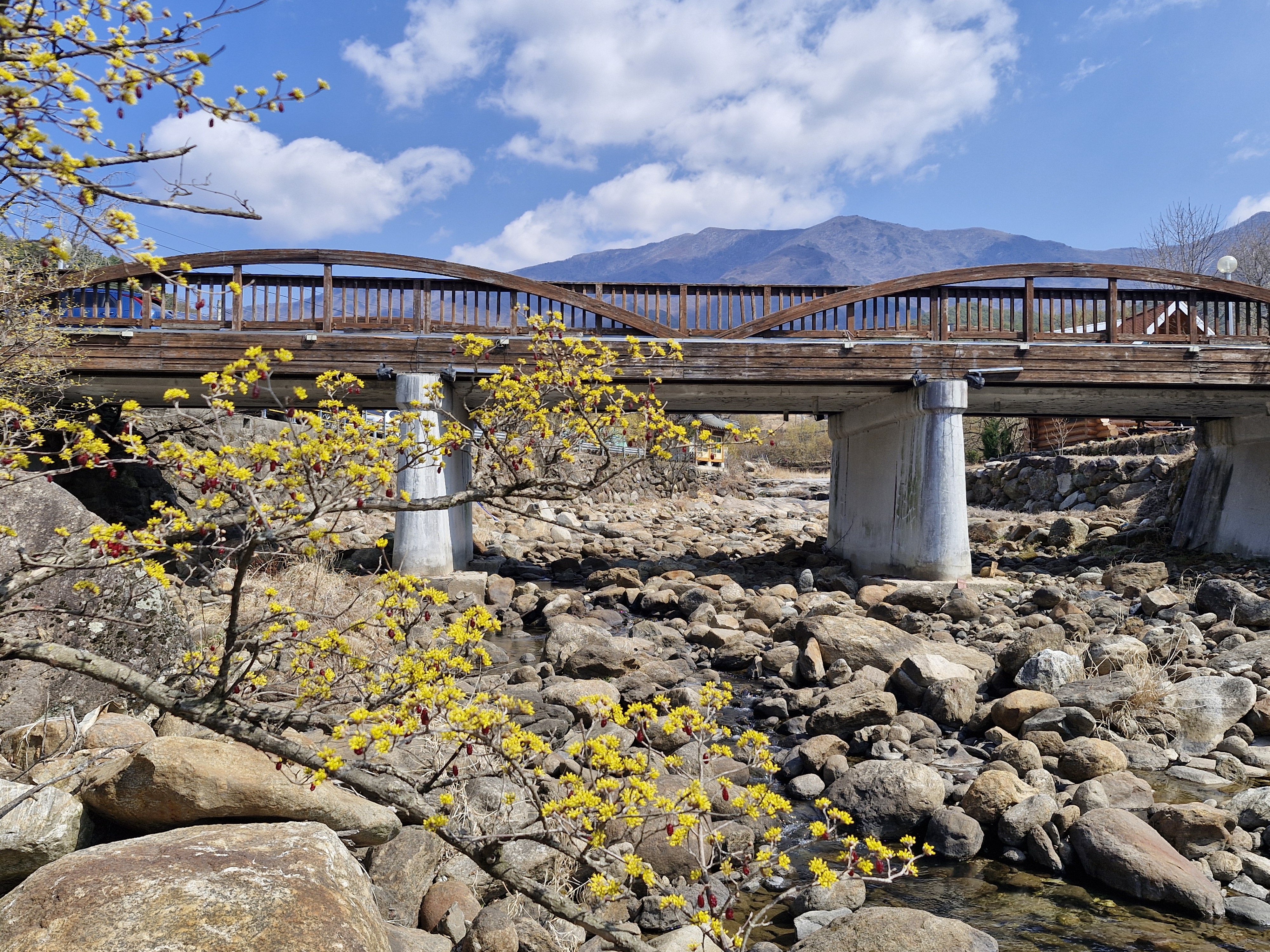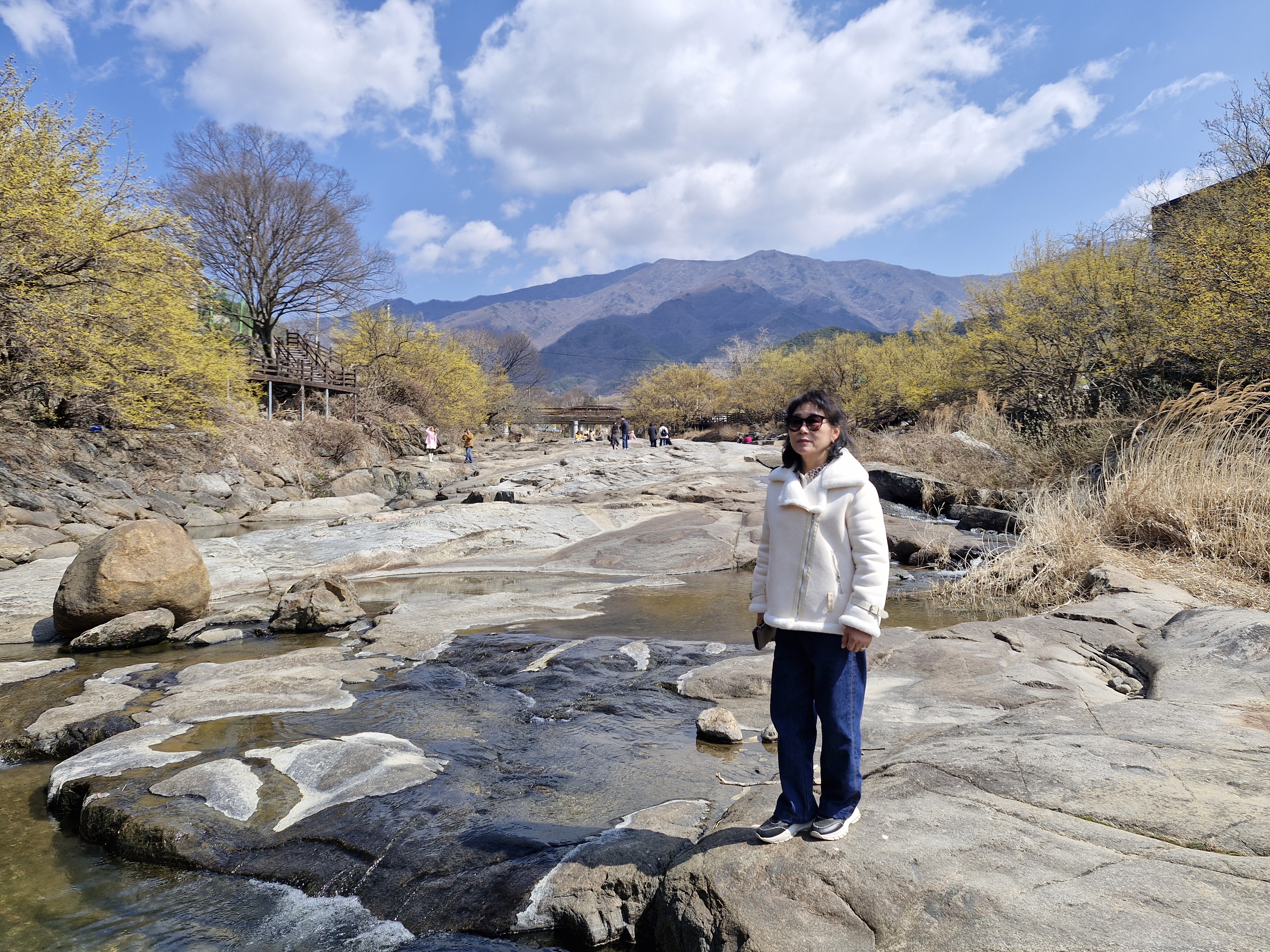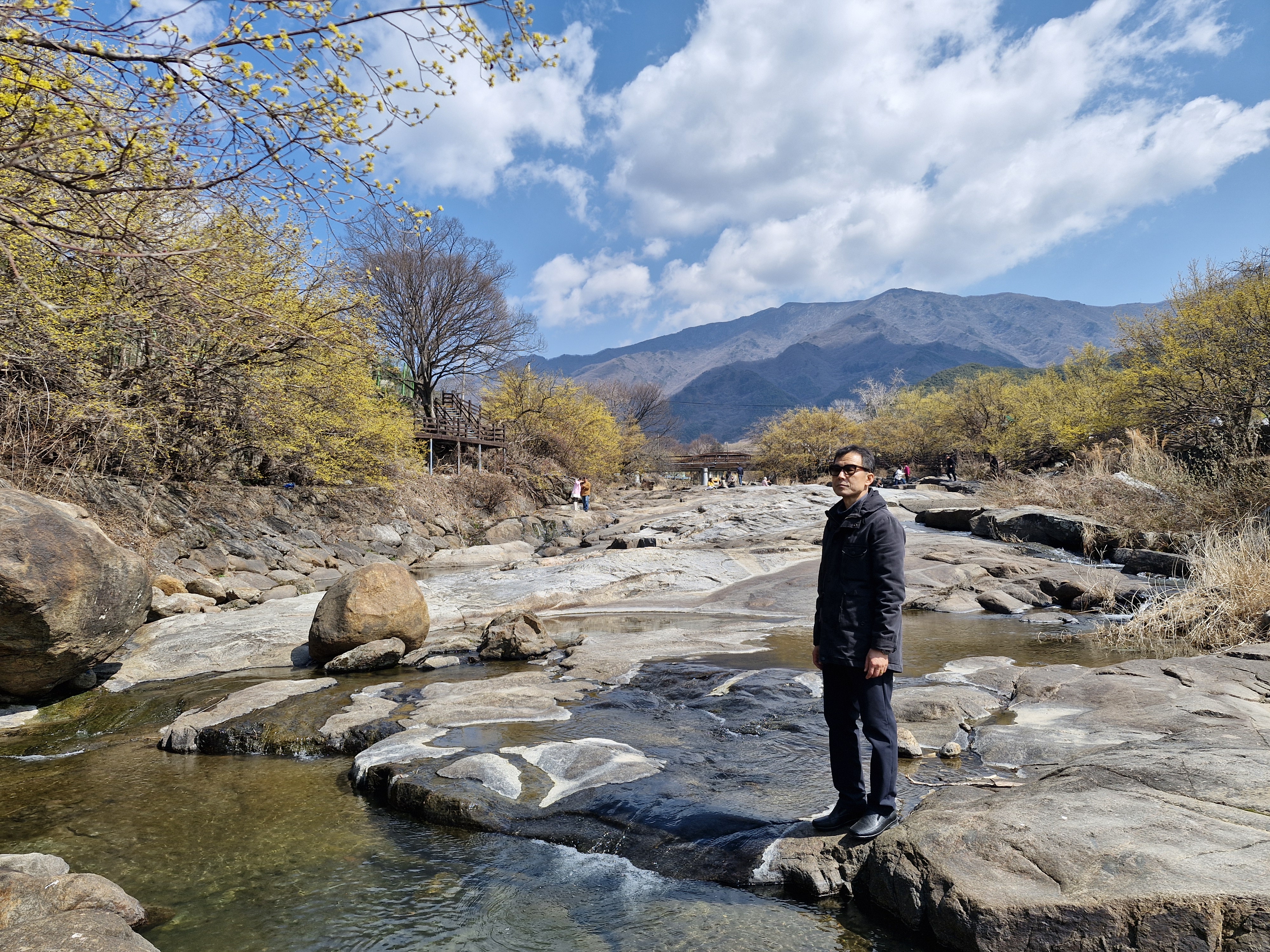 화강암의 너럭바위와 어우러지는 산수유꽃을 즐길 수 있는 서시천으로 내려선다.
