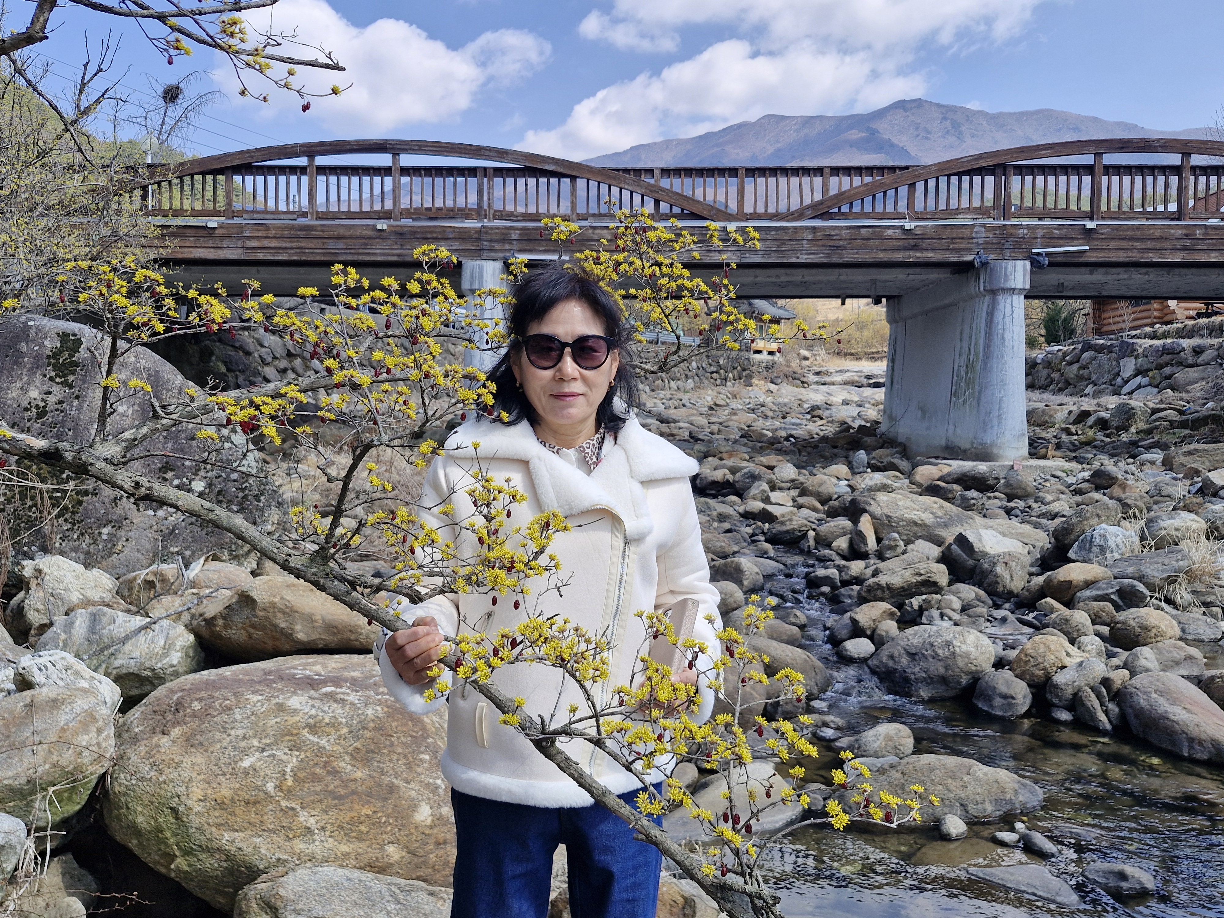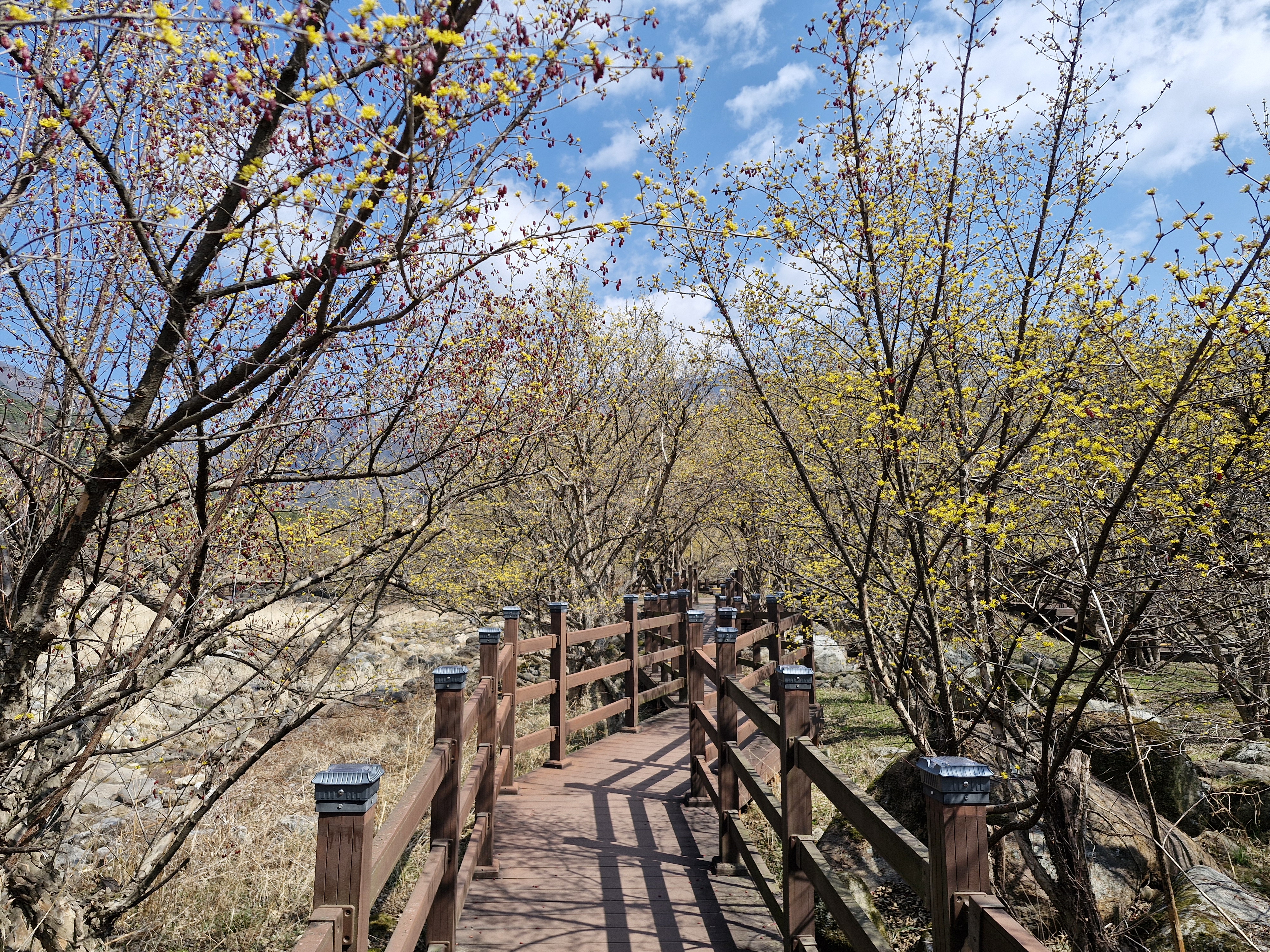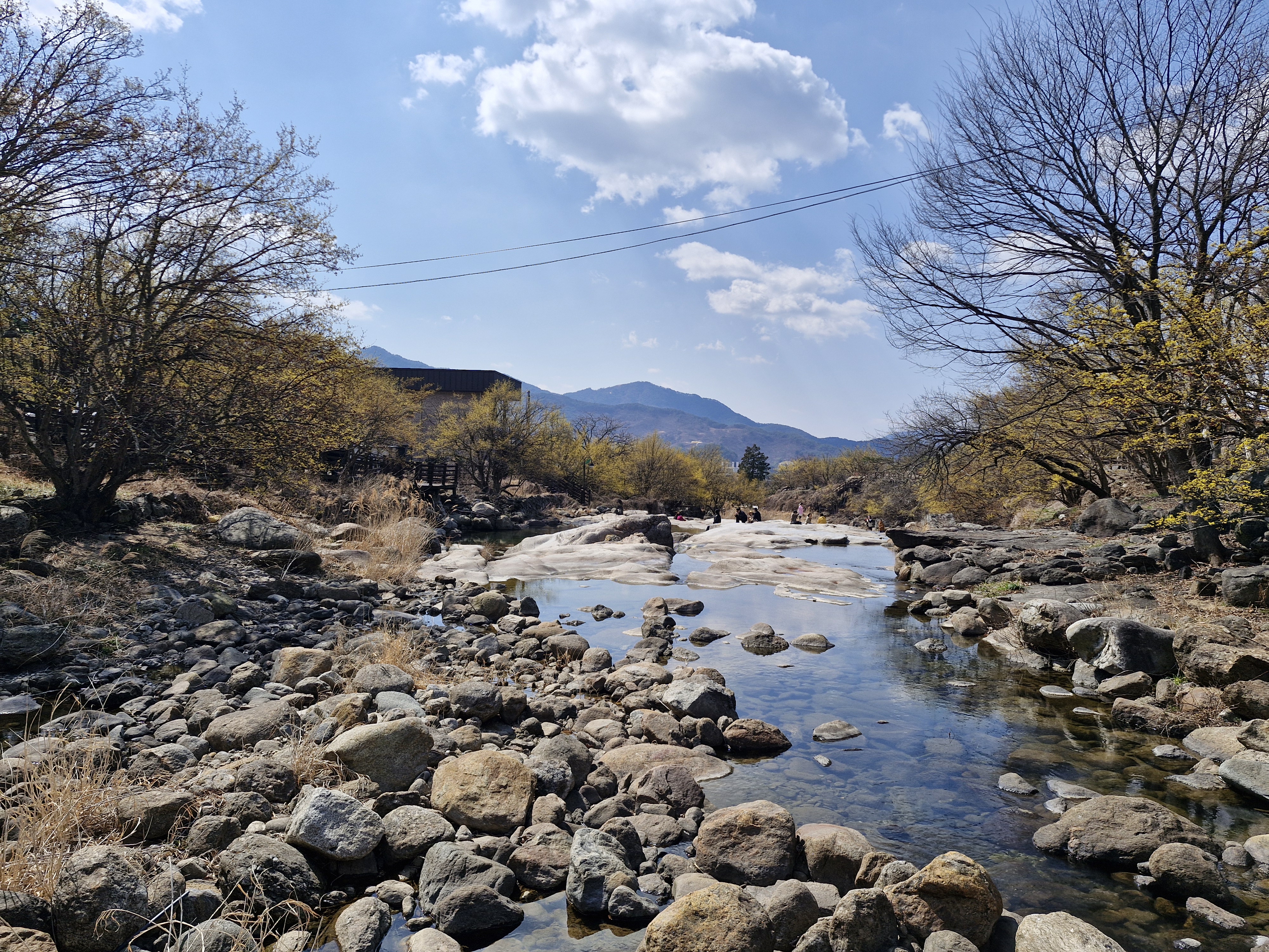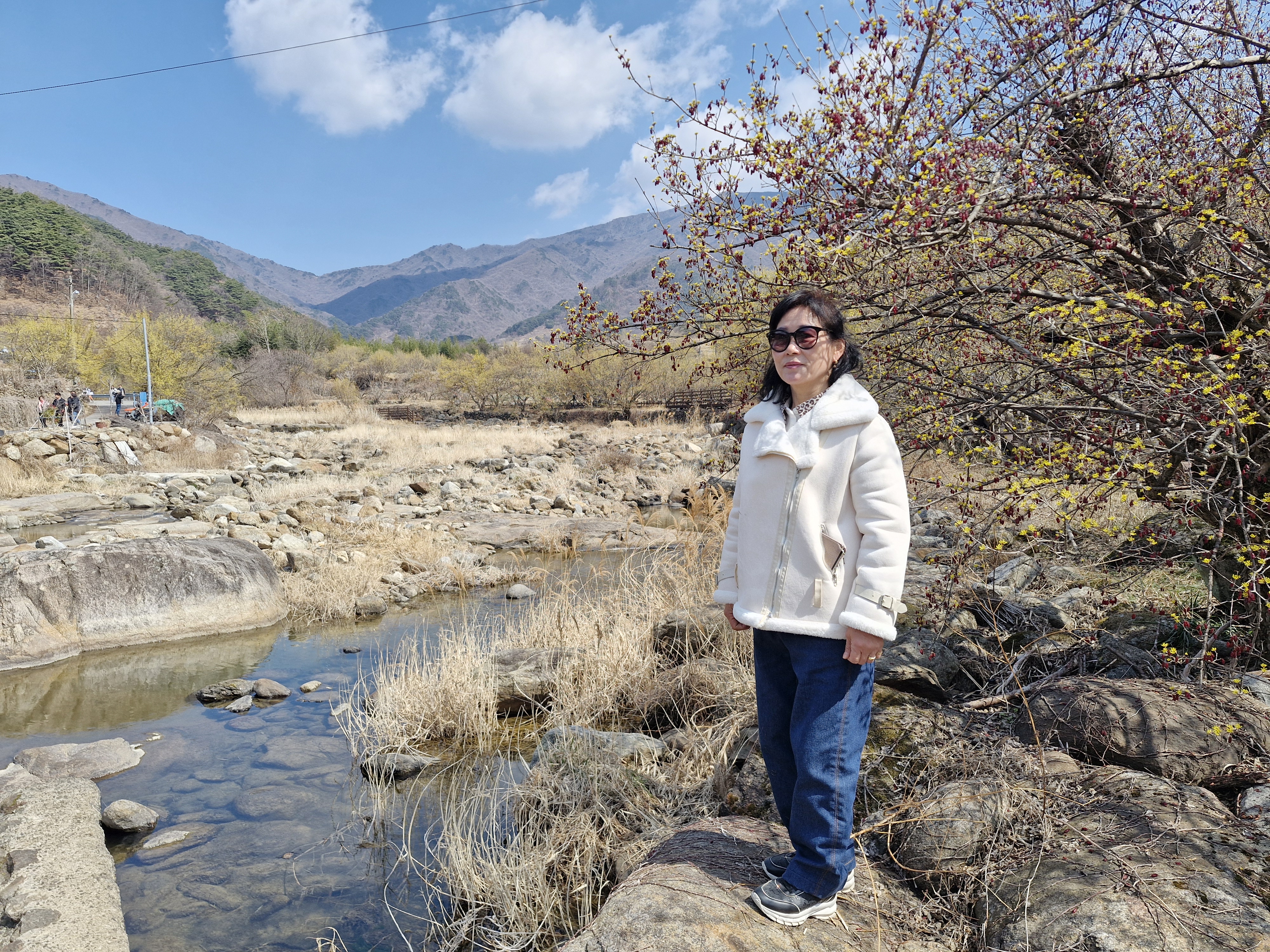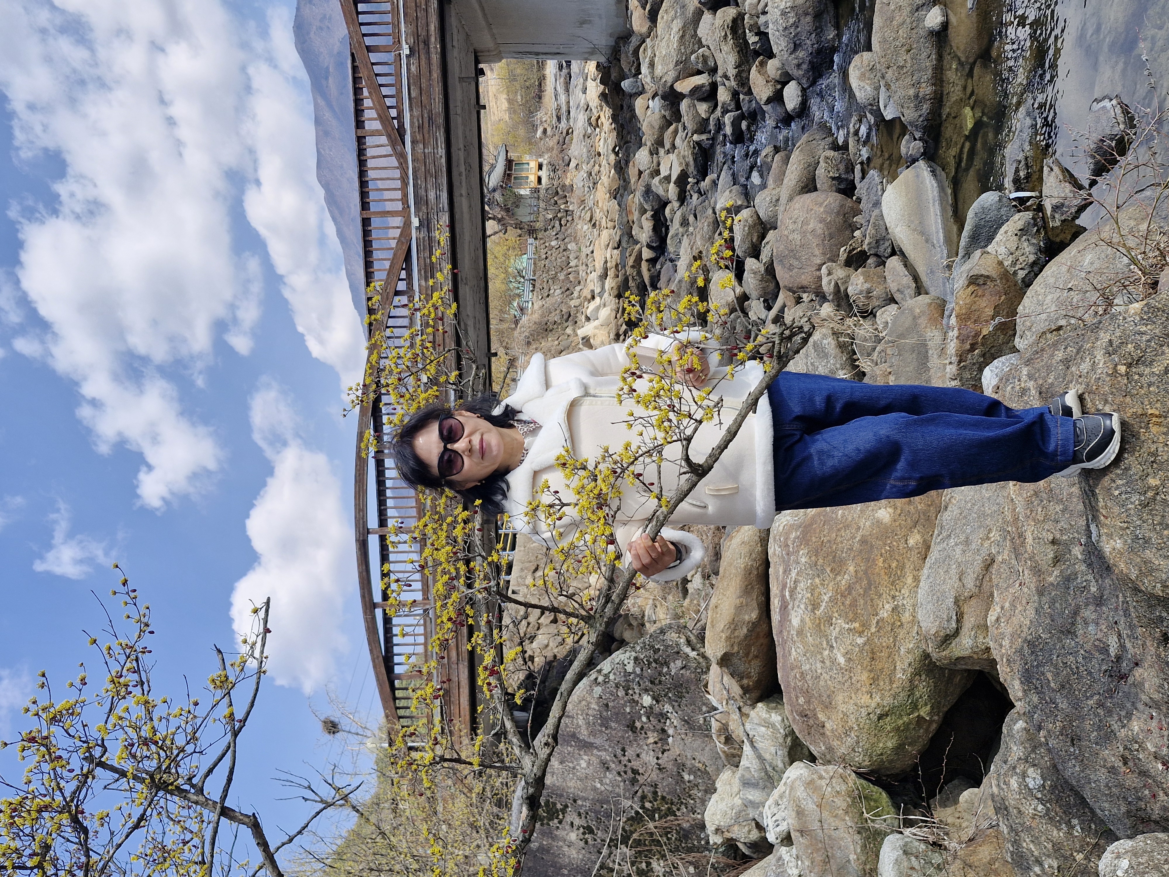 화강암의 너럭바위와 어우러지는 산수유꽃을 즐길 수 있는 서시천으로 내려선다.