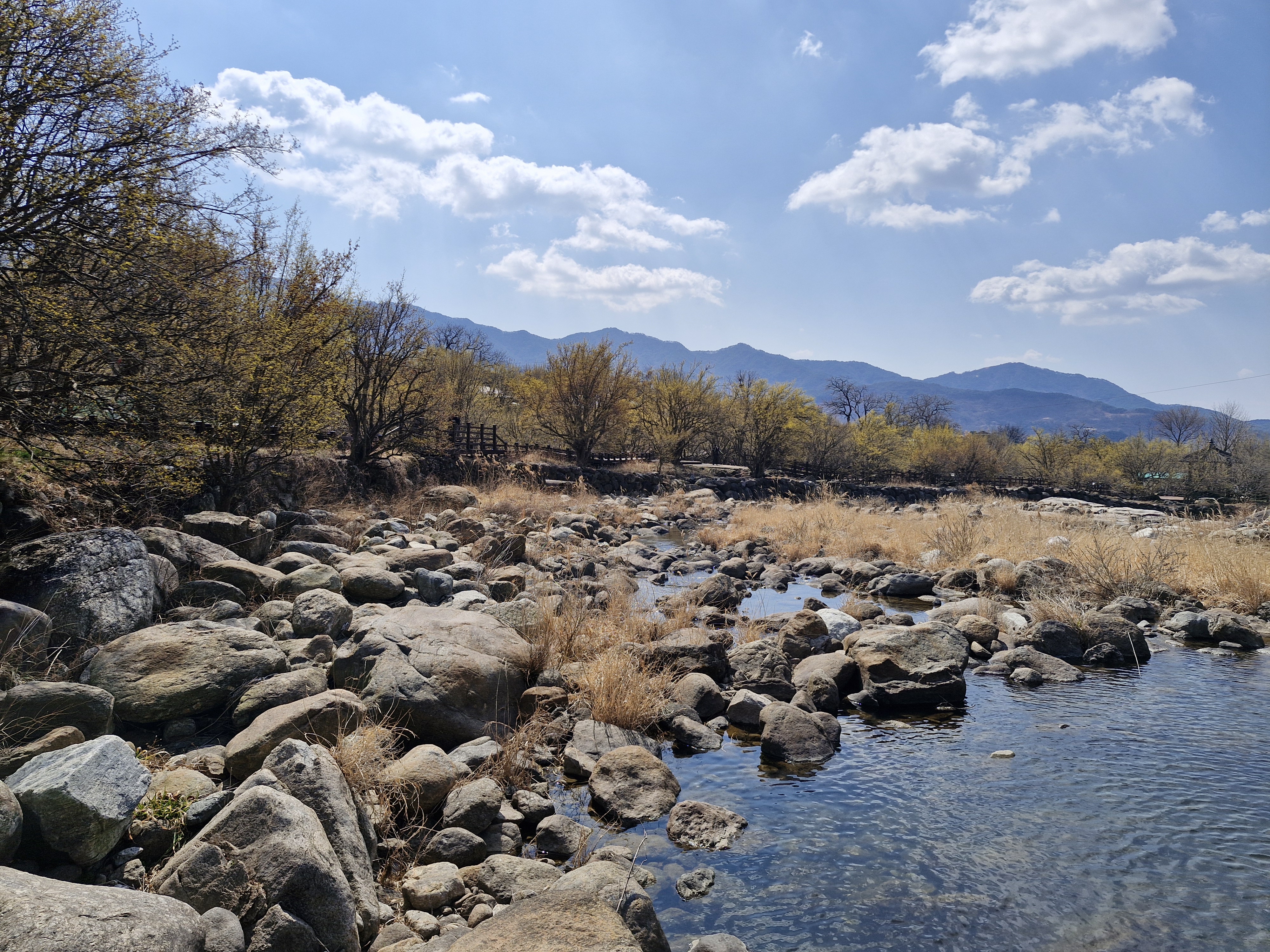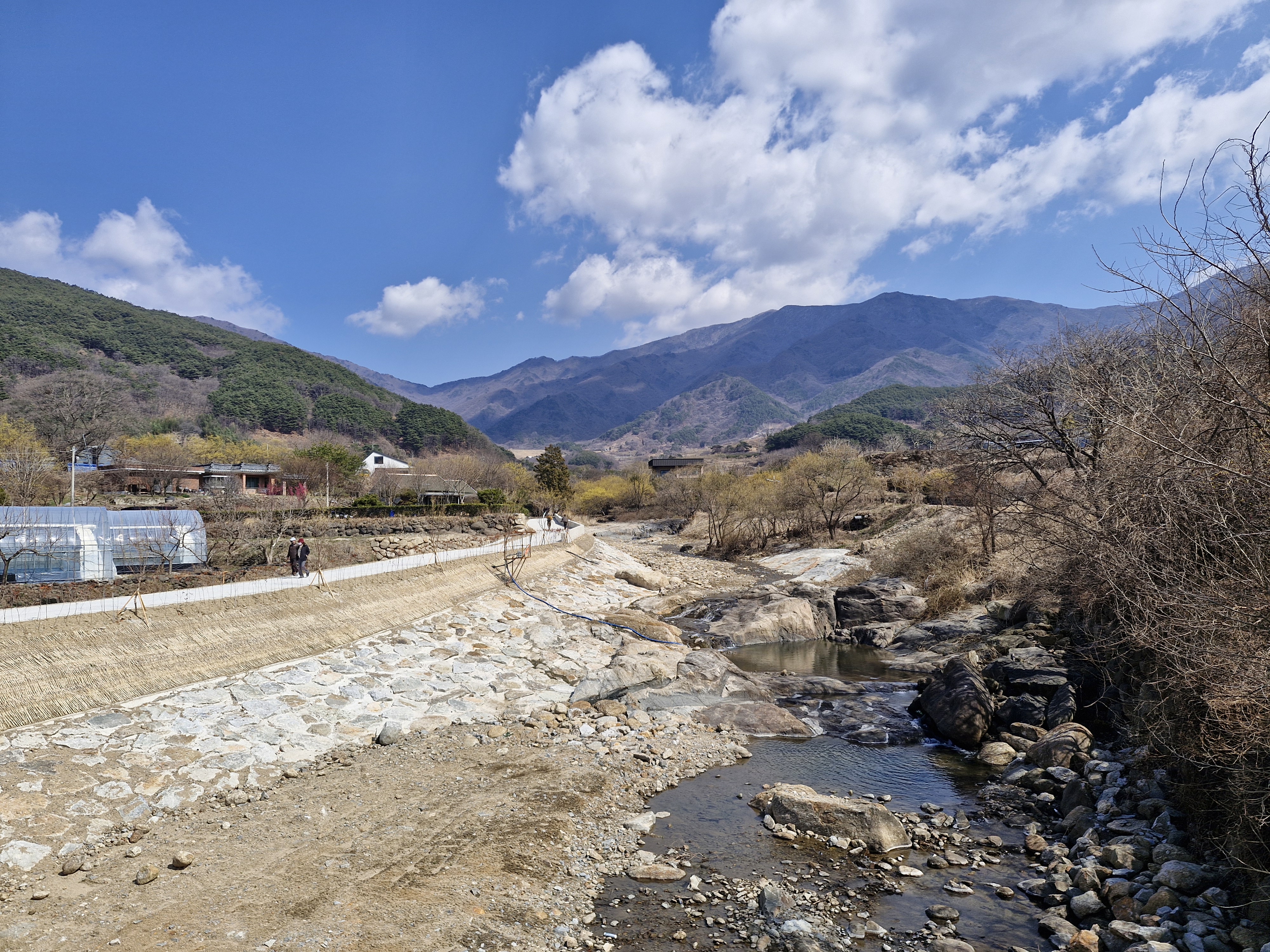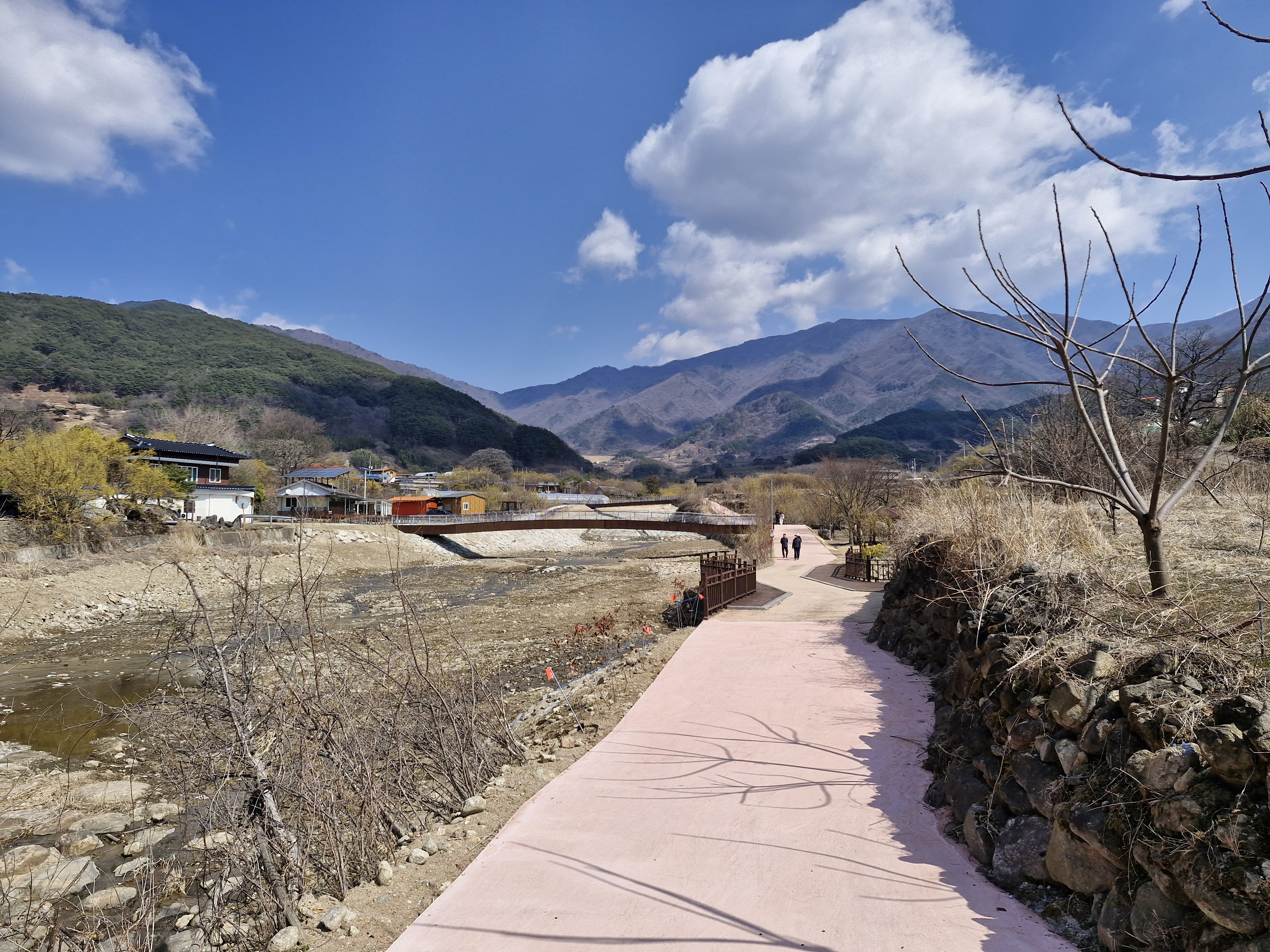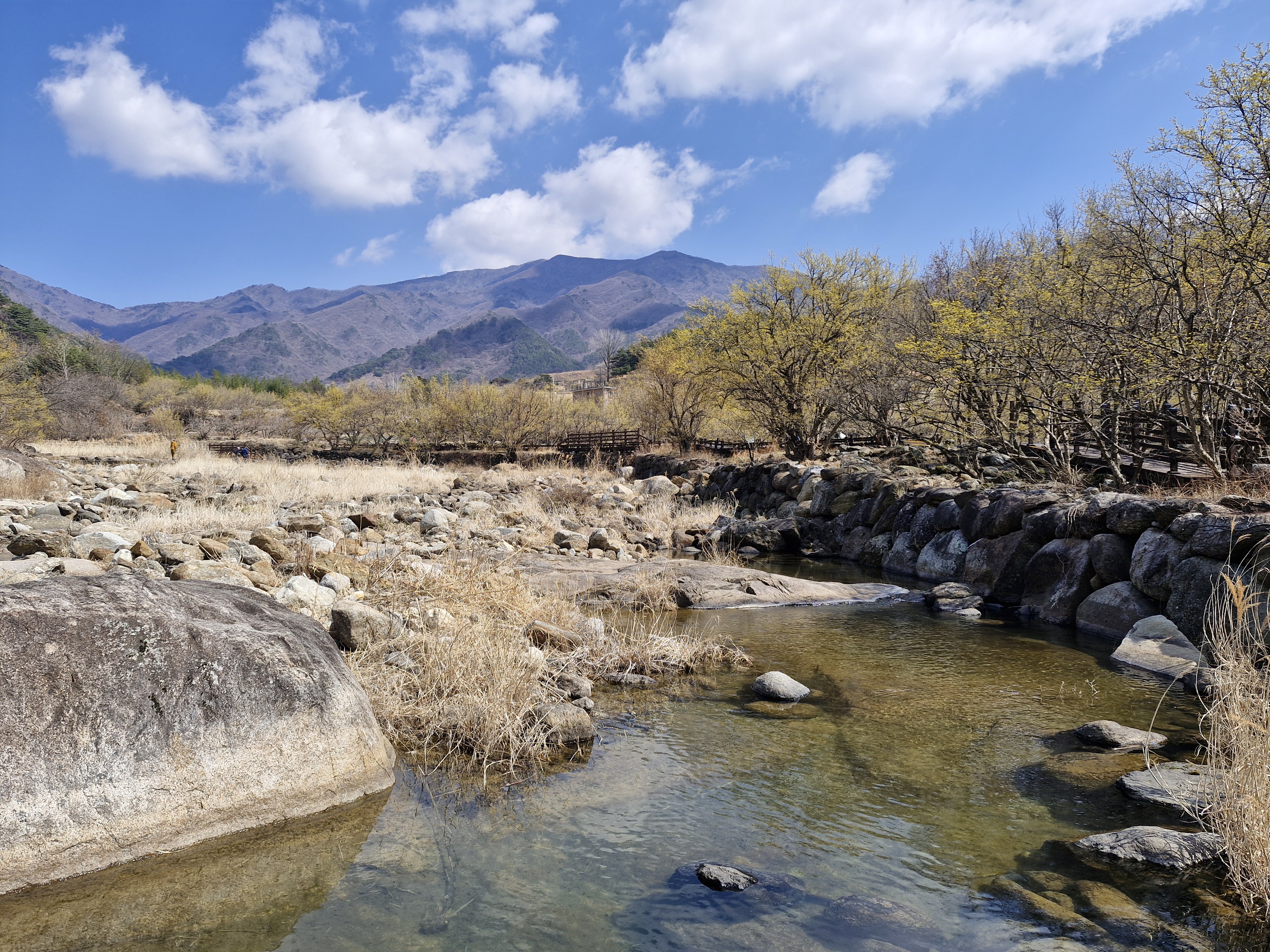 화강암의 너럭바위와 어우러지는 산수유꽃을 즐길 수 있는 서시천으로 내려선다.