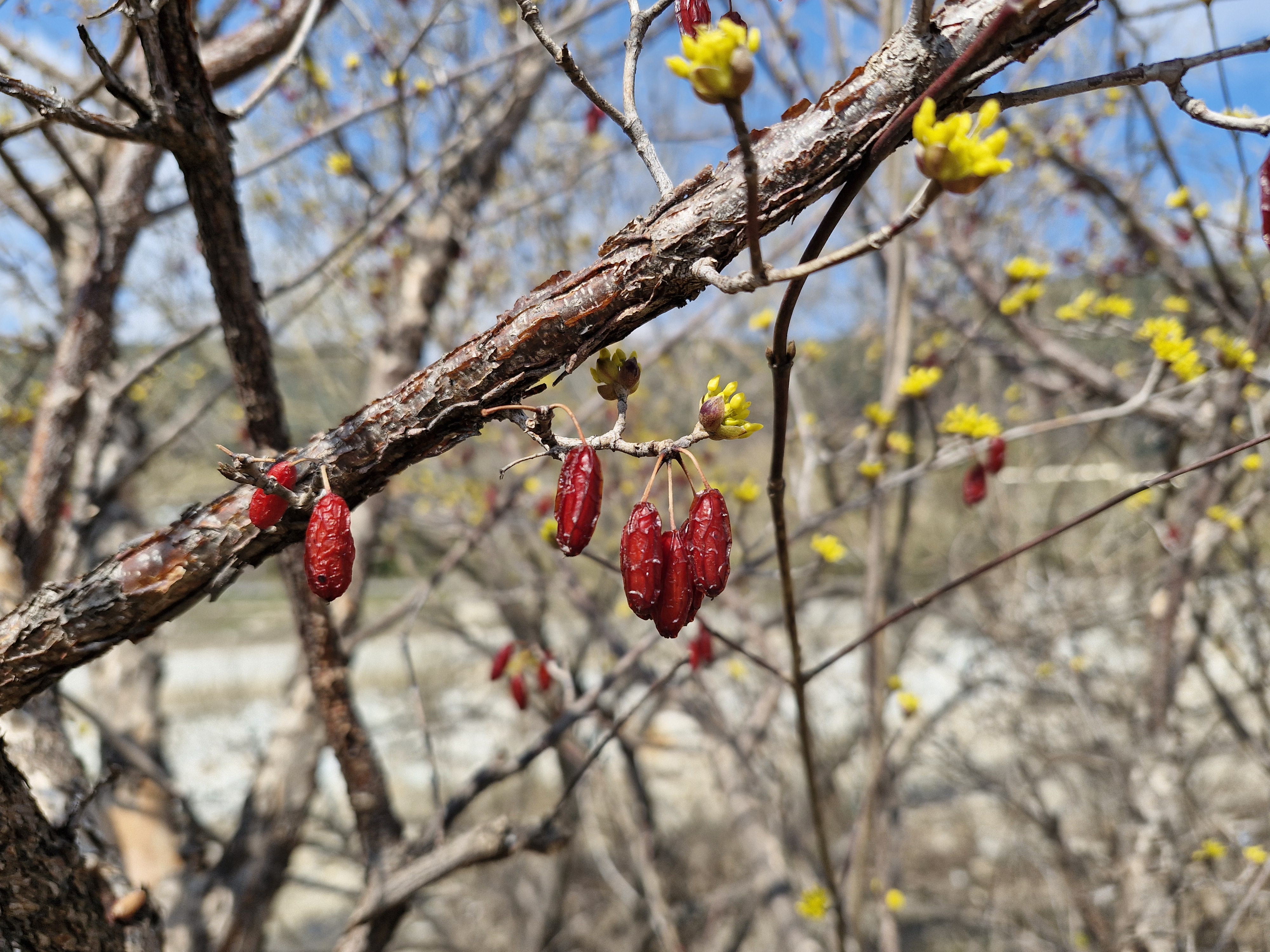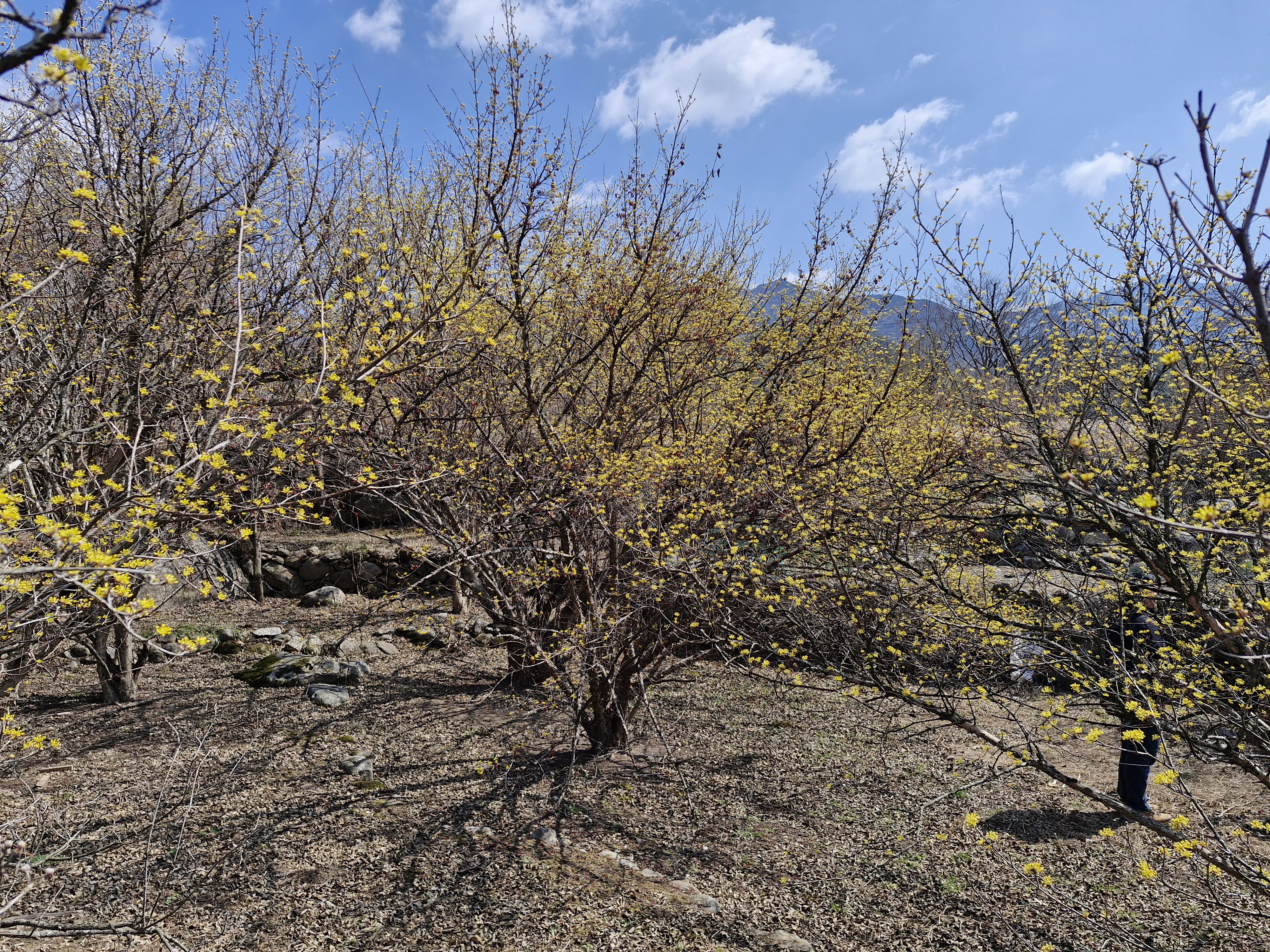 열매를 수확하지 않아서 달려있는 산수유나무는 꽃몽우리를 많이 달지 못하고 있고...