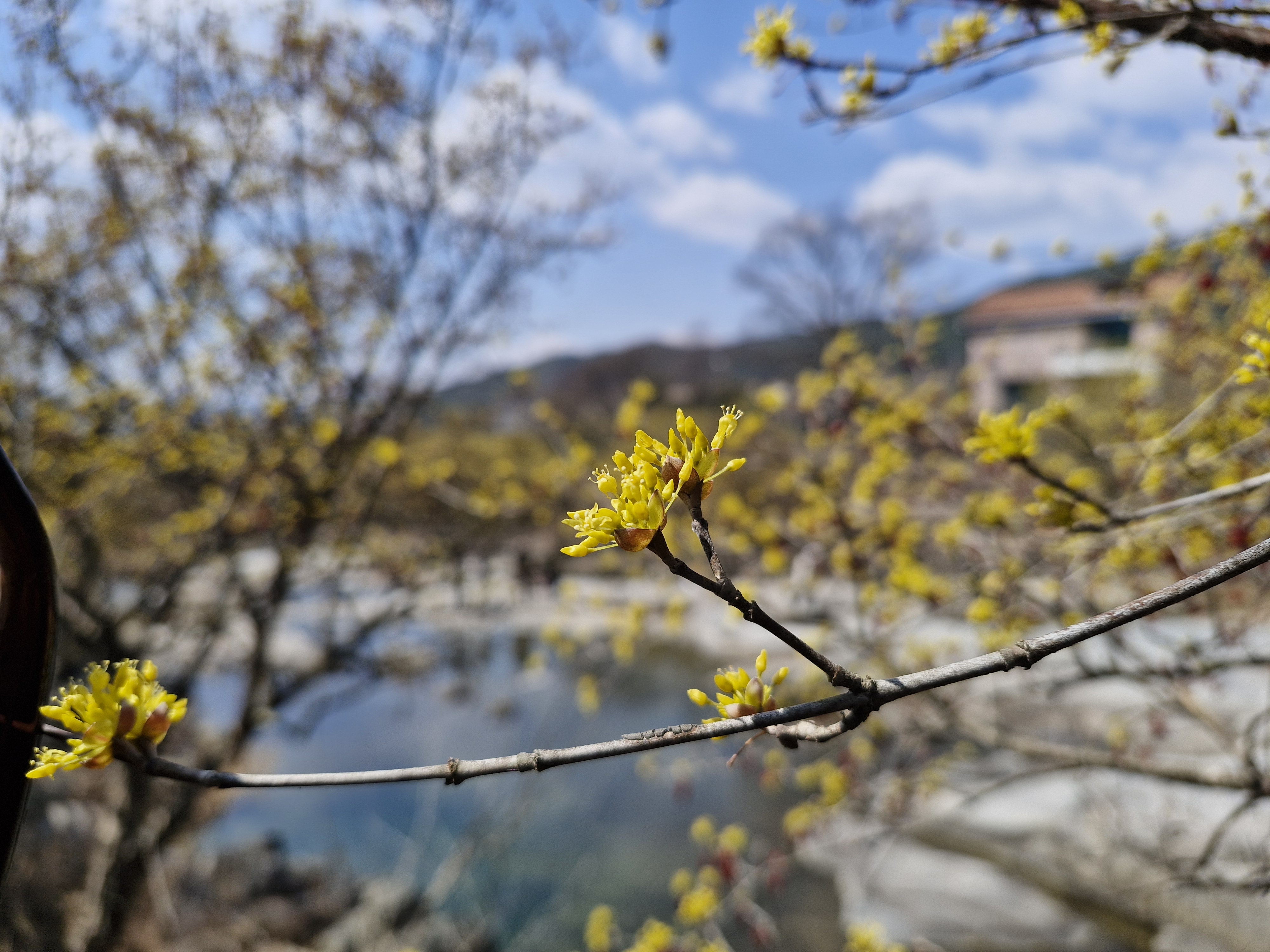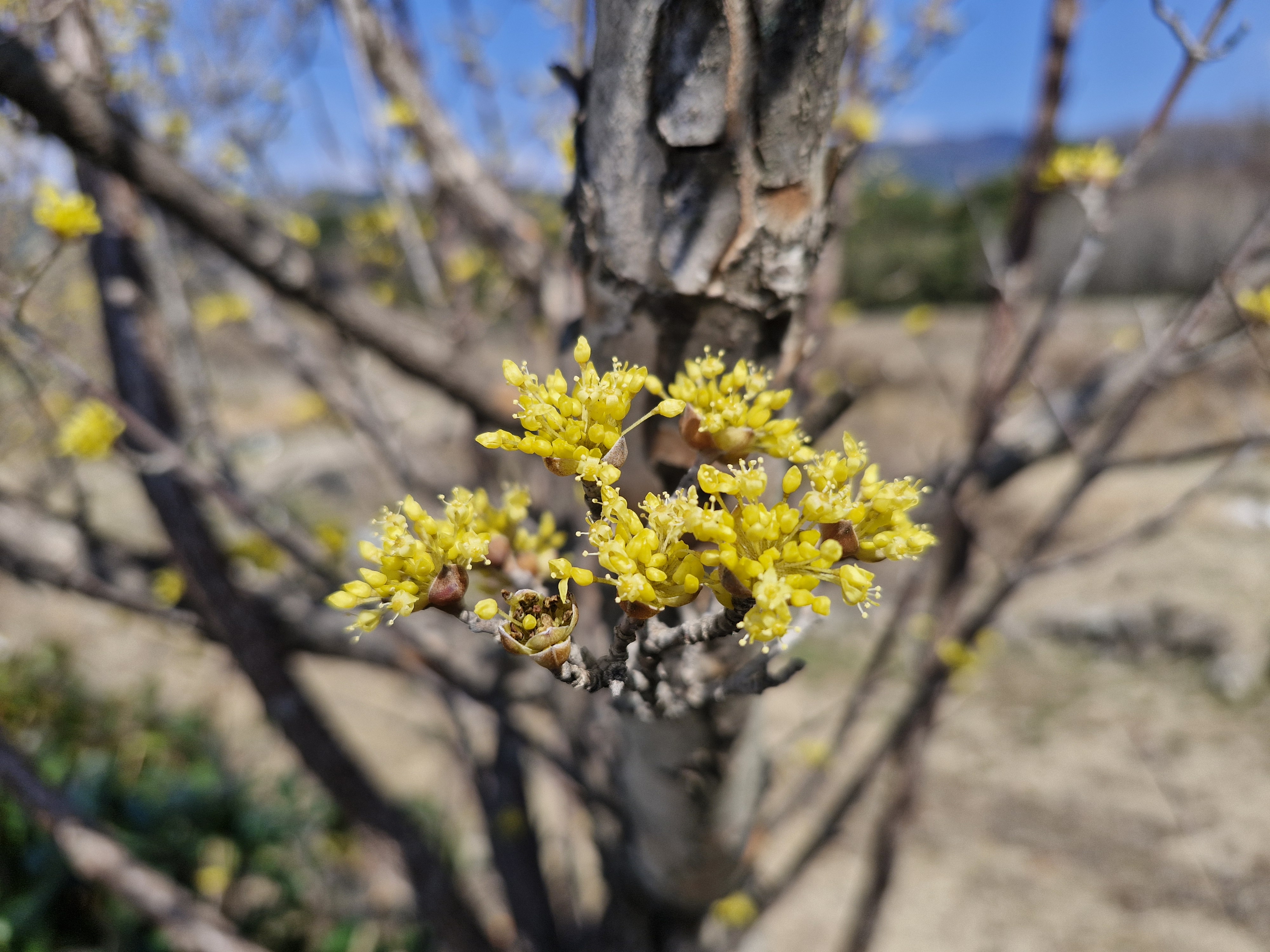 개화가 조금은 아쉬운 산수유꽃이다.