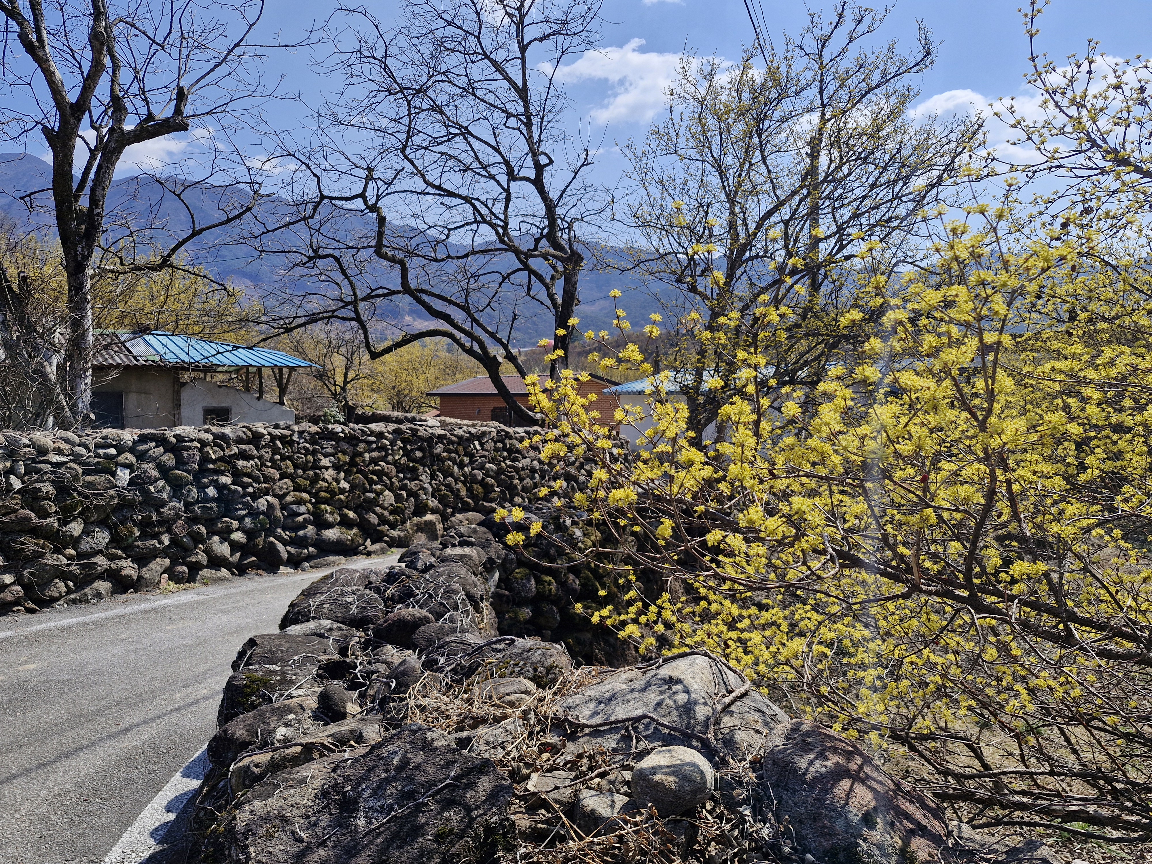 집들이며 돌담들이 바람을 막아서 그런지 마을안쪽 골목의 산수유꽃은 활짝 핀 느낌이다.