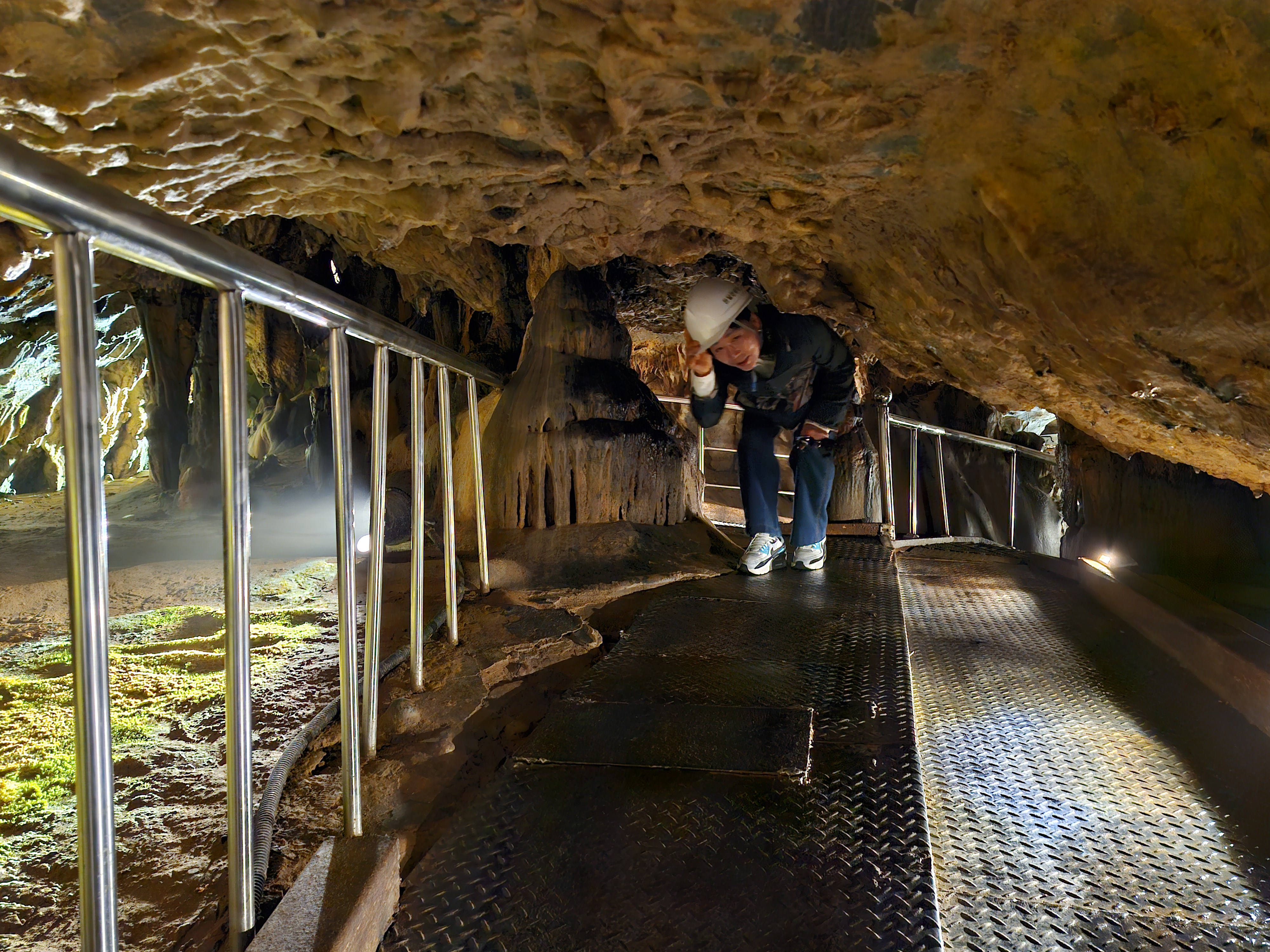 온달동굴은 안전모를 착용하고 입장해야 한다.