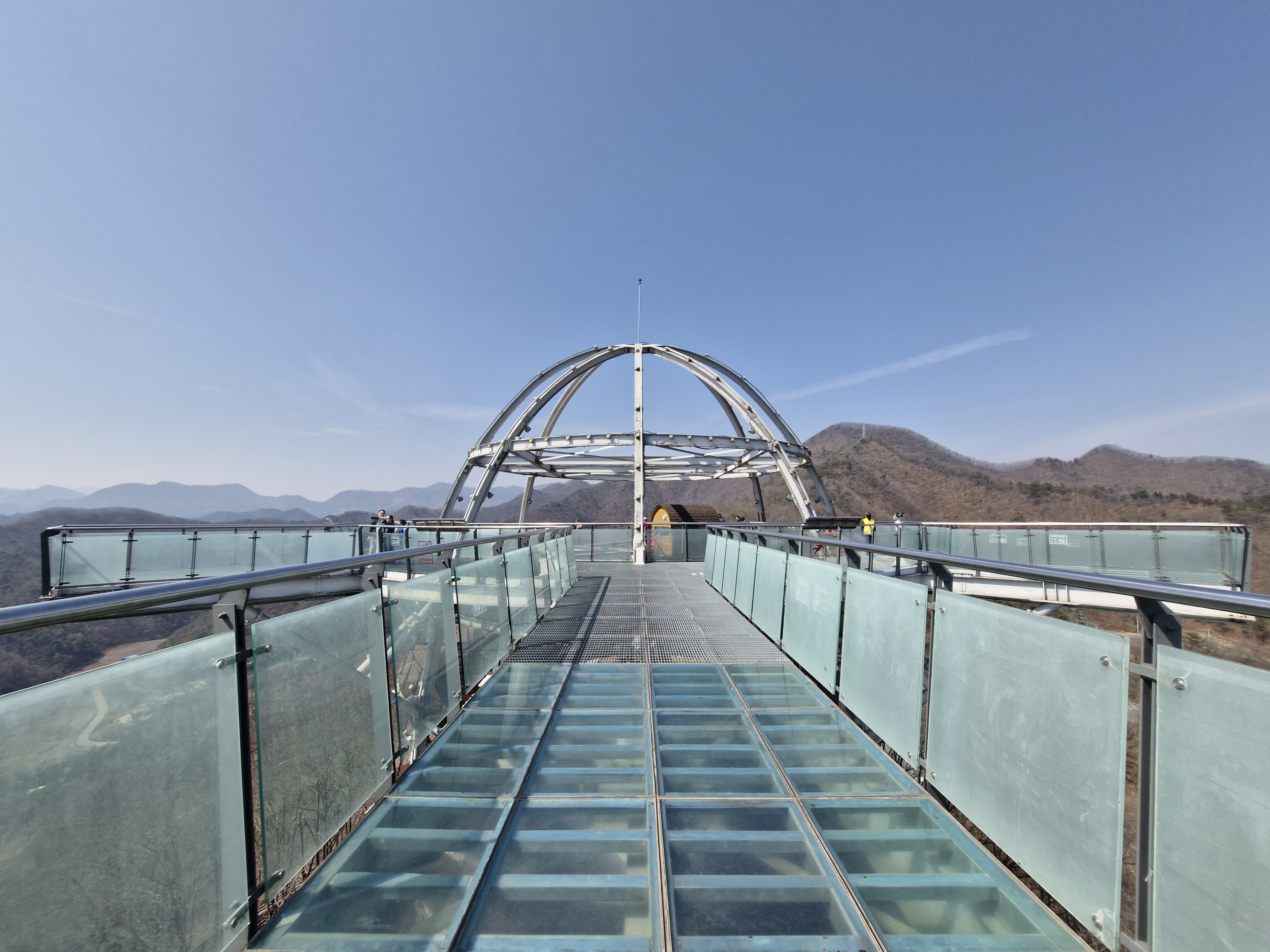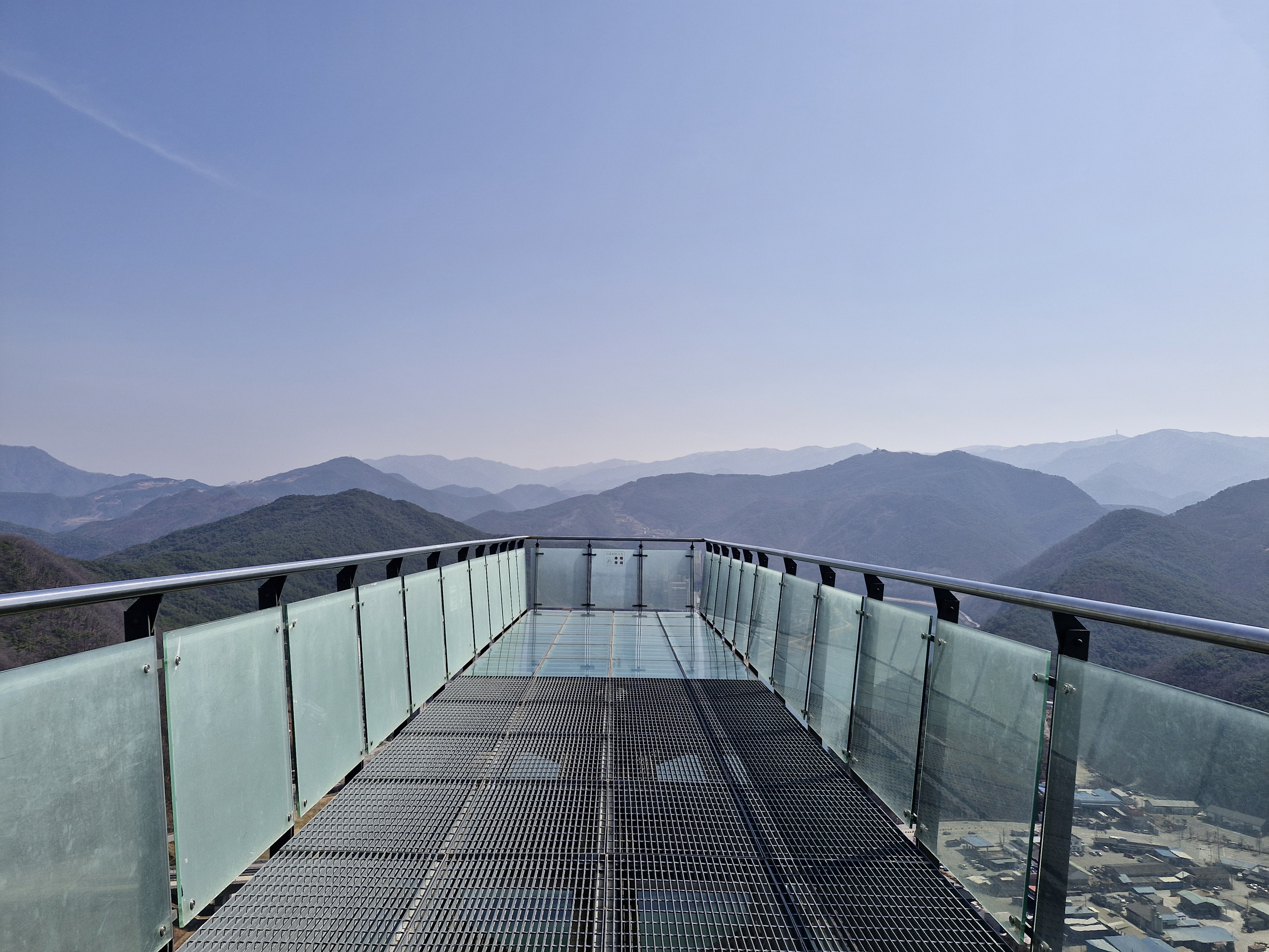 잔도길과 그 절벽면 산 위의 만천하스카이워크가 하나의 구조물처럼 보인다.