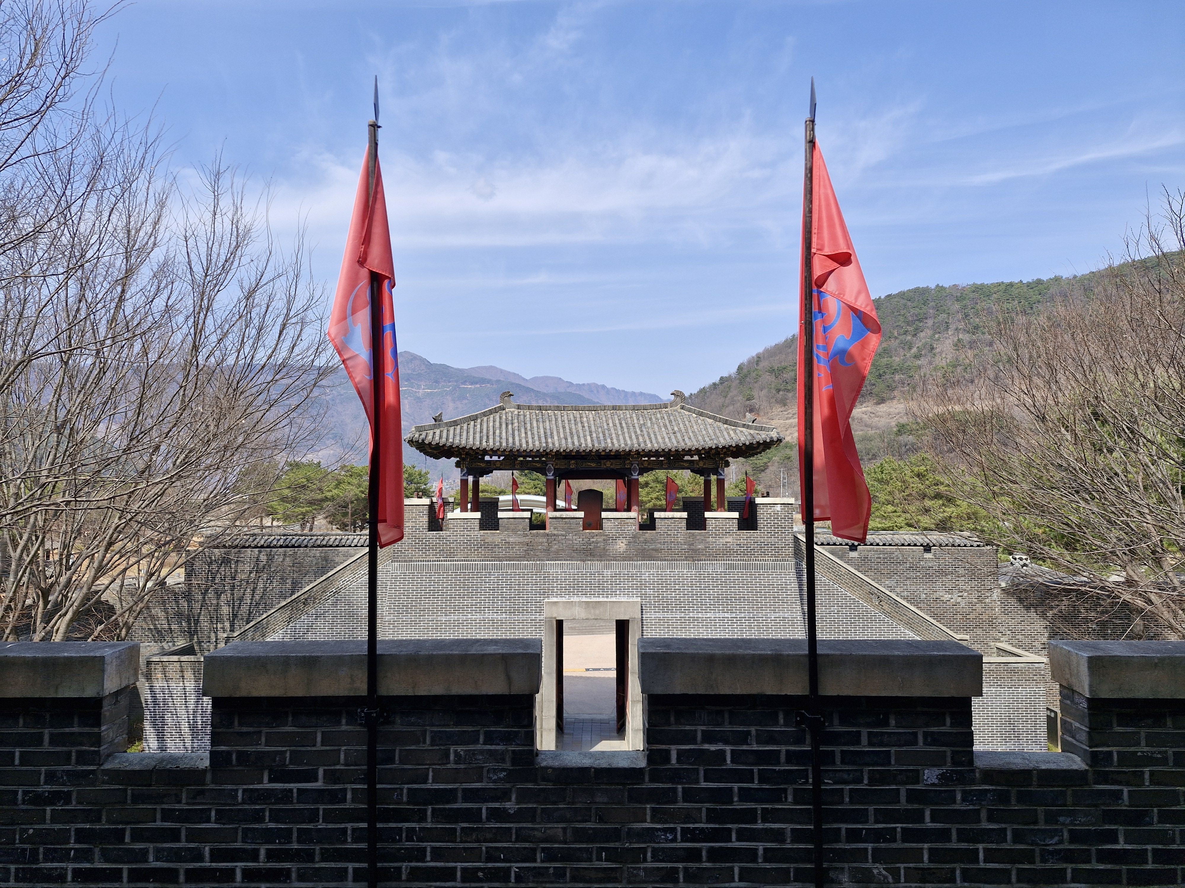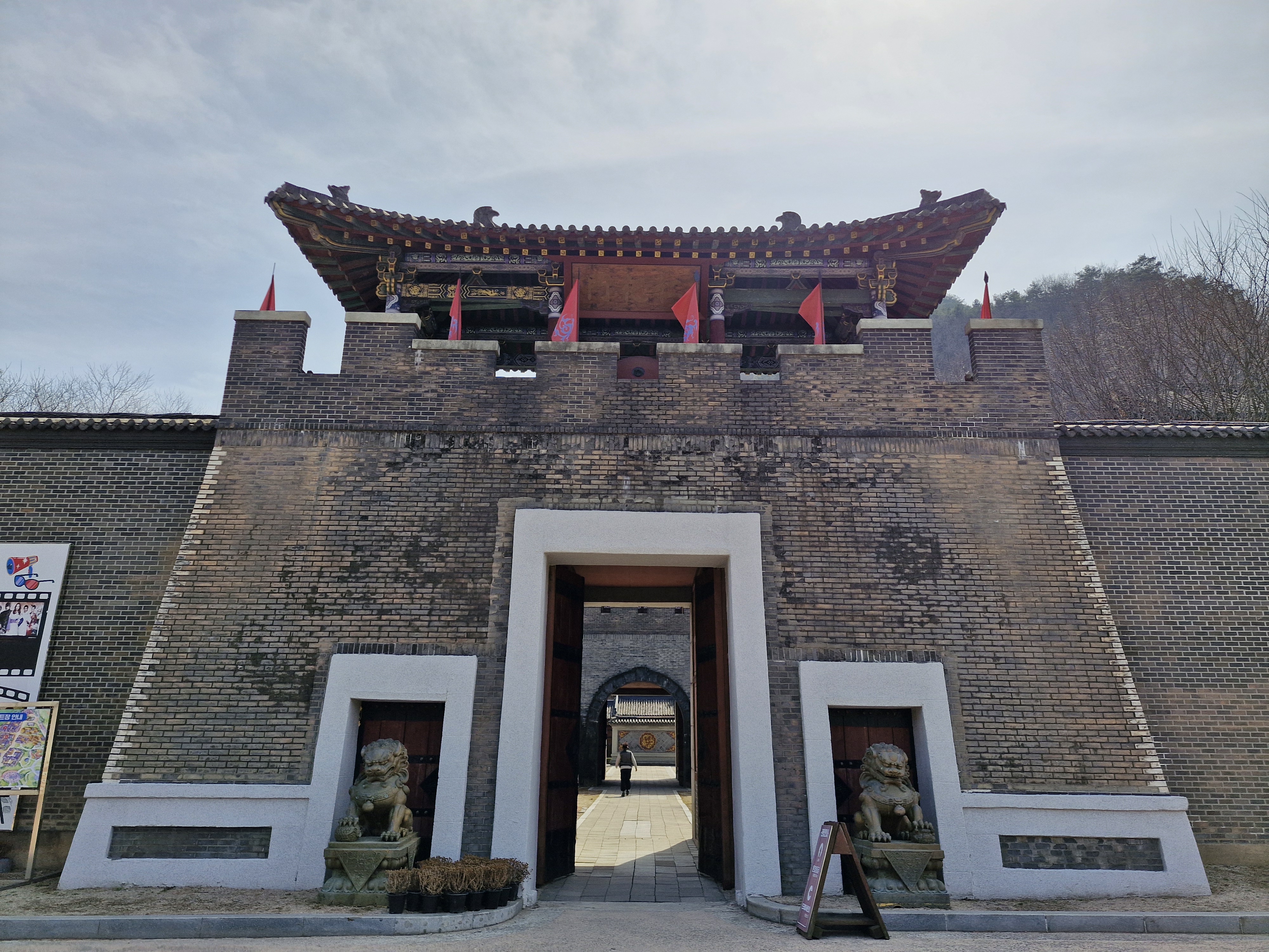 입구 조형물을 지나면 바로 드라마 세트장 성벽이 보이고...