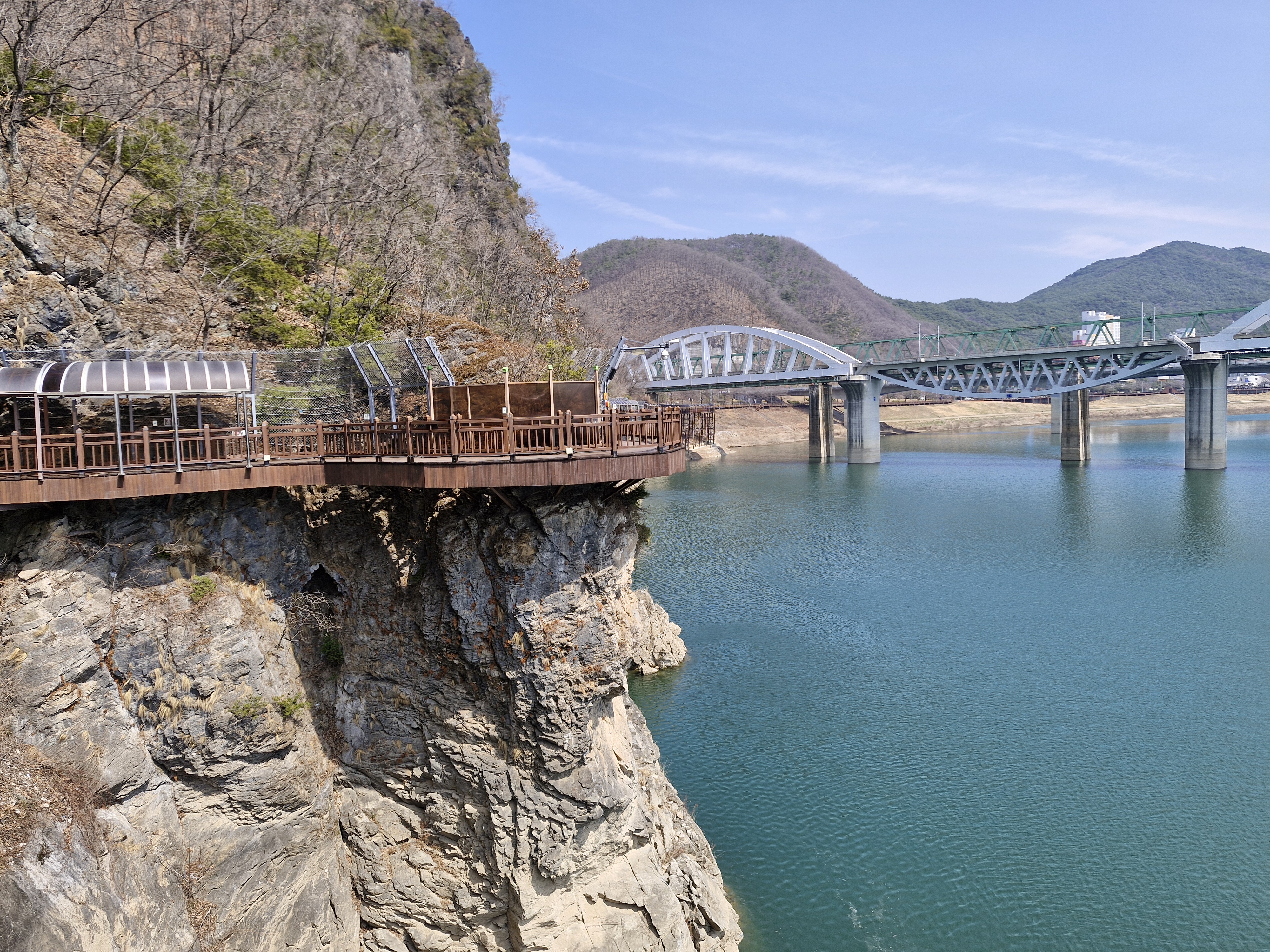 단양군 적성면 애곡리에 위치한 총길이 1.2km의 단양강 잔도길은 남한강 암벽을 따라 걸으며 낭만과 스릴을 느낄 수 있다.