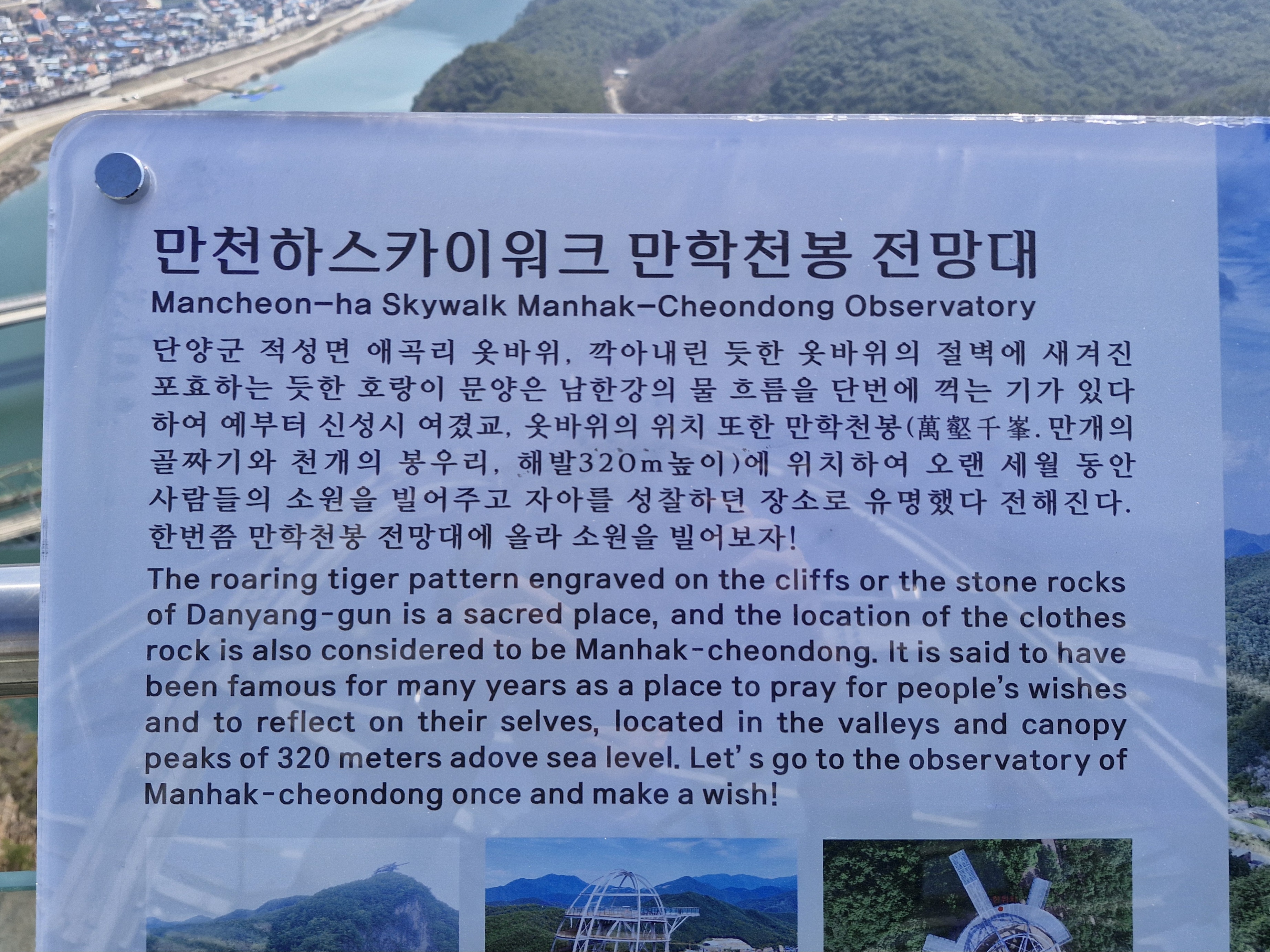 말굽형의 만학천봉 전망대에 올라서면 단양 시내 전경과 멀리 소백산 연화봉을 볼 수 있고, 세 손가락 형태의 길이 15m, 폭 2m의 고강도 유리를 통해 발밑에 흐르는 남한강을 내려다볼 수 있다.
