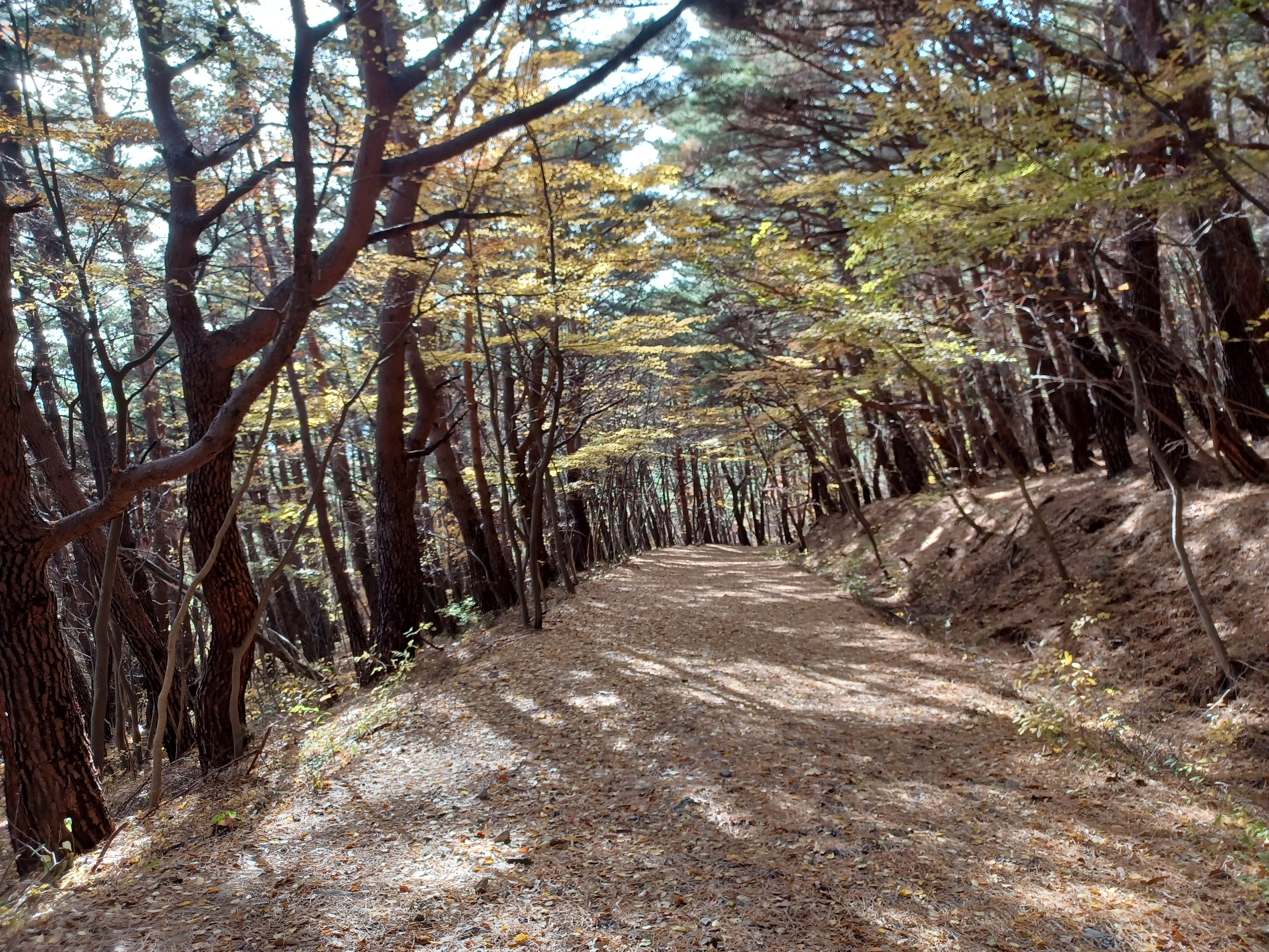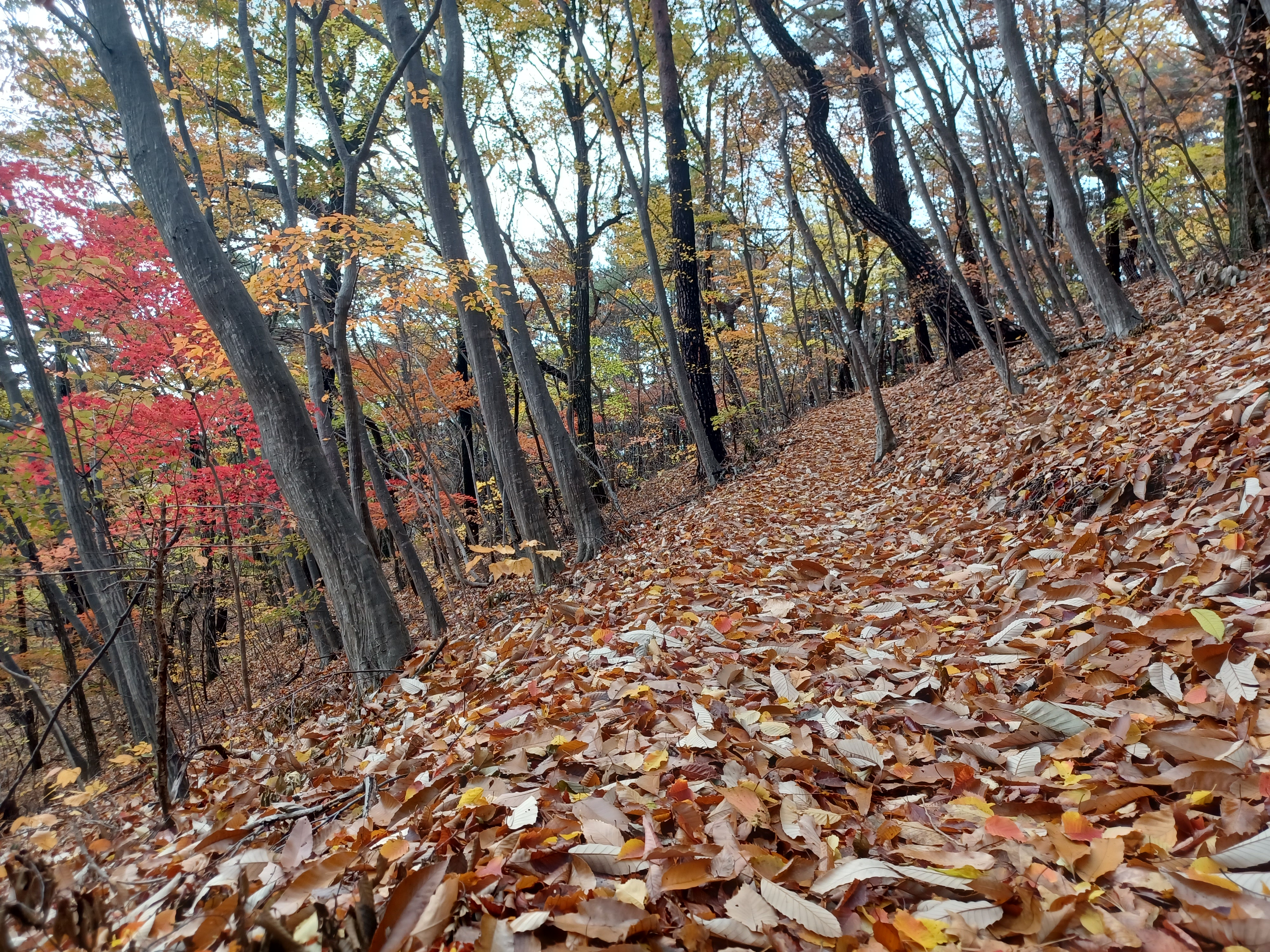 밋밋하고 지겨운 임도의 자갈길이 낙엽으로 융단을 깔아놓은 듯 멋스럽다.