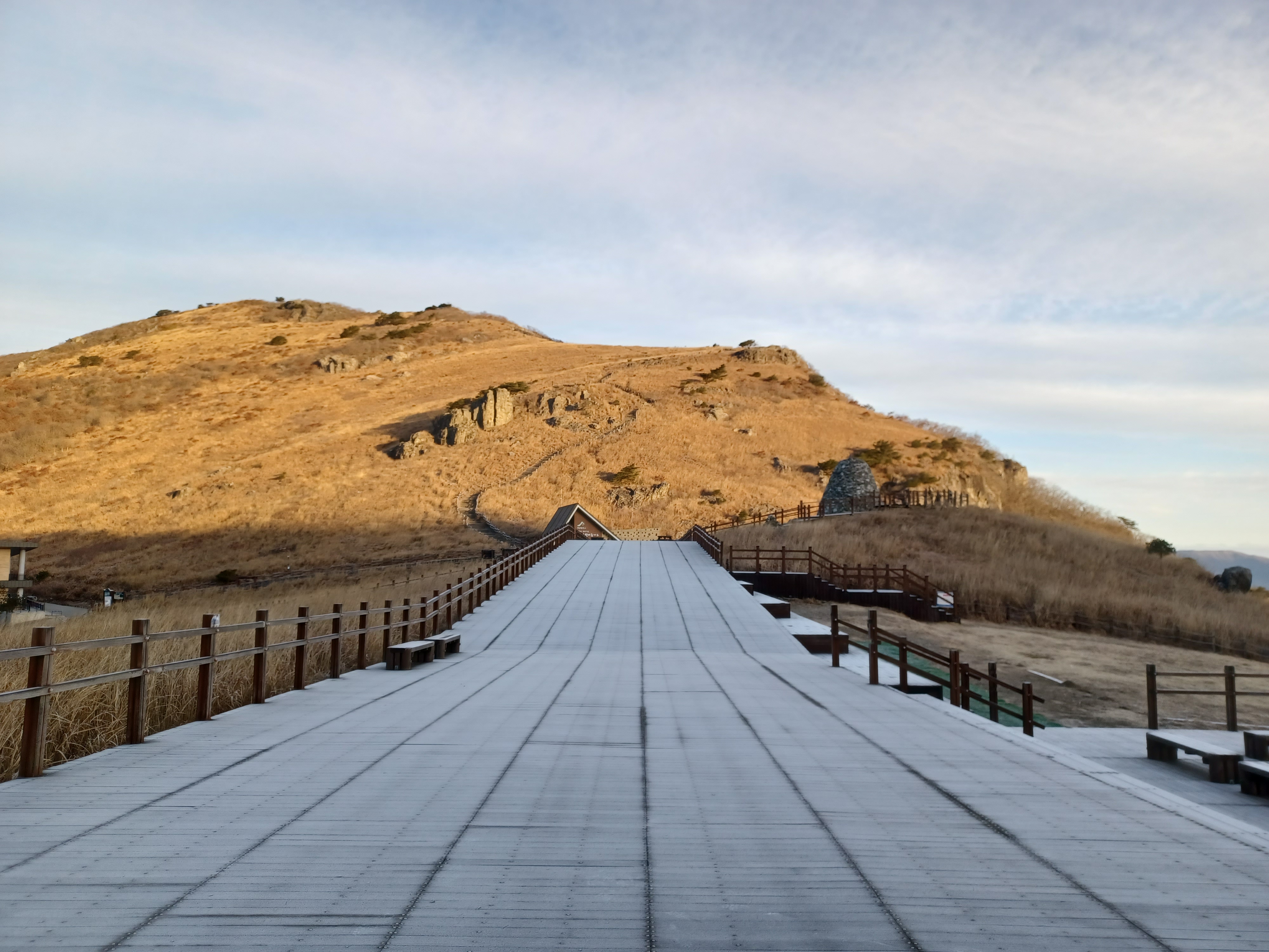 간월재 데크는 하얗게 덮인 서리가 눈이 내린 것 같은 느낌이다.