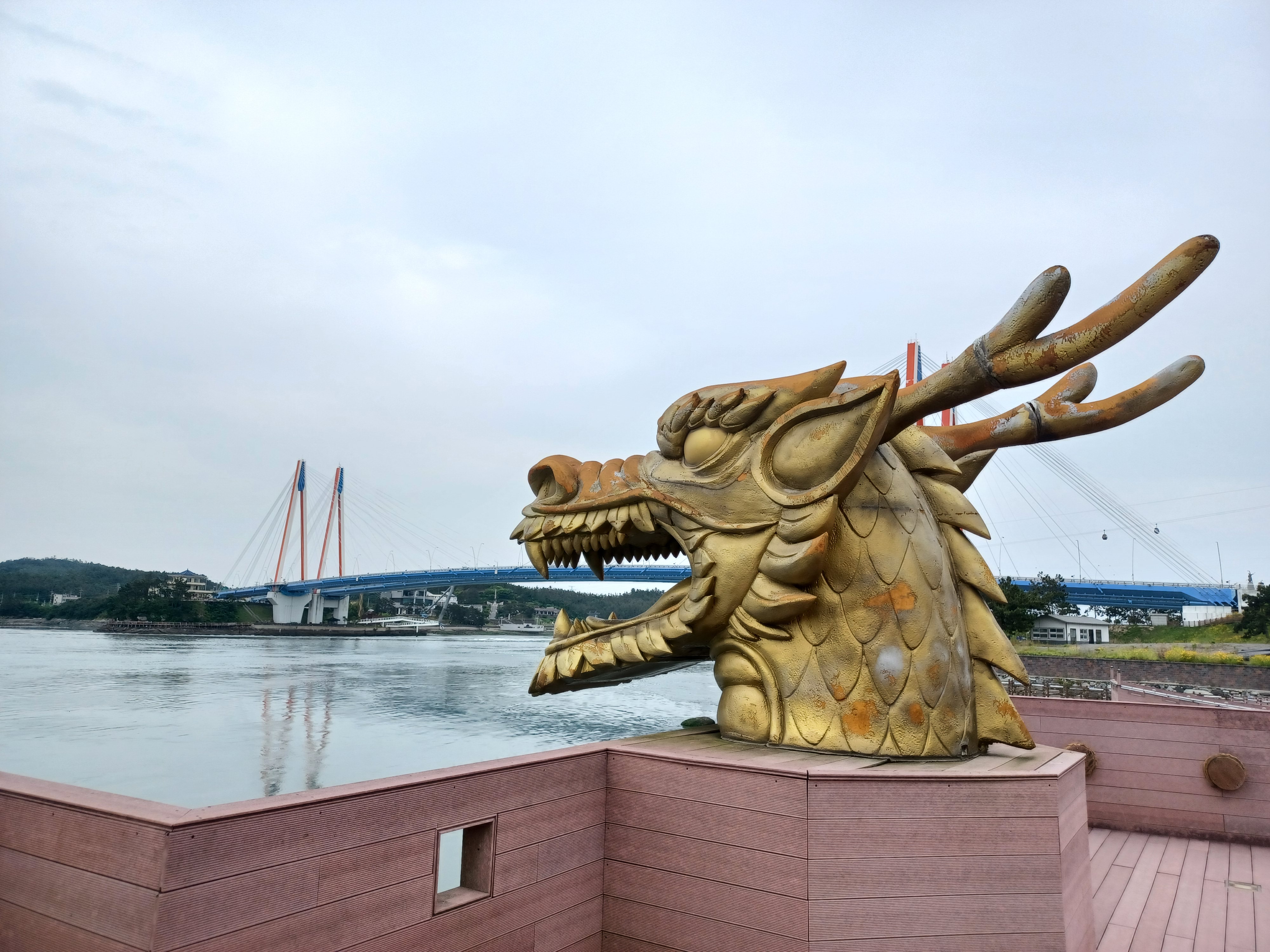 거북선과 판옥선을 모형으로 조성한 해안데크 산책로를 따라 걷는다.