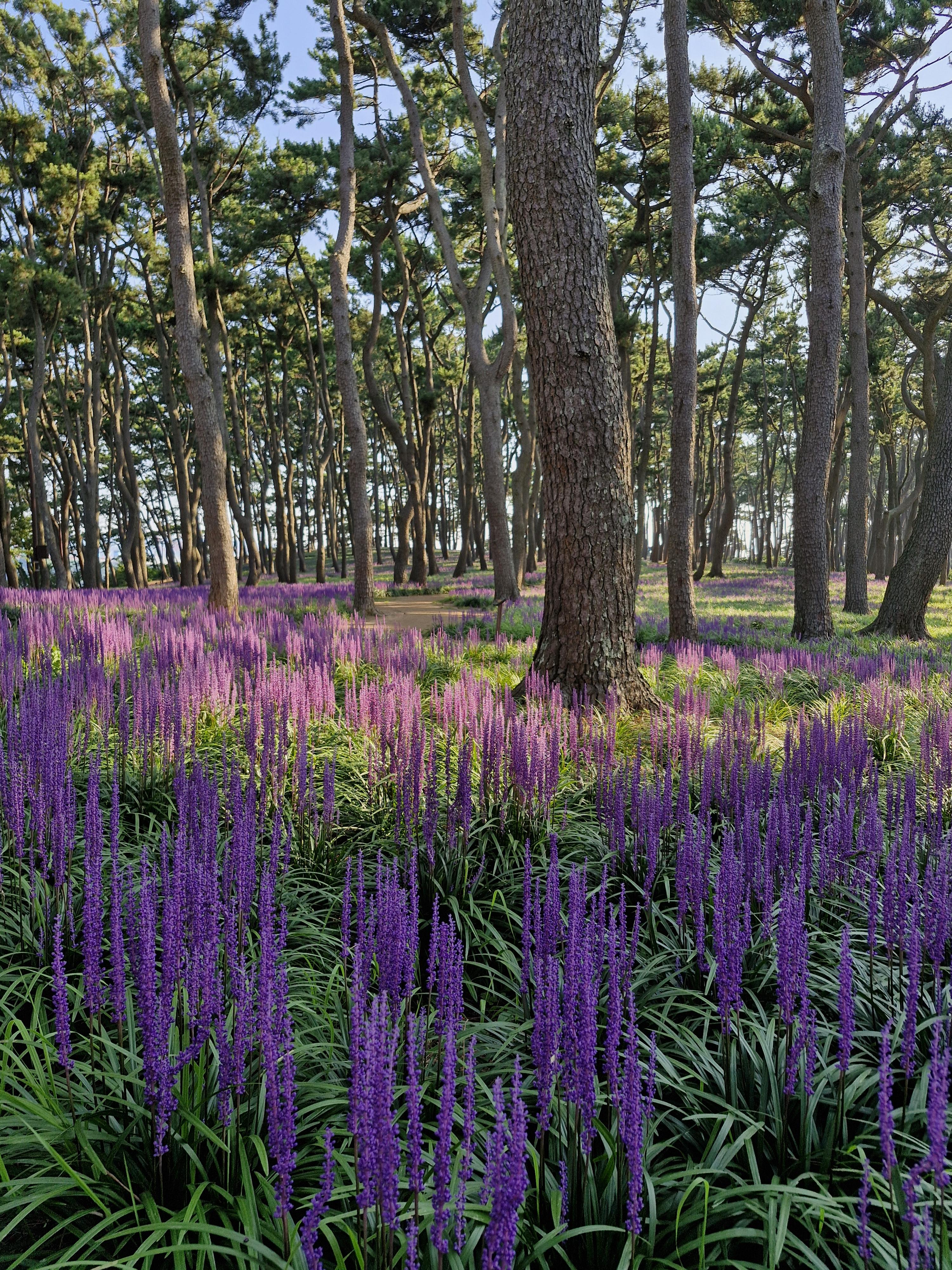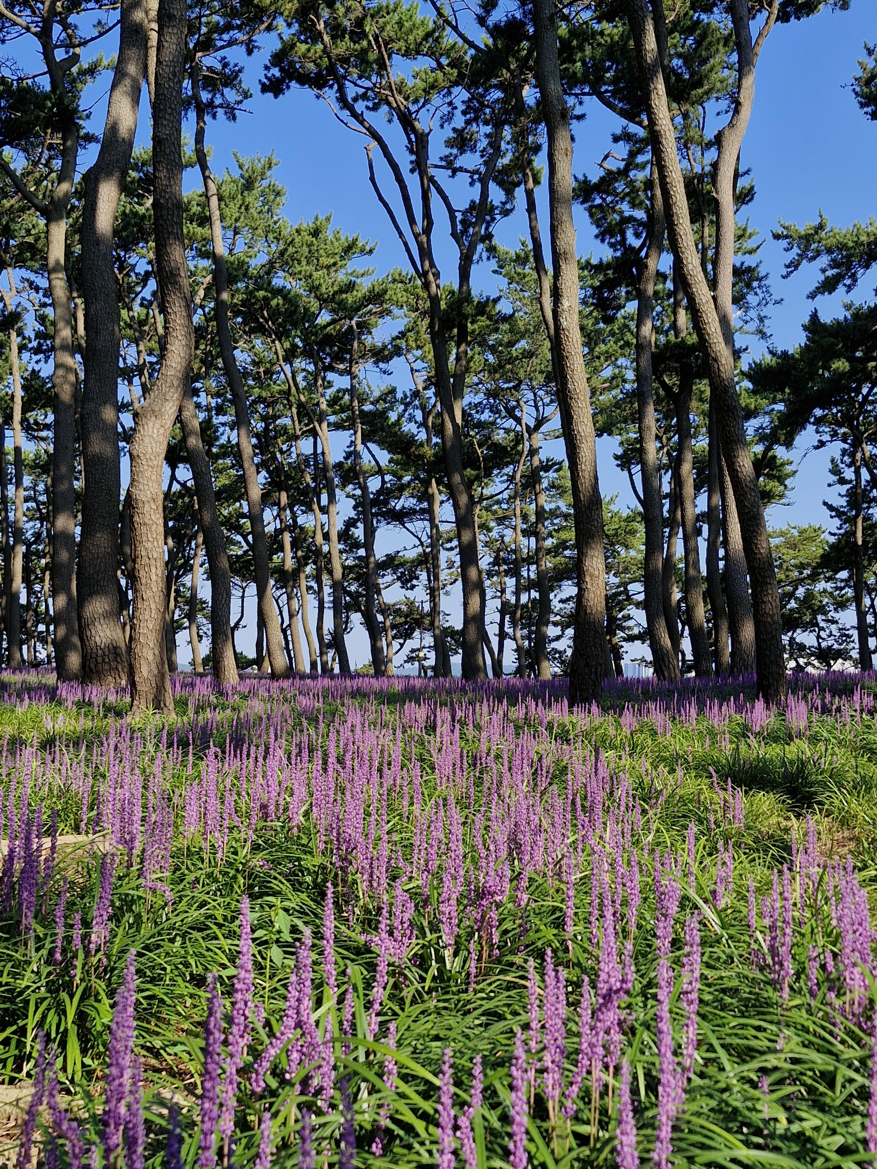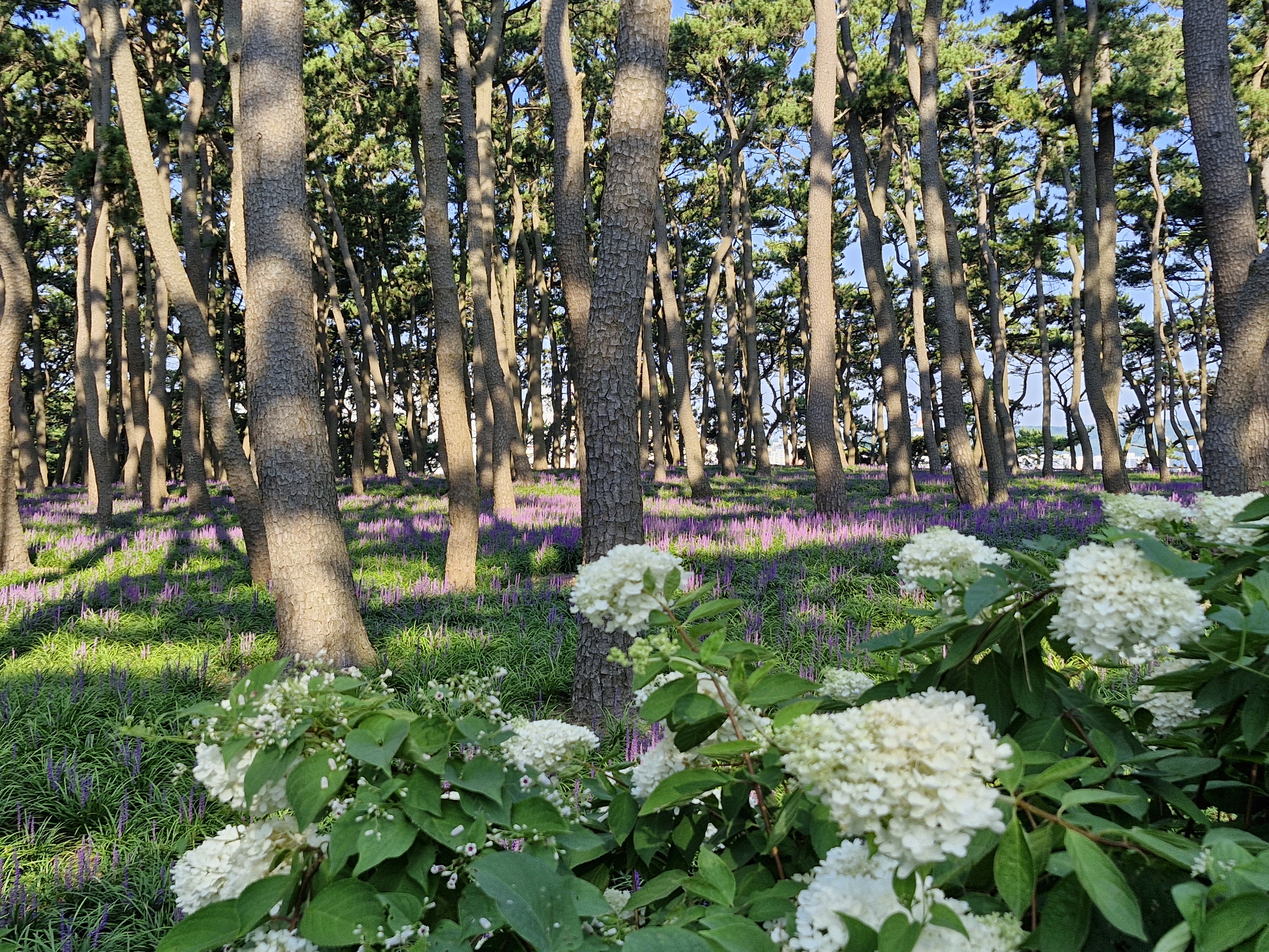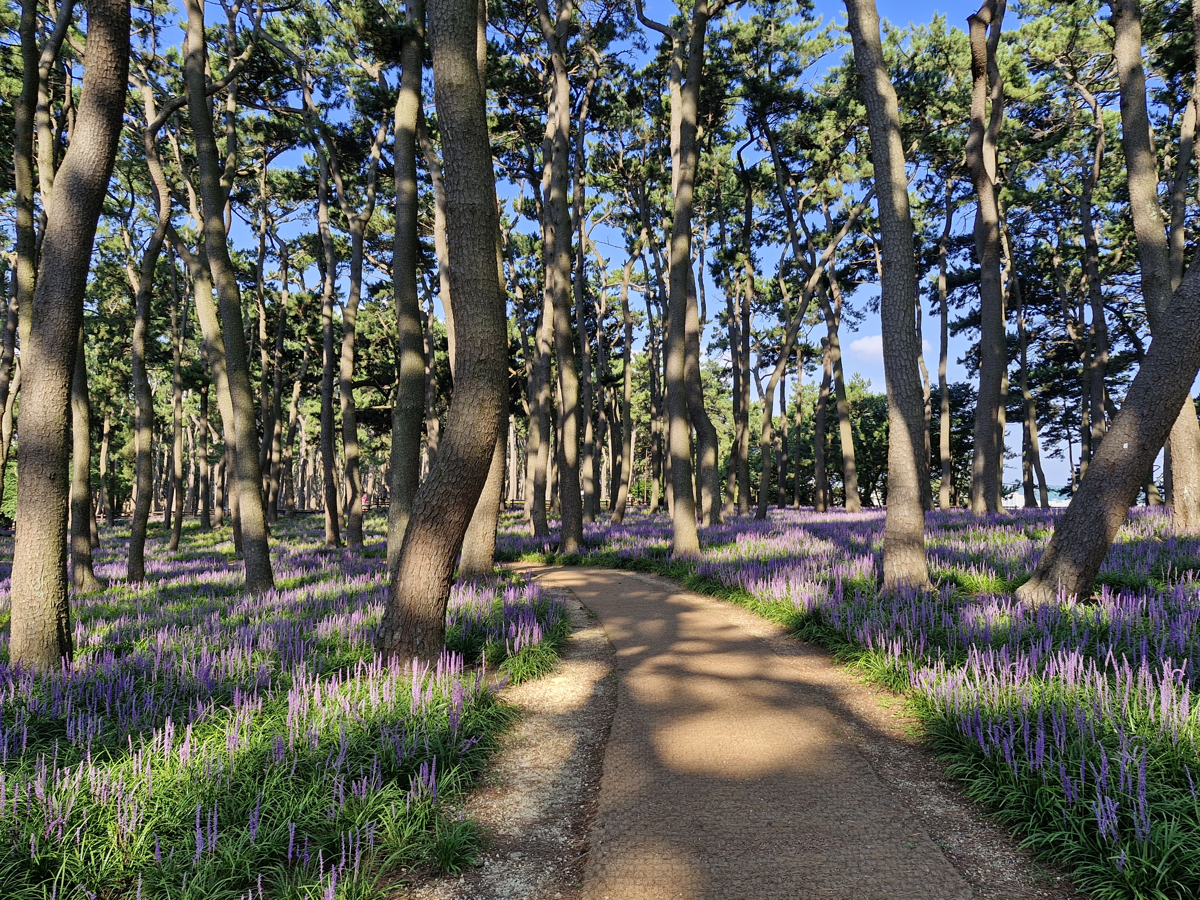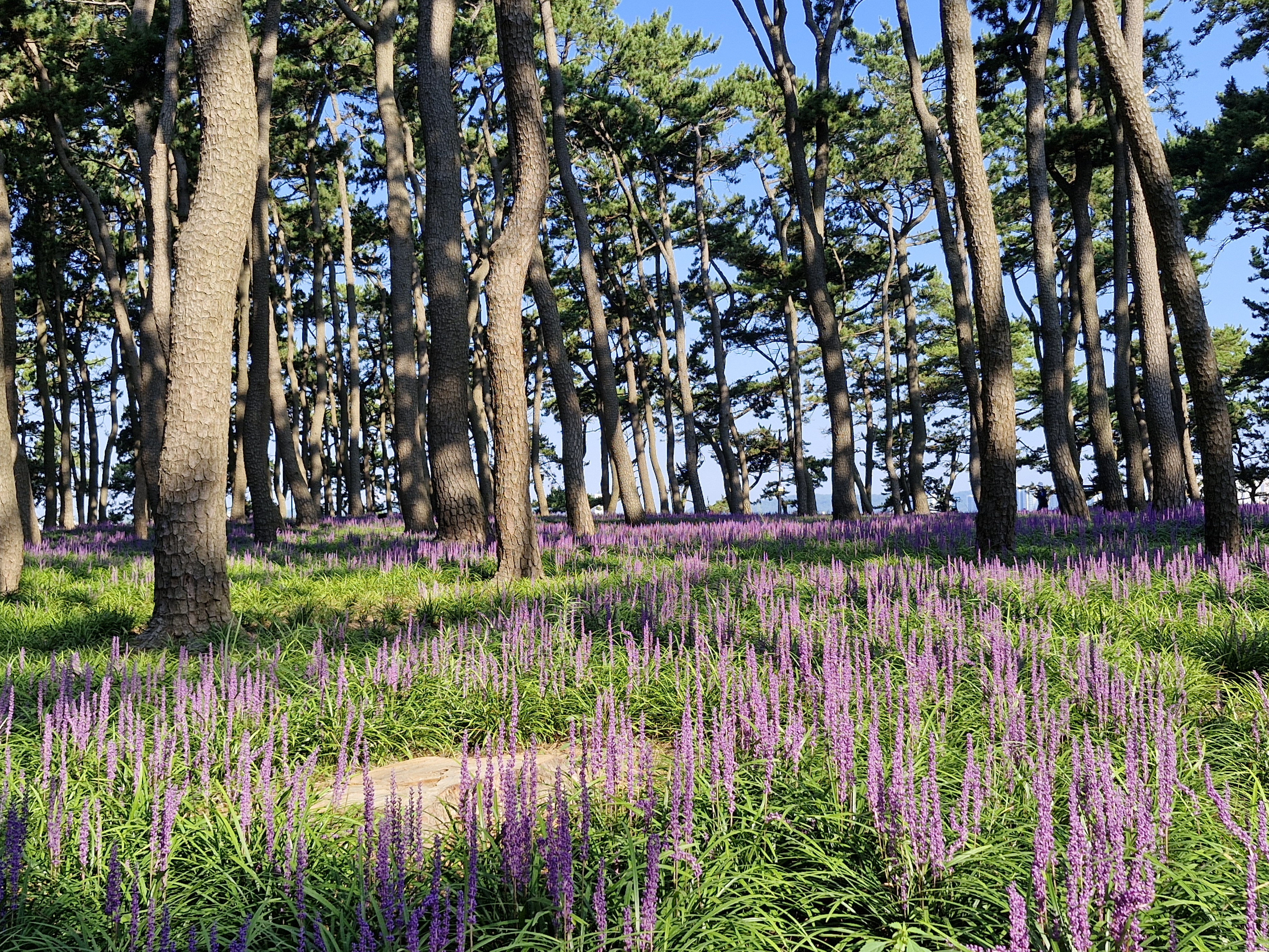 아름드리 해송과 어우러지는 보라색이 너무 이뽀이뽀 😀