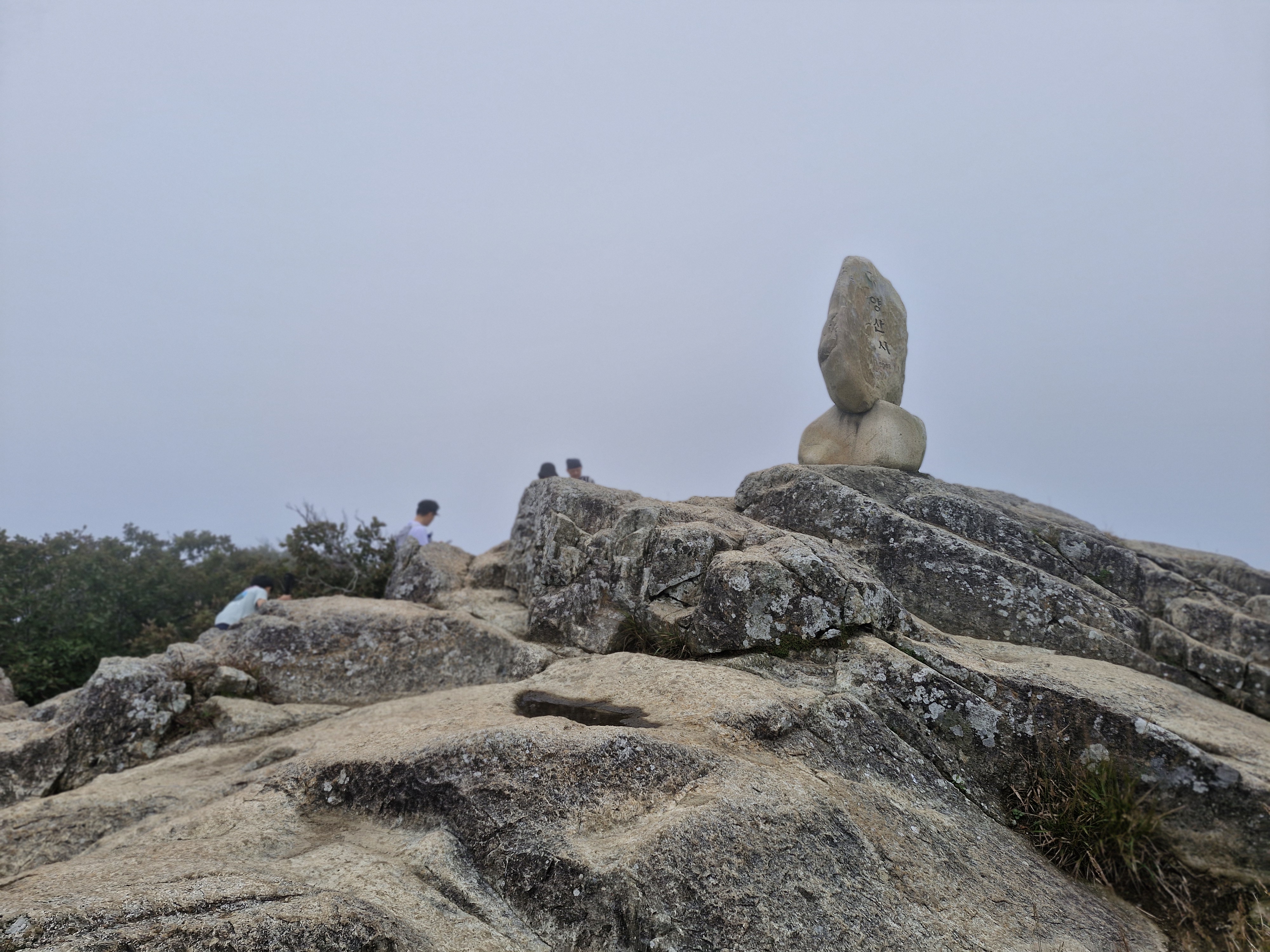 정상석을 중심으로 사방이 짙은 운무에 갇히고 있다.