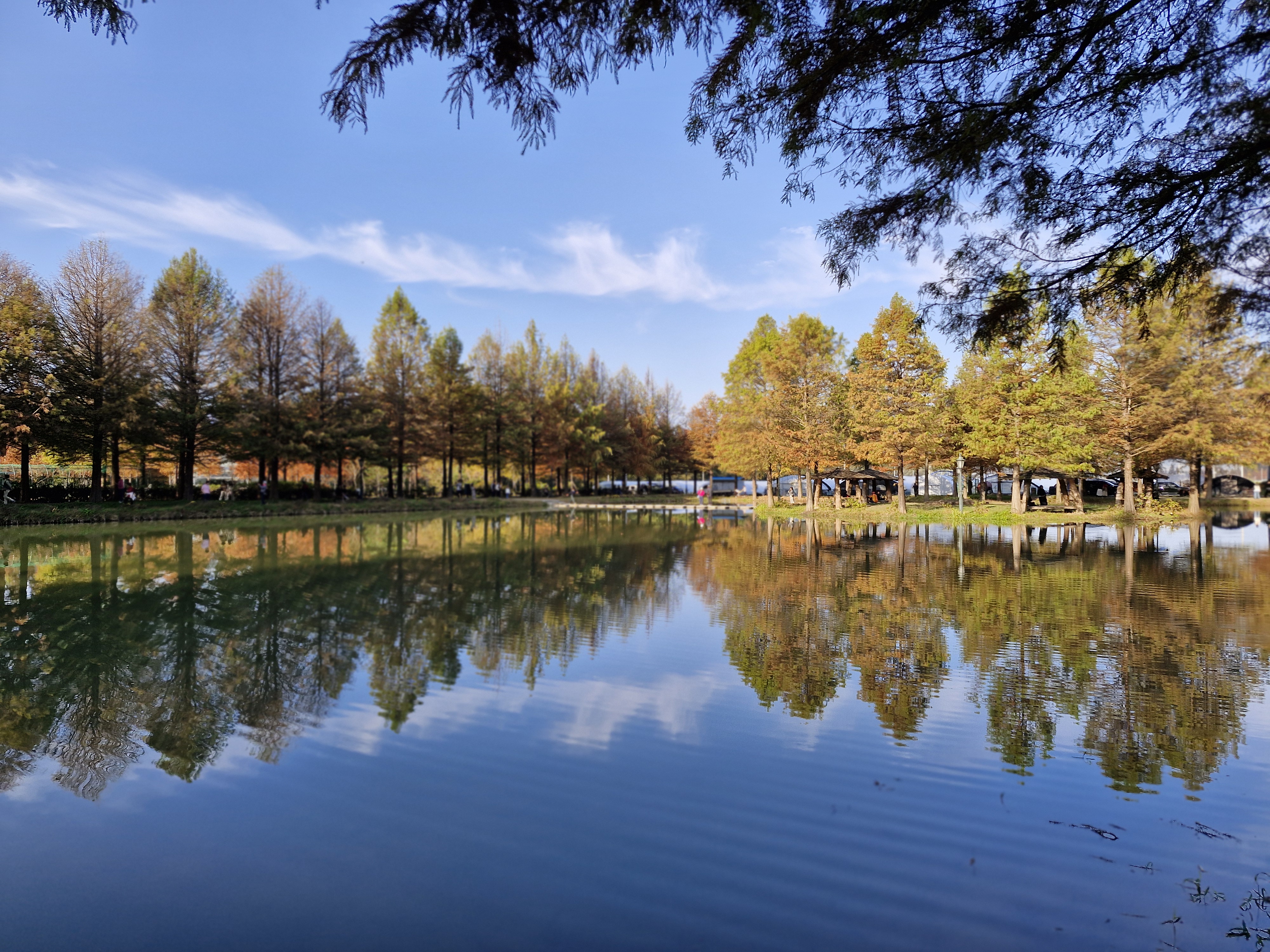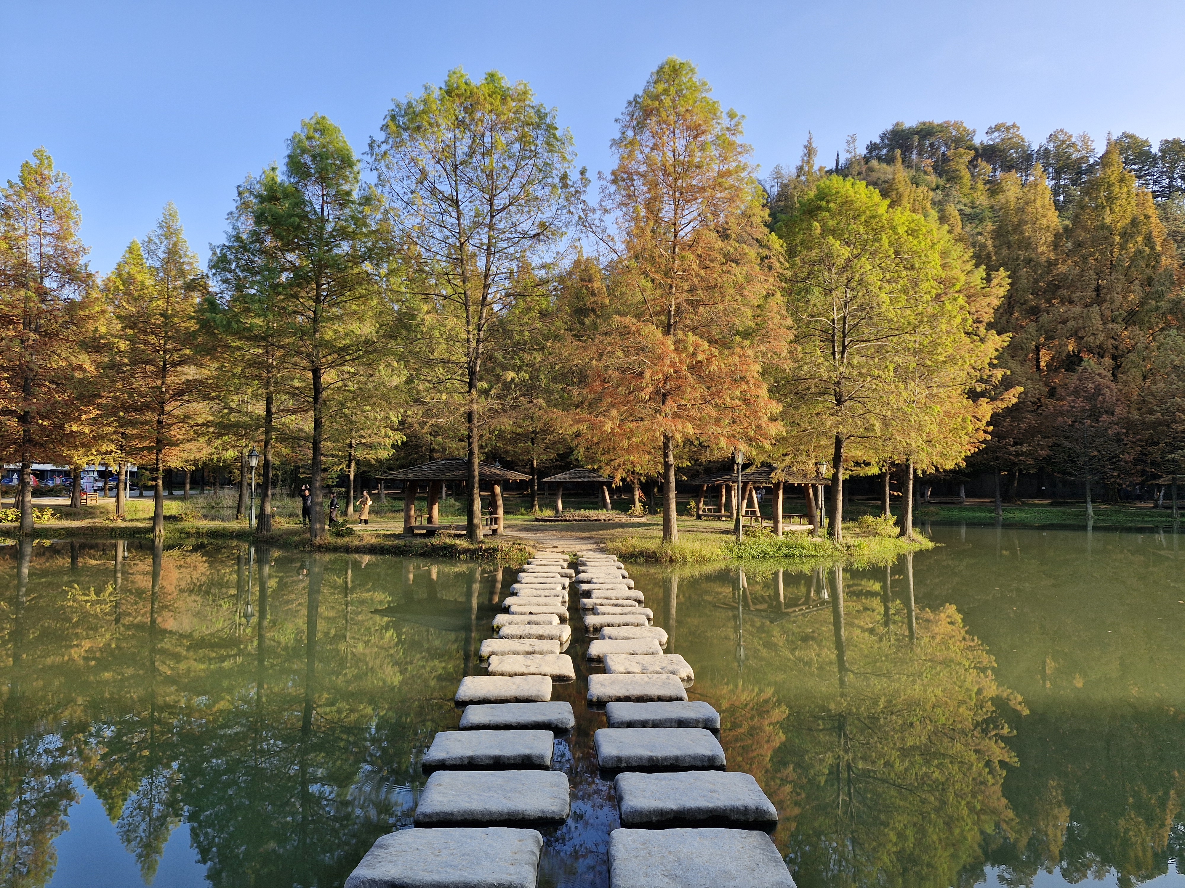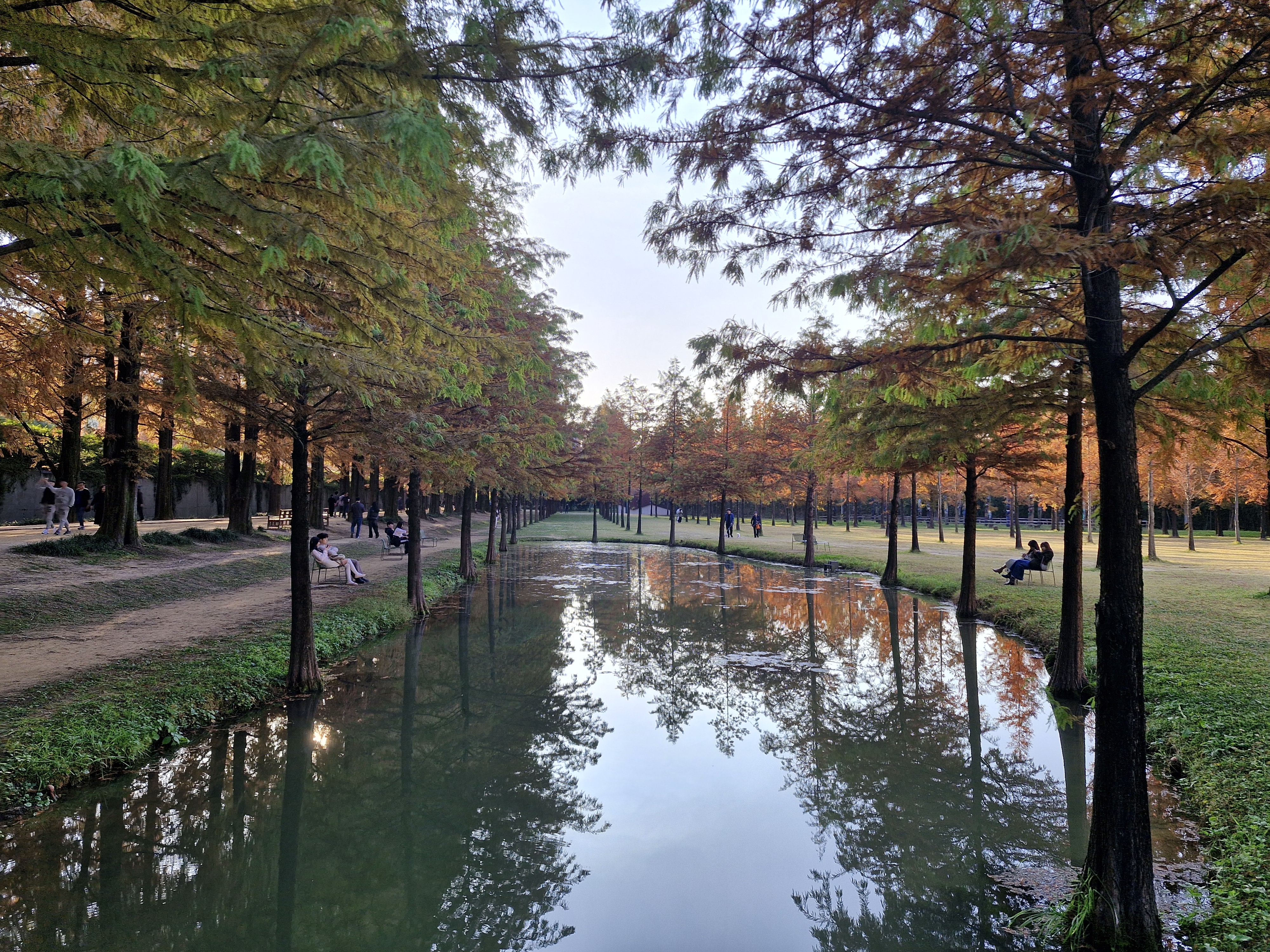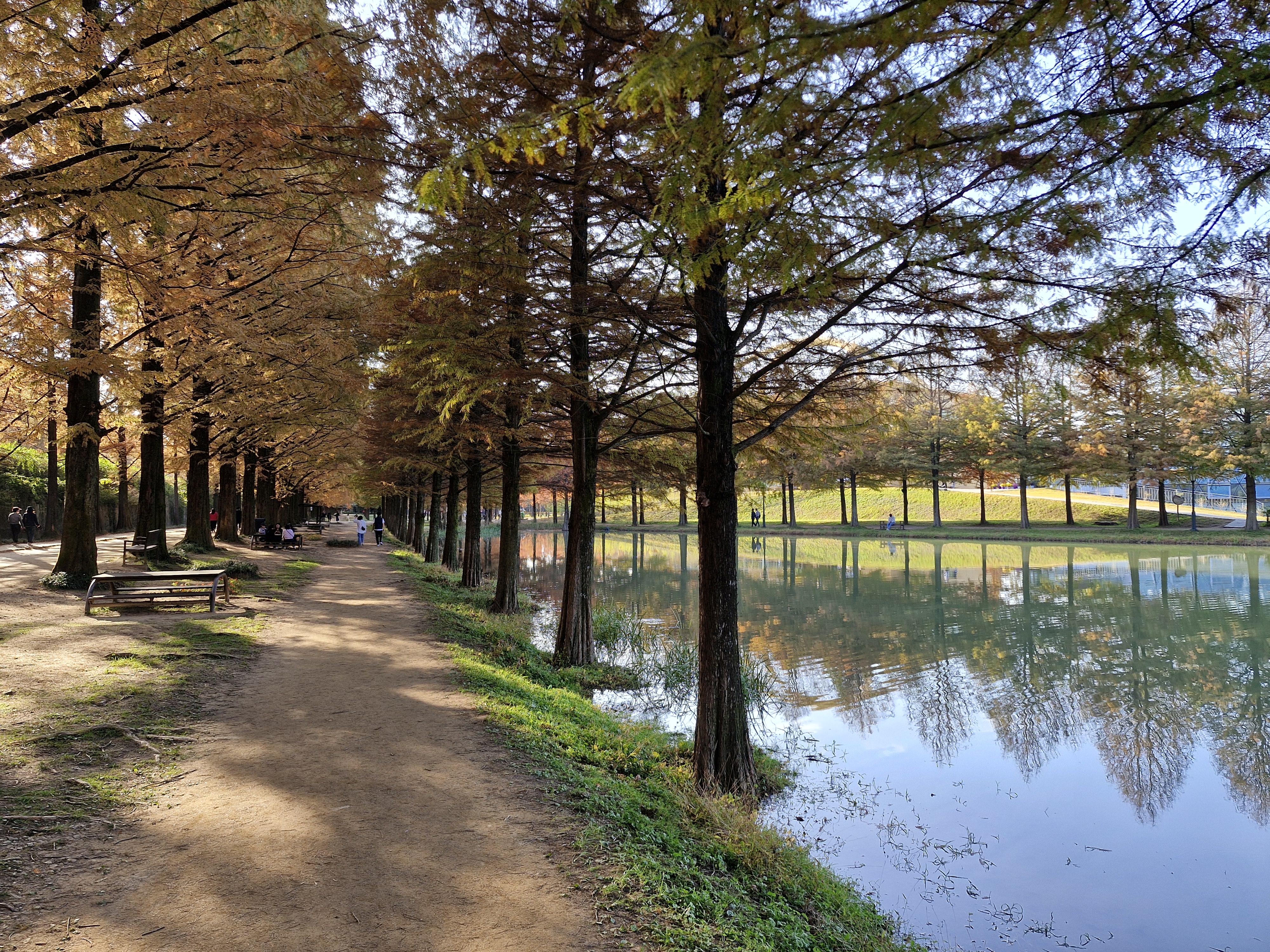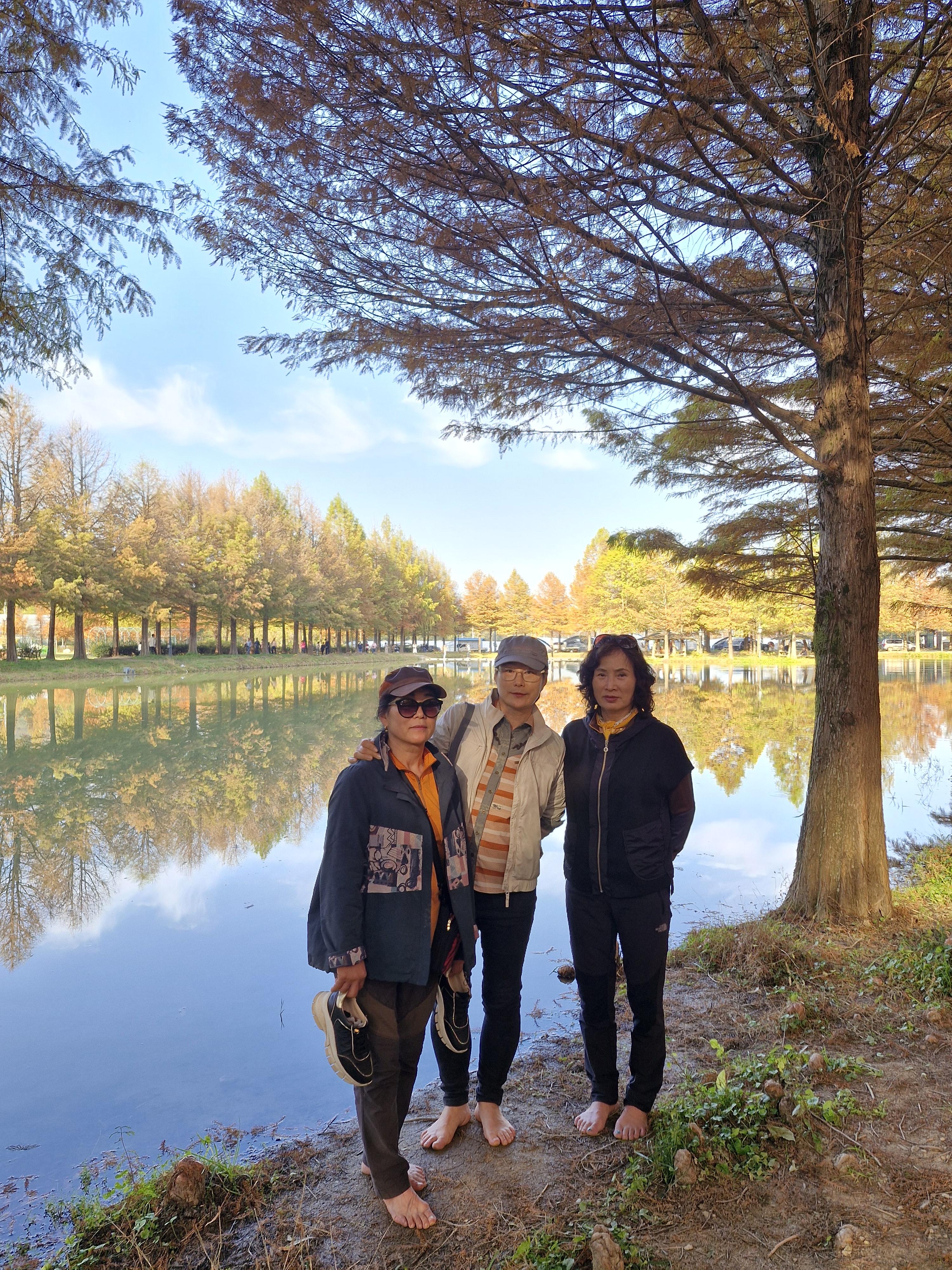 잔잔한 수변에 비치는 메타세쿼이아 반영들이 너무 멋지다.