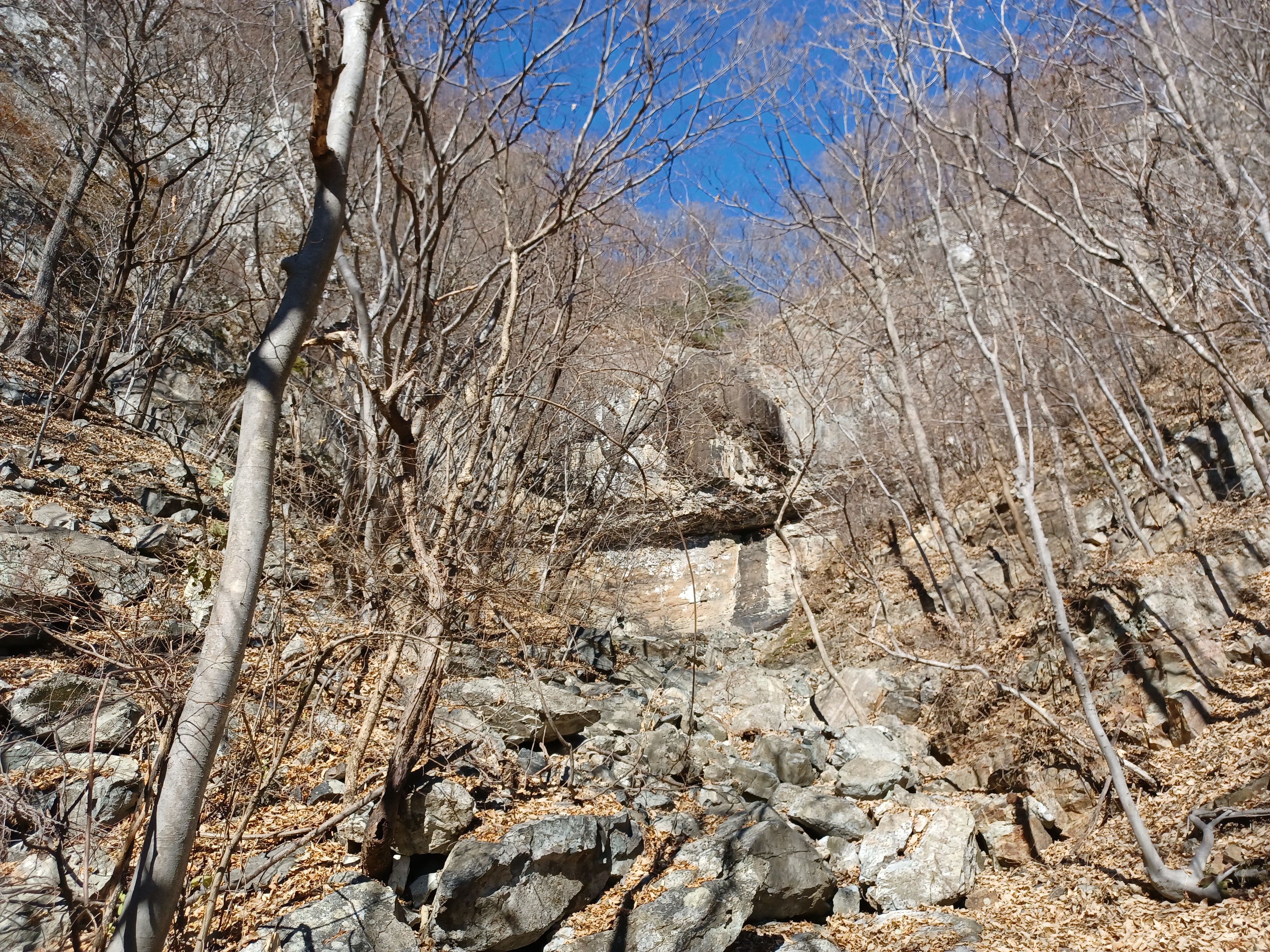 너덜과 낙엽이 범벅이 되어 발아래를 알 수 없으니 여간 조심스럽지 않다.