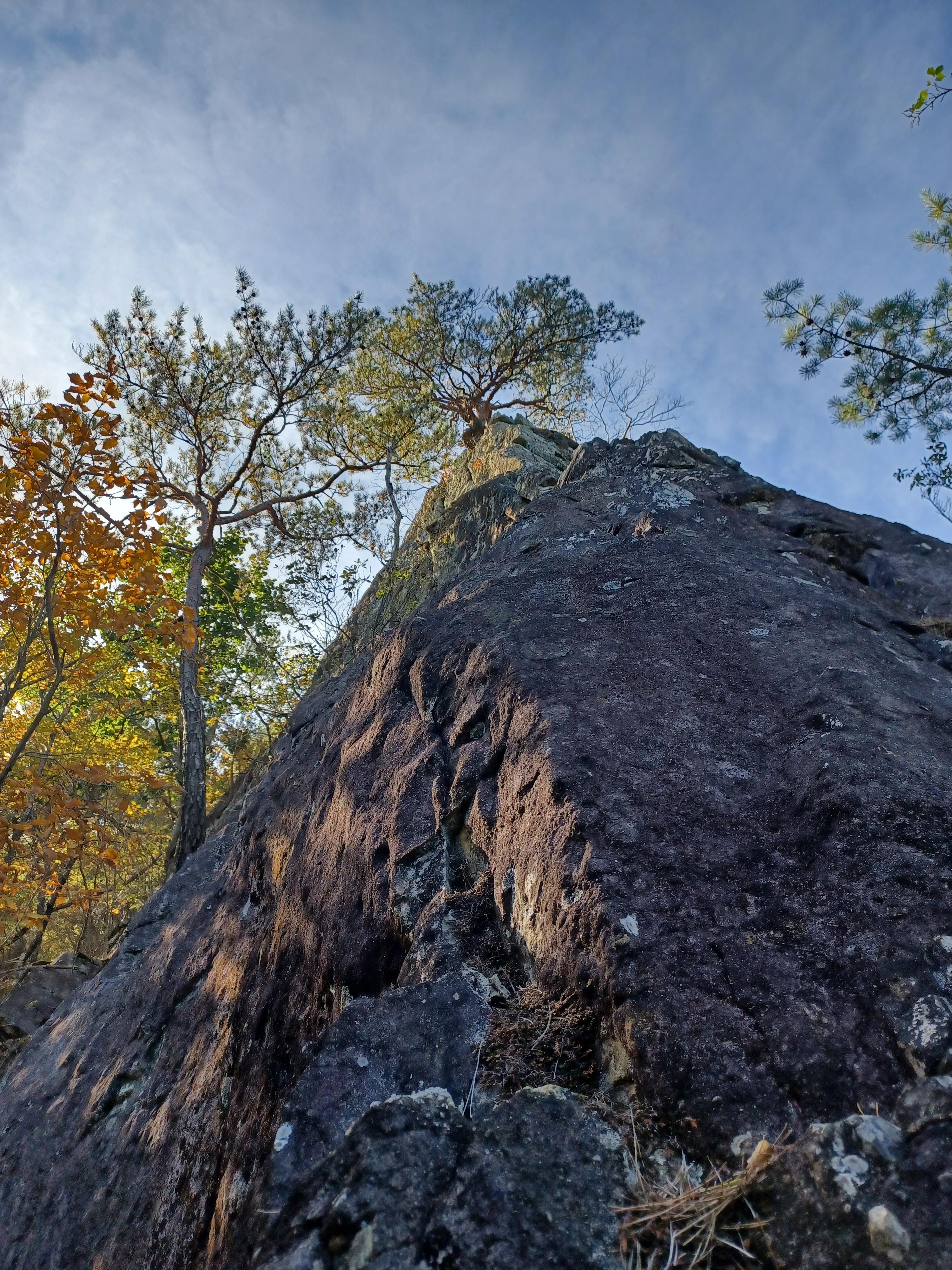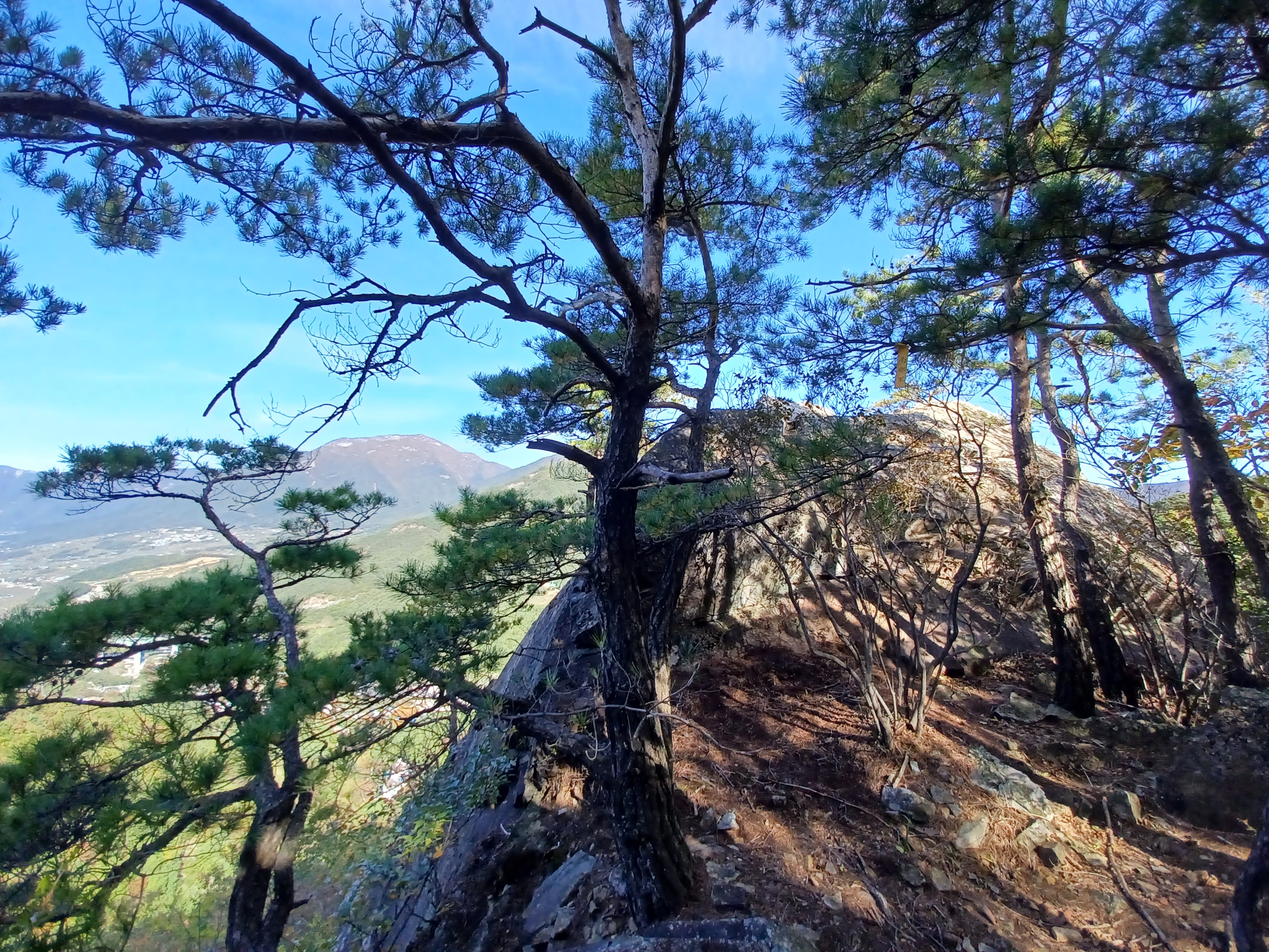 나무사이로 오름길이었던 용 A의 바위들이 눈에 들어오고...