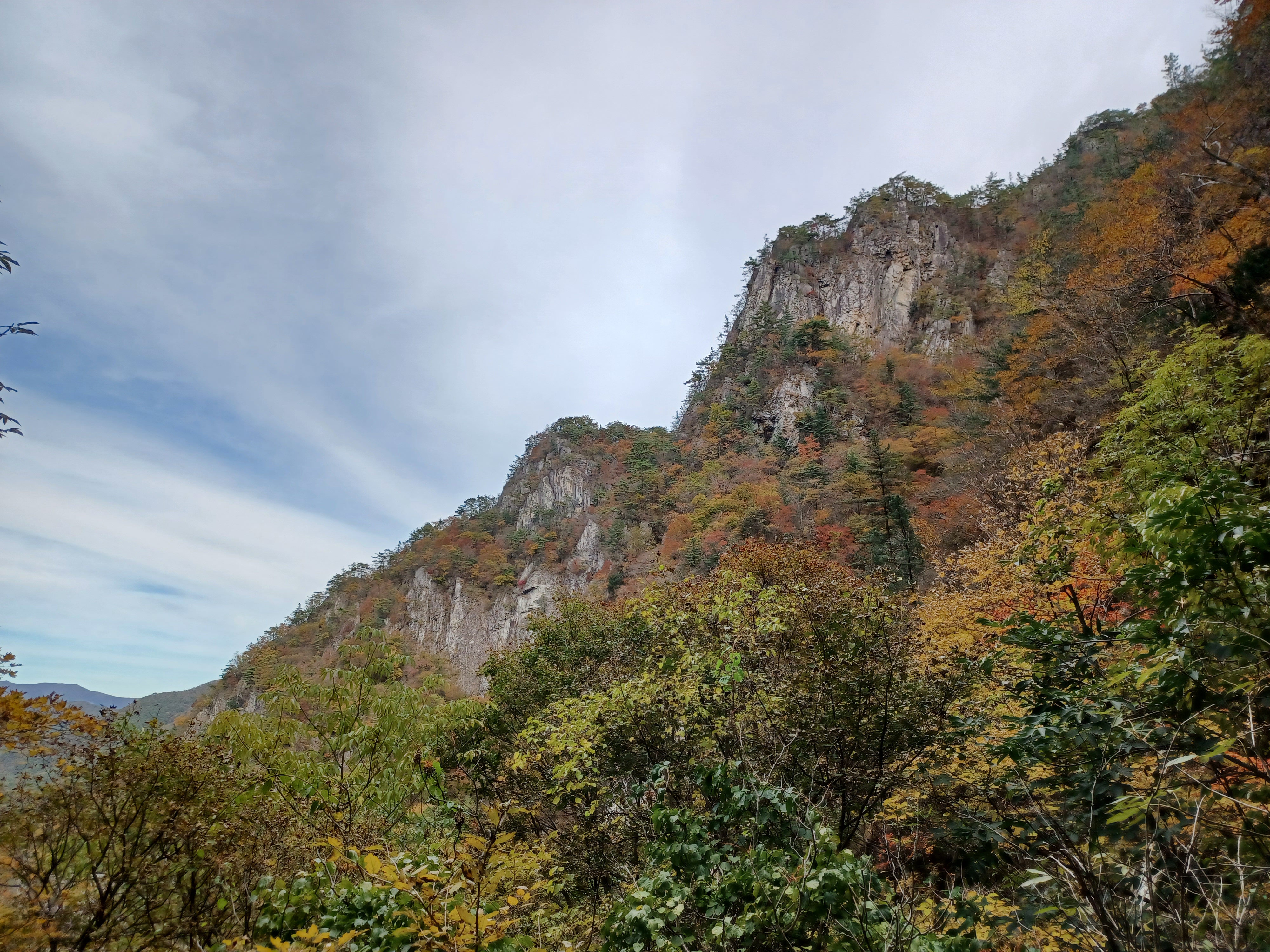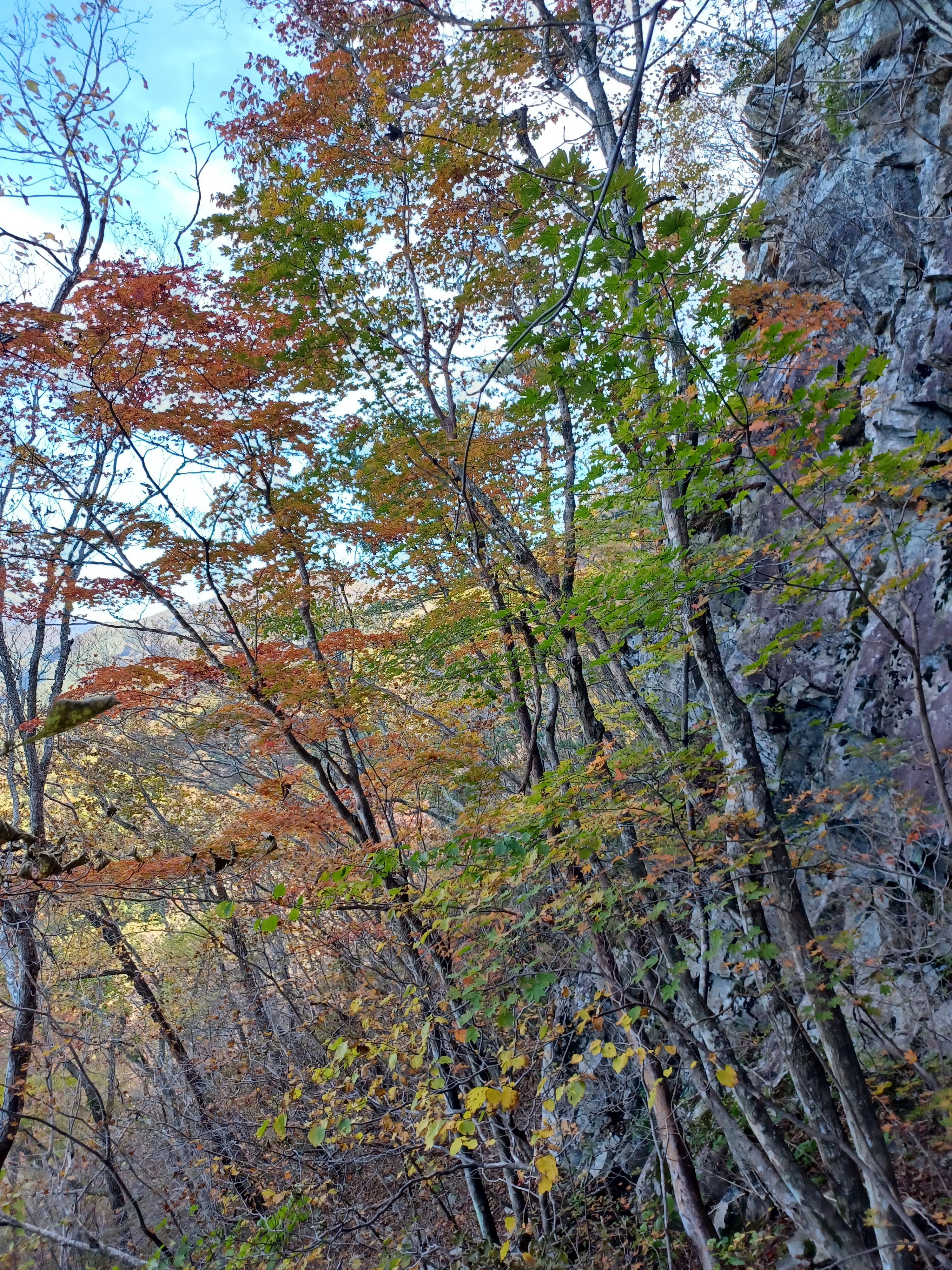 올려다보는 반대편 용아 B 방향에는 붉그레 단풍이 내리고 있다.